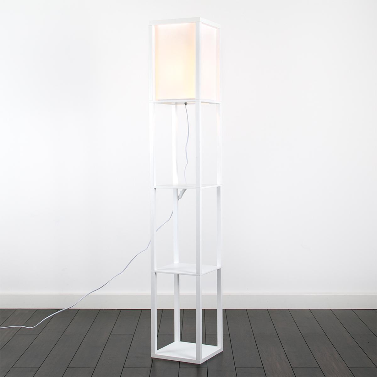Contemporary White Wooden Storage Shelf Floor Lamp With White Fabric Shade - White