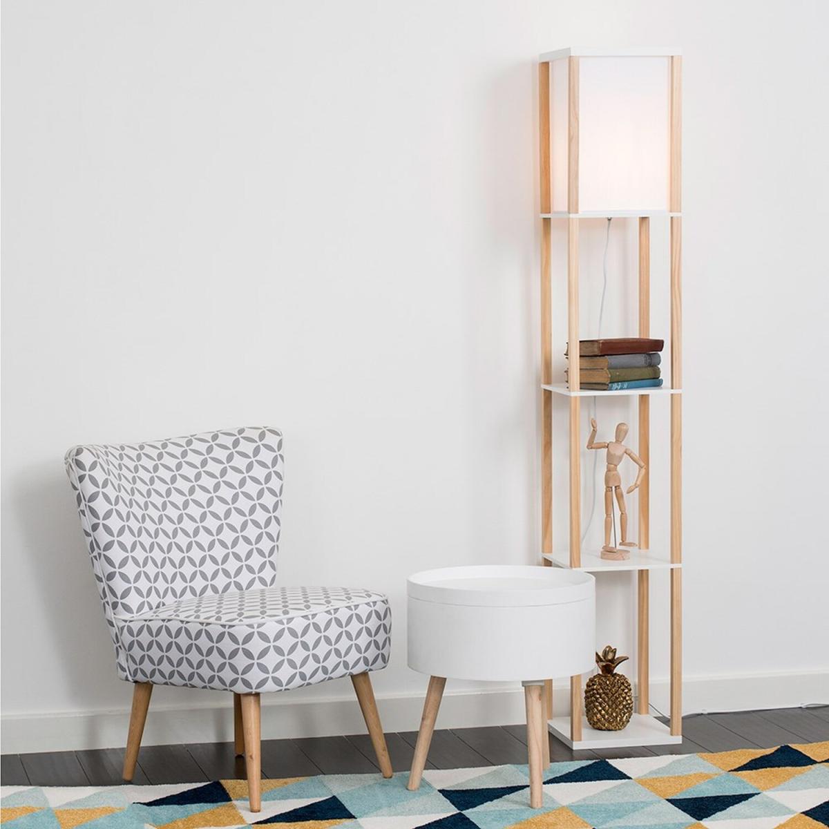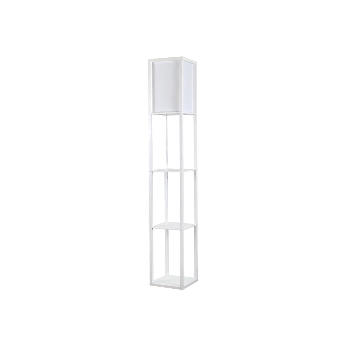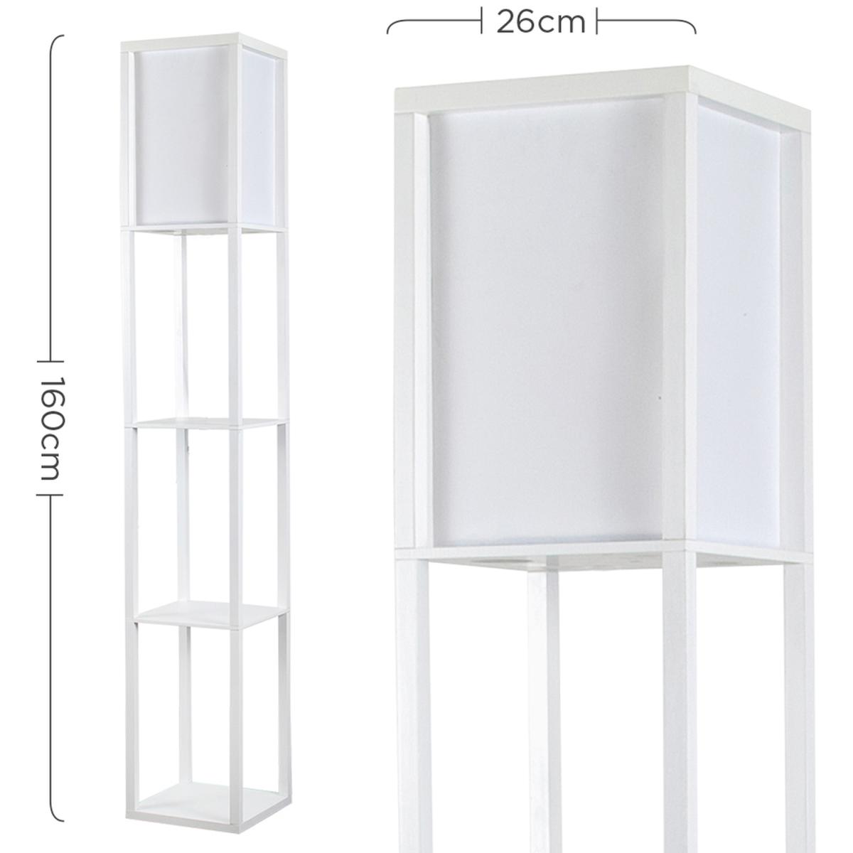 Contemporary floor lamp in a white wooden finish. This unique floor lamp is complete with 3 shelves for storage and display of personal items, they also feature a built in lamp with a white fabric shade which emits a warm, ambient glow to your desired space. Its style matches perfectly with most interior decors. Ideal for lounges, hallways, bedrooms and other living areas. Please NOTE This product requires self assembly.