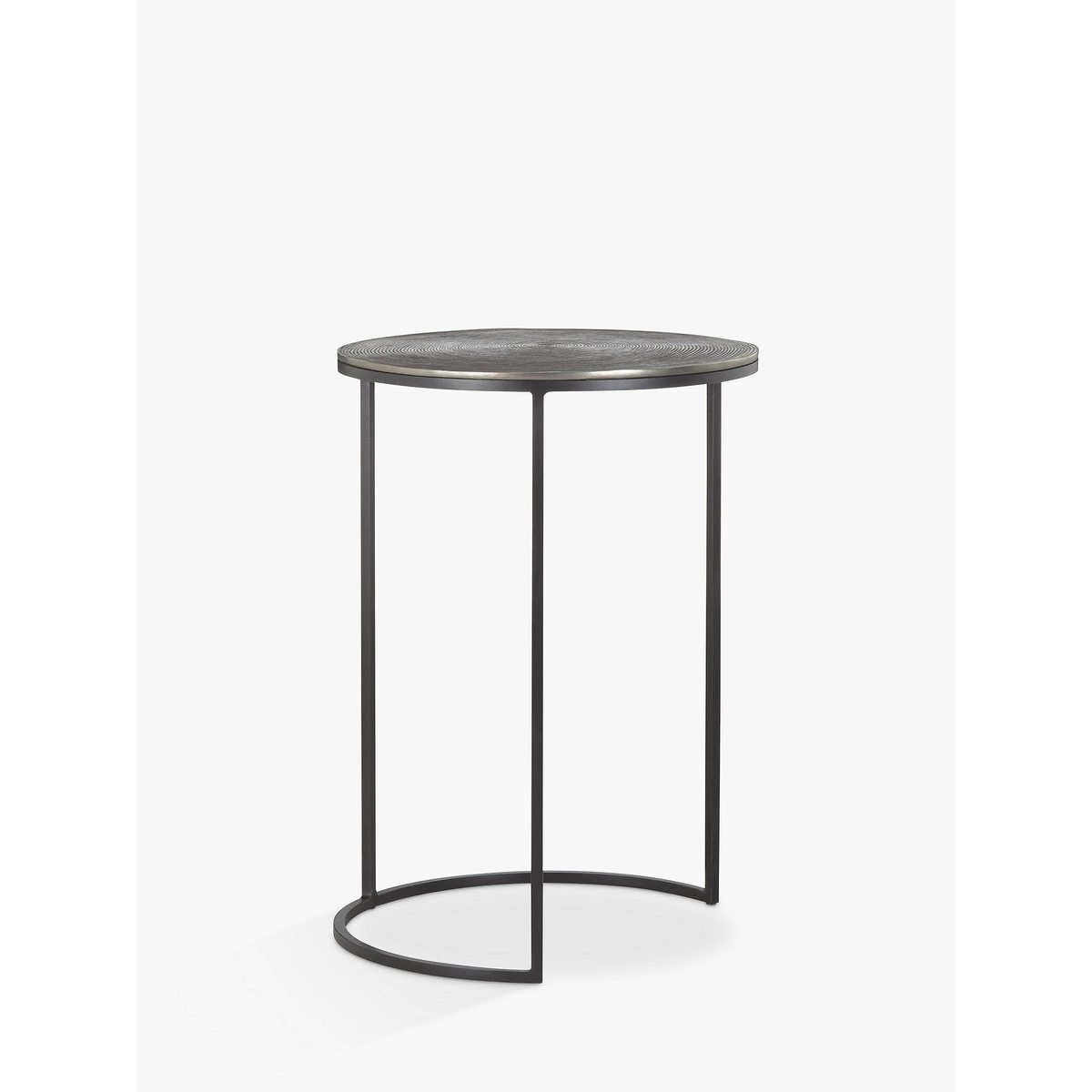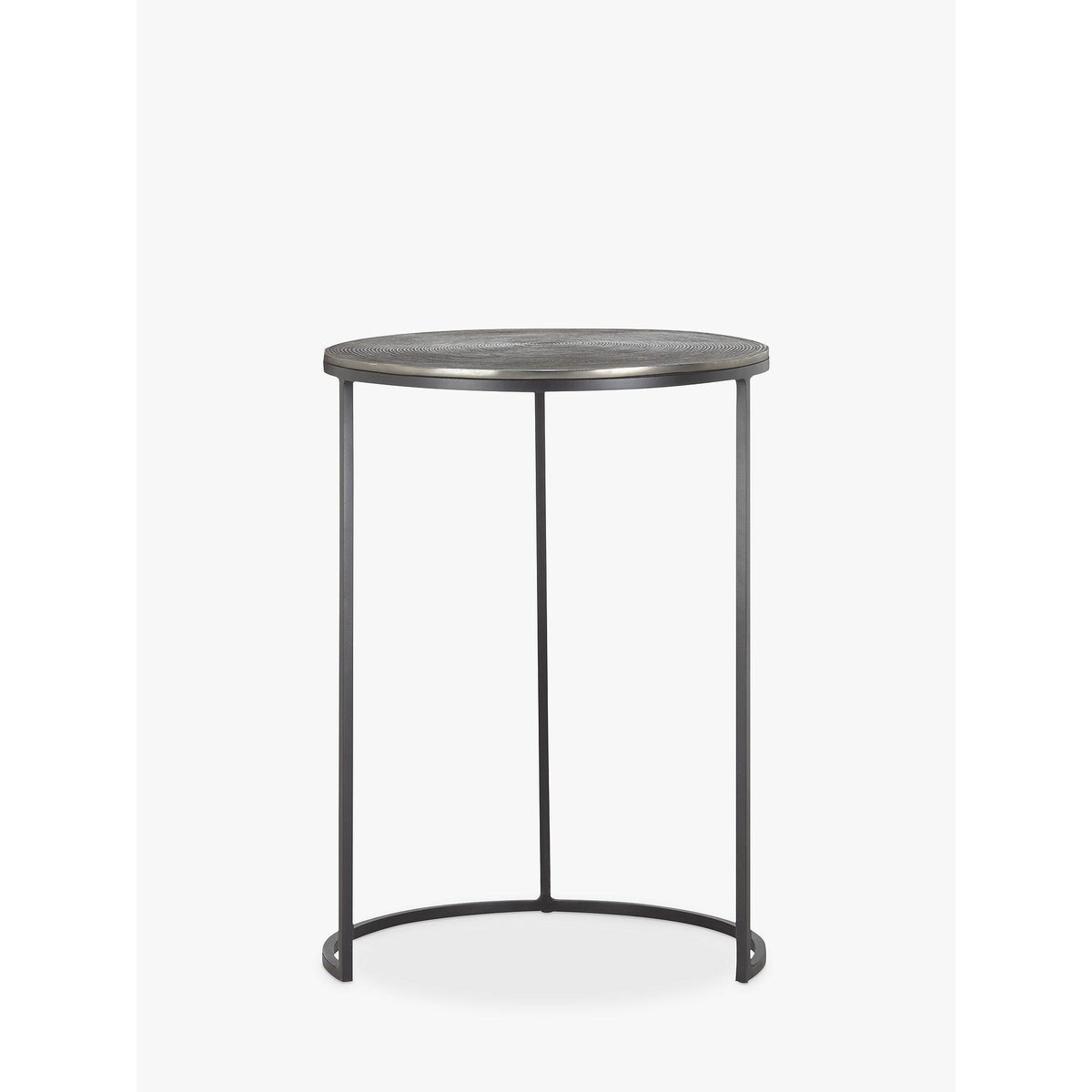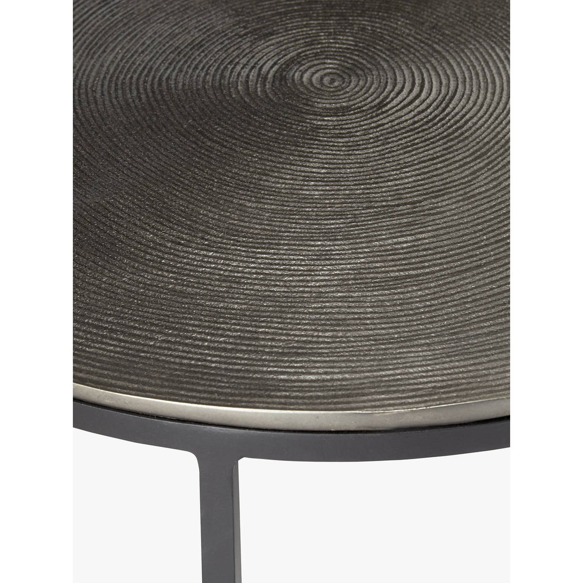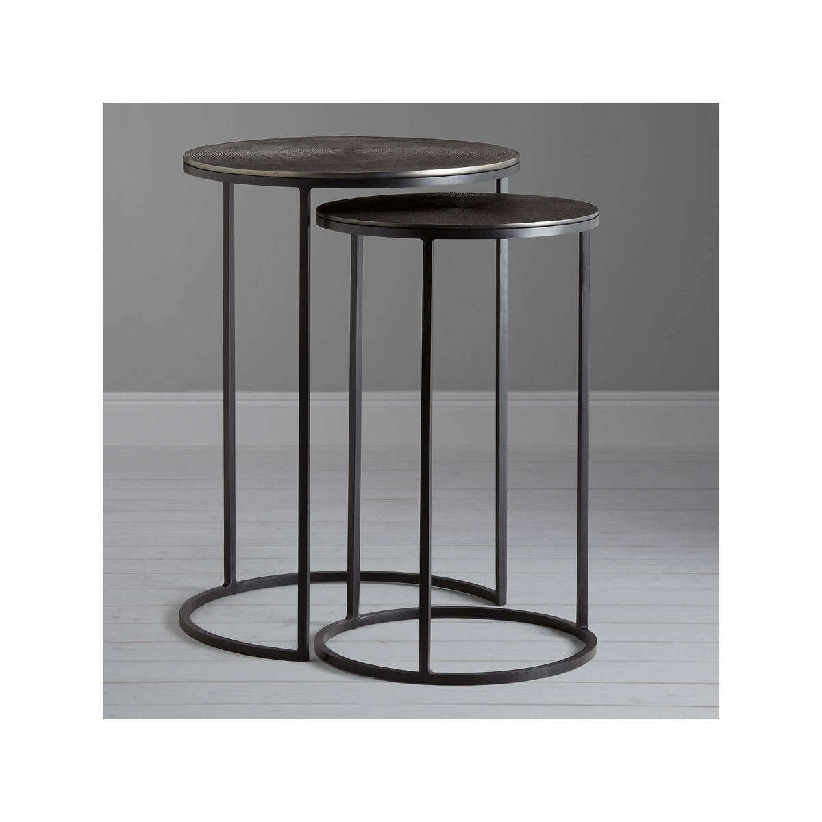 These stylish round tables nest easily together to provide a sleek space saving solution, with plenty of aesthetic appeal. Each aluminium table top features a different hand-crafted design: the larger table offers an attractive ripple effect, while the smaller lends a more linear pattern beginning at the centre and working outwards. A solid iron leg frame provides durability and its striking cylindrical shape, making this nest a long-lasting, statement piece for your living space.