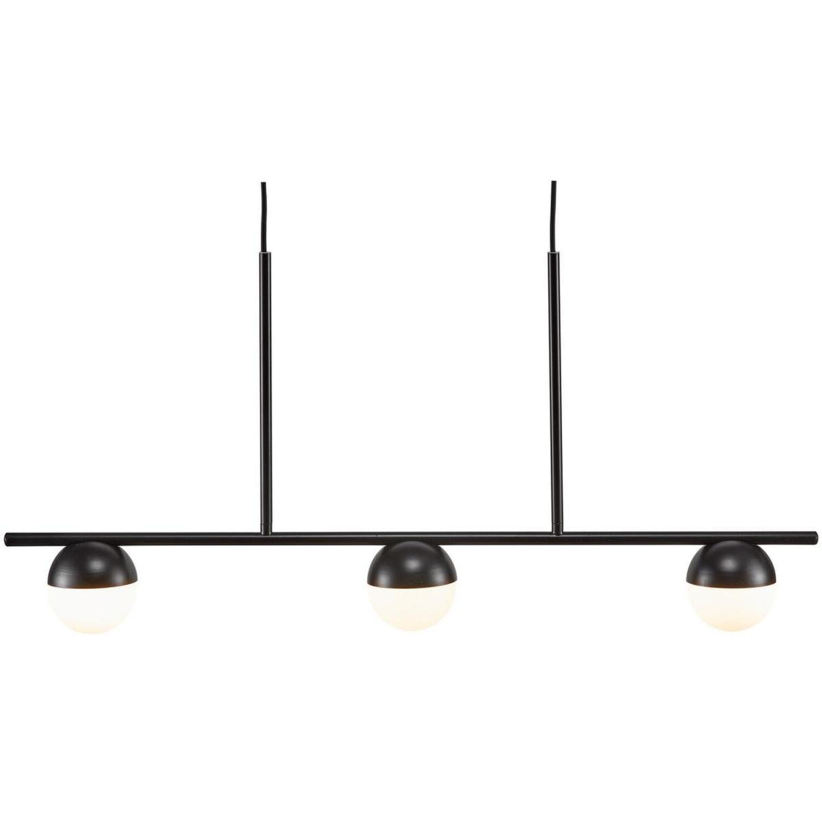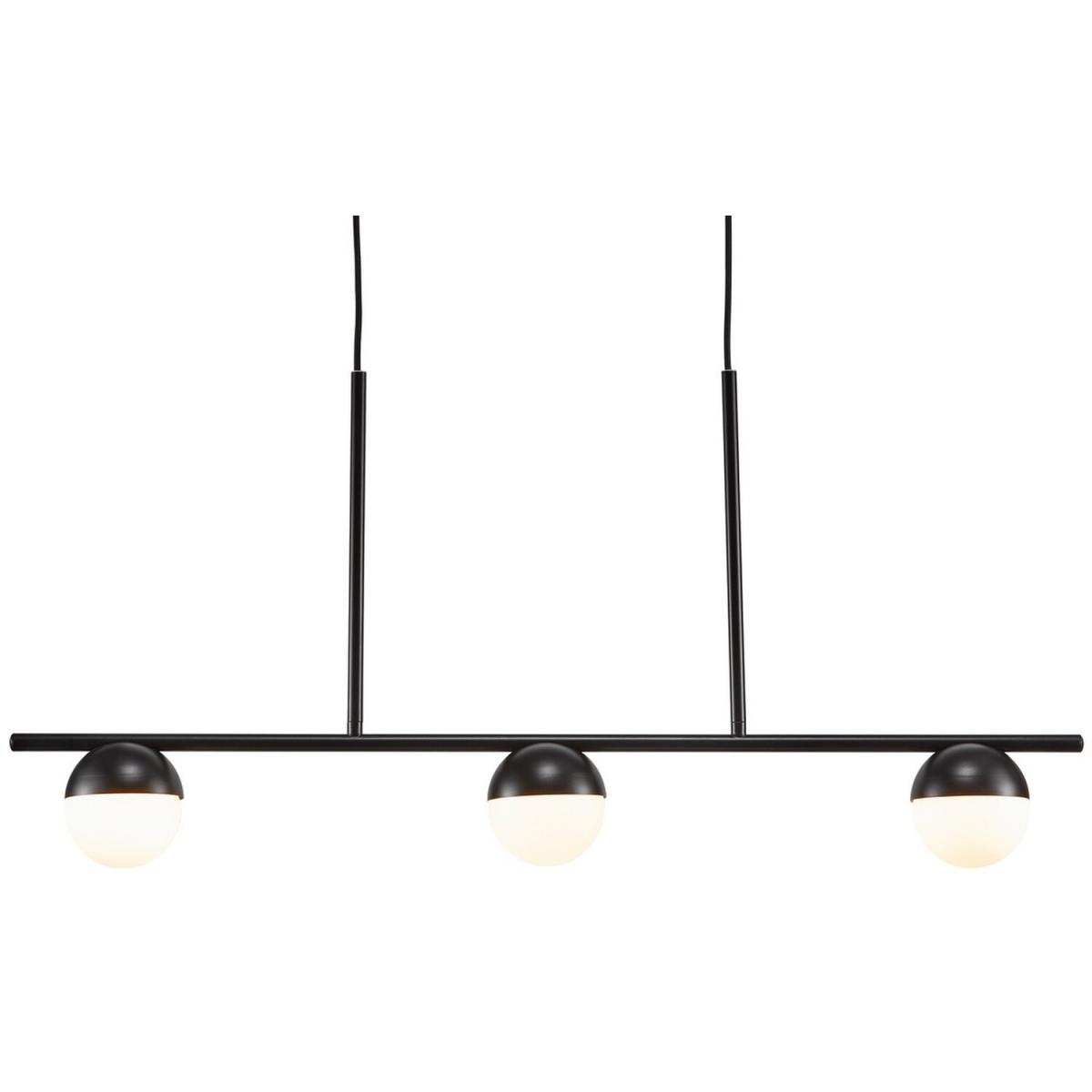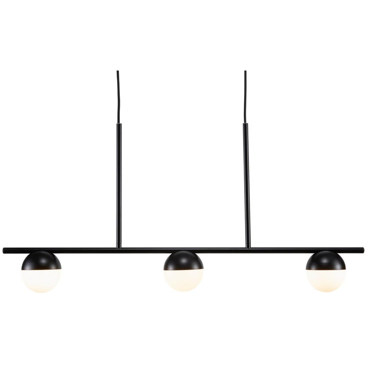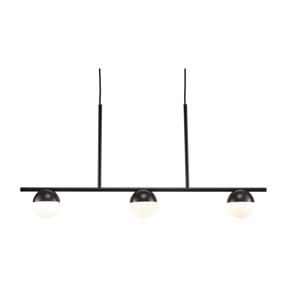 Contemporary art deco style. Matte white opal mouth blown glass. Three lamp heads that emits a practical light, Sleek and modern the Contina Black Straight Bar Pendant Light has 3 lights to add warm light to your space. Its contemporary art deco style features elegant mouth-blown glass in matte white opal to emit practical and beautiful light for any setting.