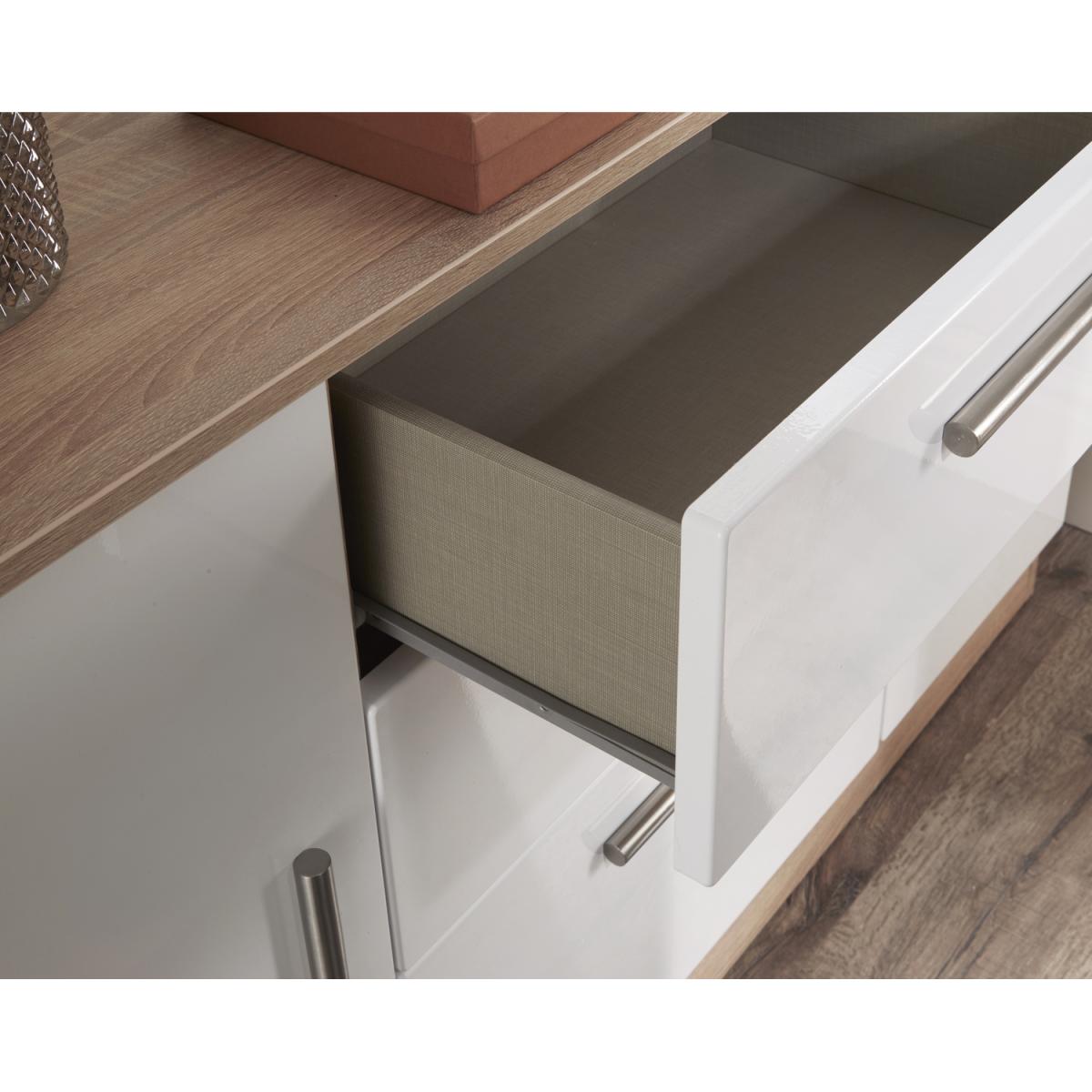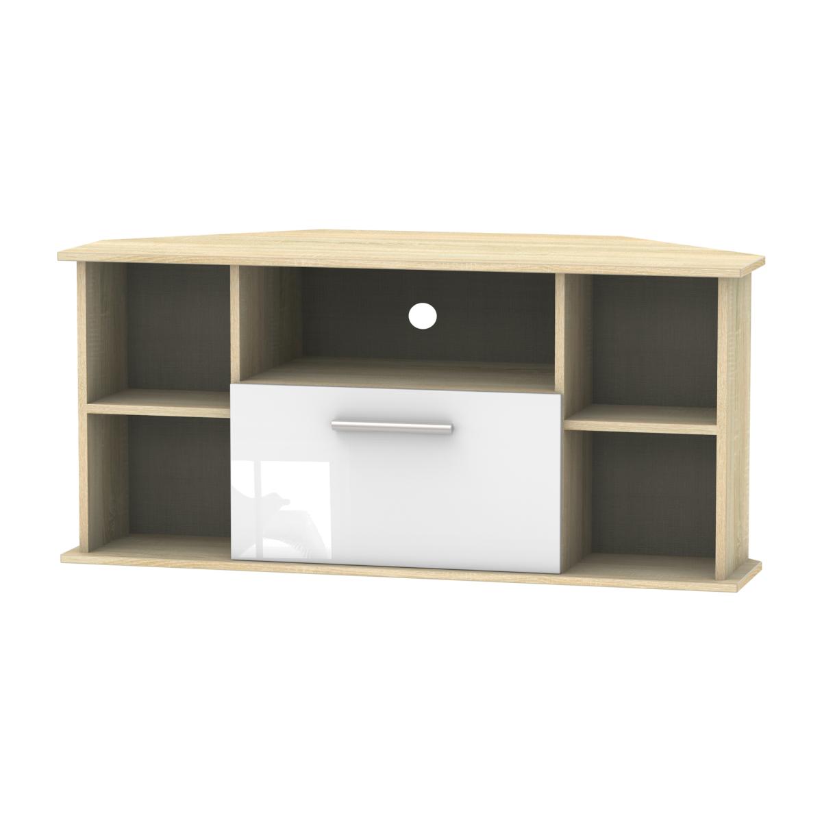 This TV Corner unit features plenty of open shelving and a central storage drawer and will support a flat screen TV of up to 50". Create your dream bedroom with our exclusive Contrast range. This range enhances the beauty of any bedroom style. This range is made up of high-quality materials long-lasting finishes. The fronts are complemented by sleek designer-style metal handles and when you open the drawers, you'll notice the smooth metal runners and linen-look interior. All our furniture is made in the United Kingdom, to the highest quality. It is delivered direct to your location of choice by one of our two man delivery teams, and come full assembled (although legs may be removed to prevent damage in transit).