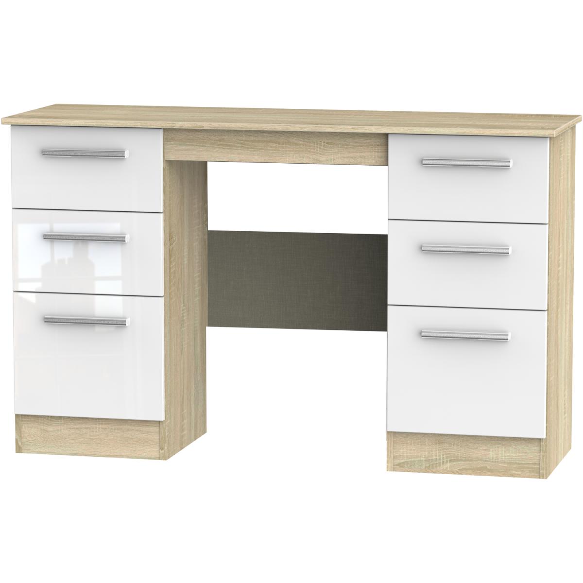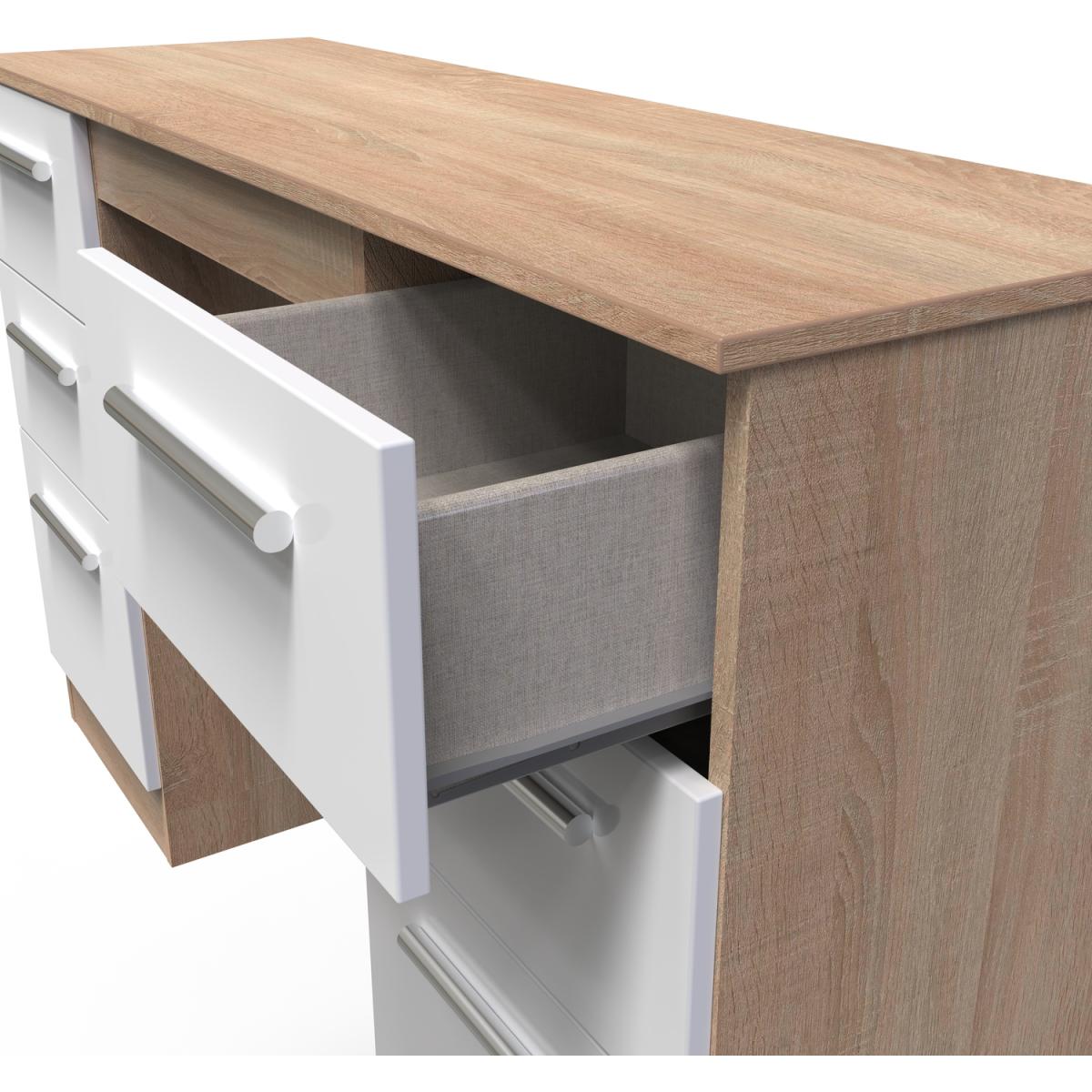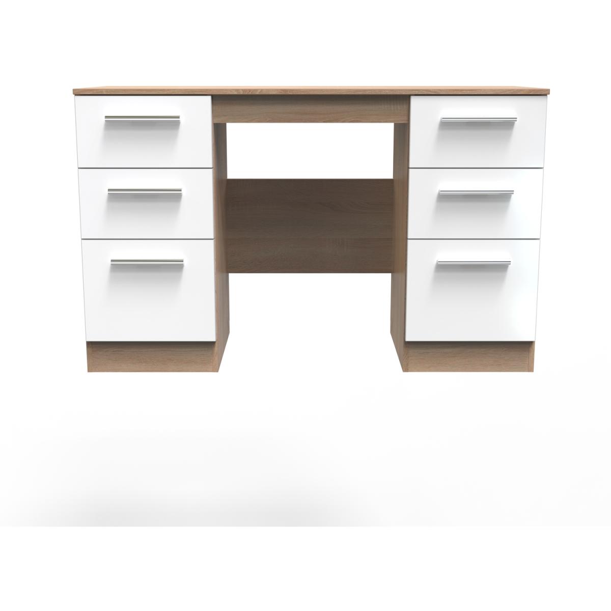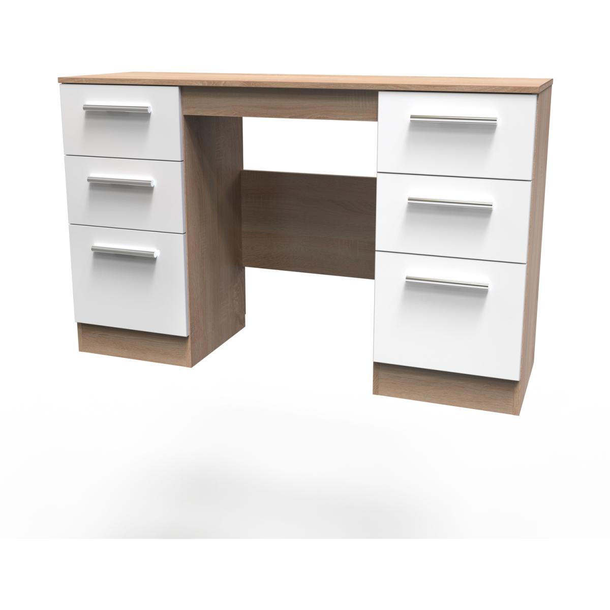 This practical 6 drawer kneehole deskvanity is perfect for any bedroom or office. A matching stool and mirror (in 2 sizes) are also available. Create your dream bedroom with our exclusive Contrast range. This range enhances the beauty of any bedroom style. This range is made up of high-quality materials long-lasting finishes. The fronts are complemented by sleek designer-style metal handles and when you open the drawers, you'll notice the smooth metal runners and linen-look interior. All our furniture is made in the United Kingdom, to the highest quality. It is delivered direct to your location of choice by one of our two man delivery teams, and come full assembled (although legs may be removed to prevent damage in transit).
