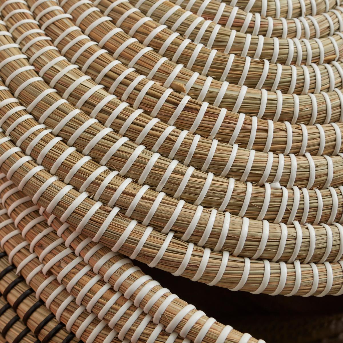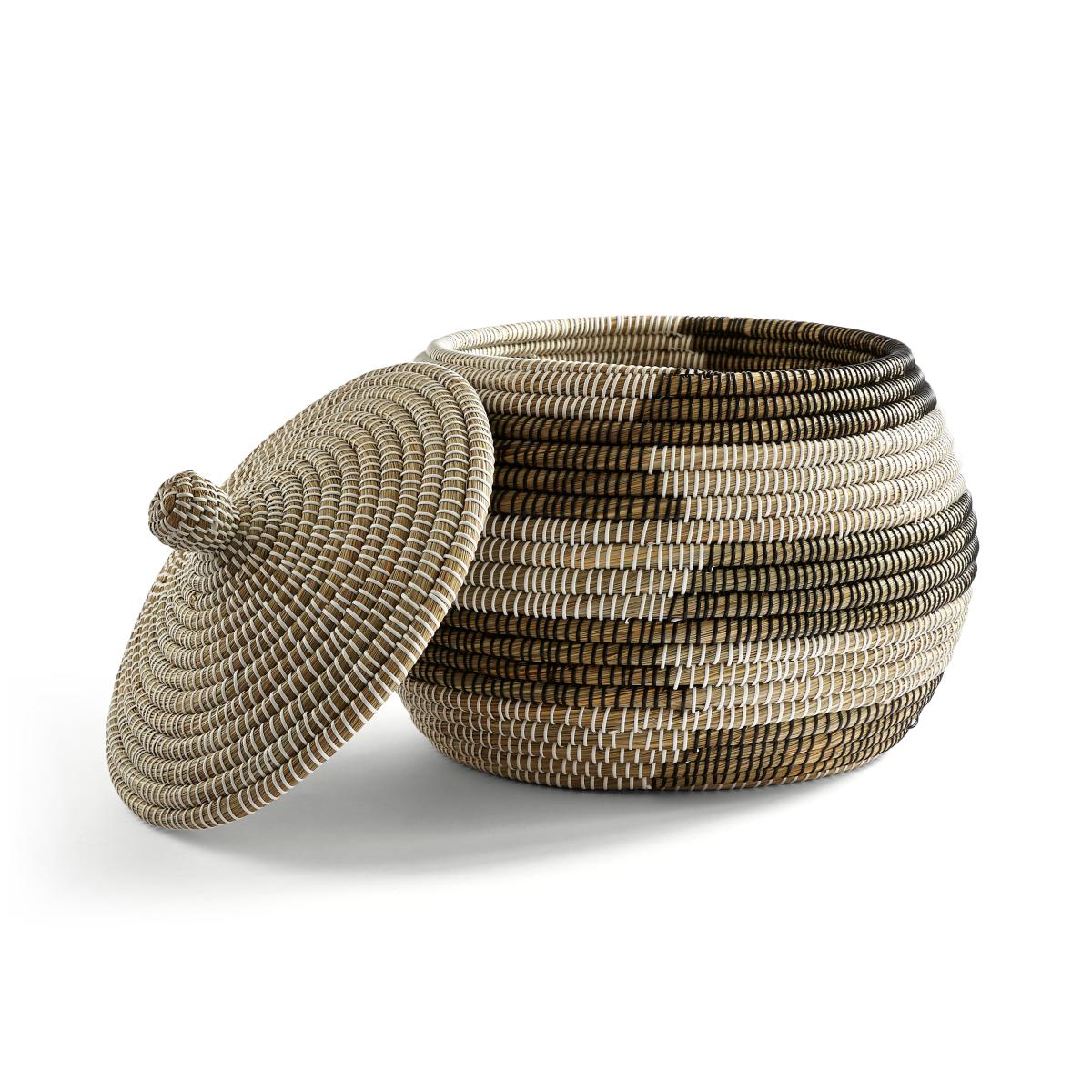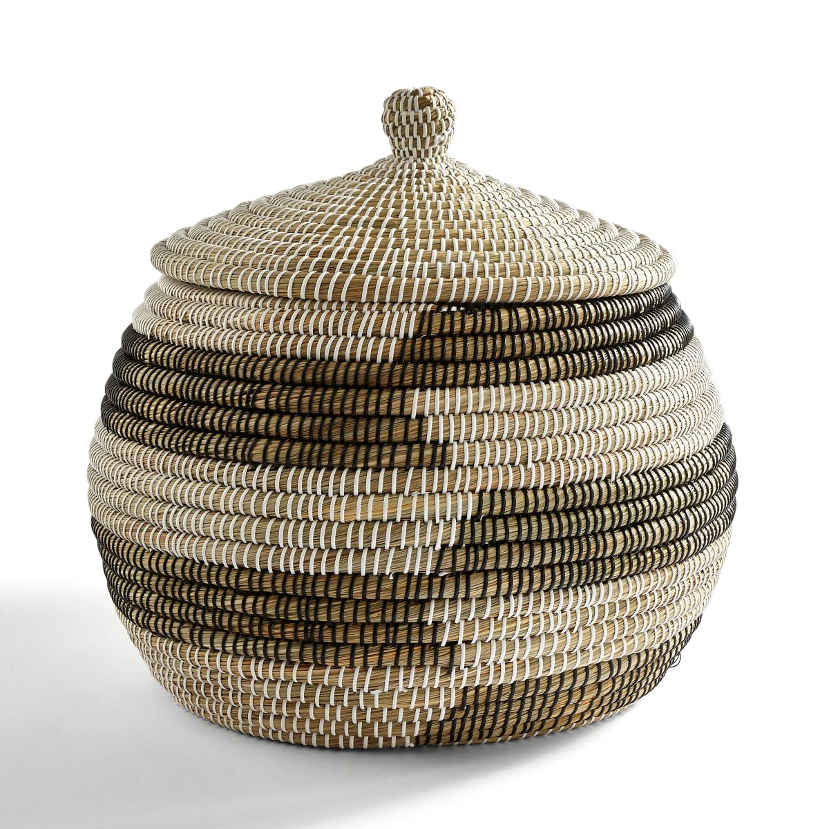 * Handmade * Woven design* Natural materials used* Lidded basket Sporting a high contrast rope design, complimentary to many interior décor styles, this beautiful basket is a perfect storage solution for your home. Crafted from straw and plastic ribbon, this item has been carefully hand woven. Complete with a lid, this piece is excellent for helping you organize your home. Please note: Keep away from fire.
