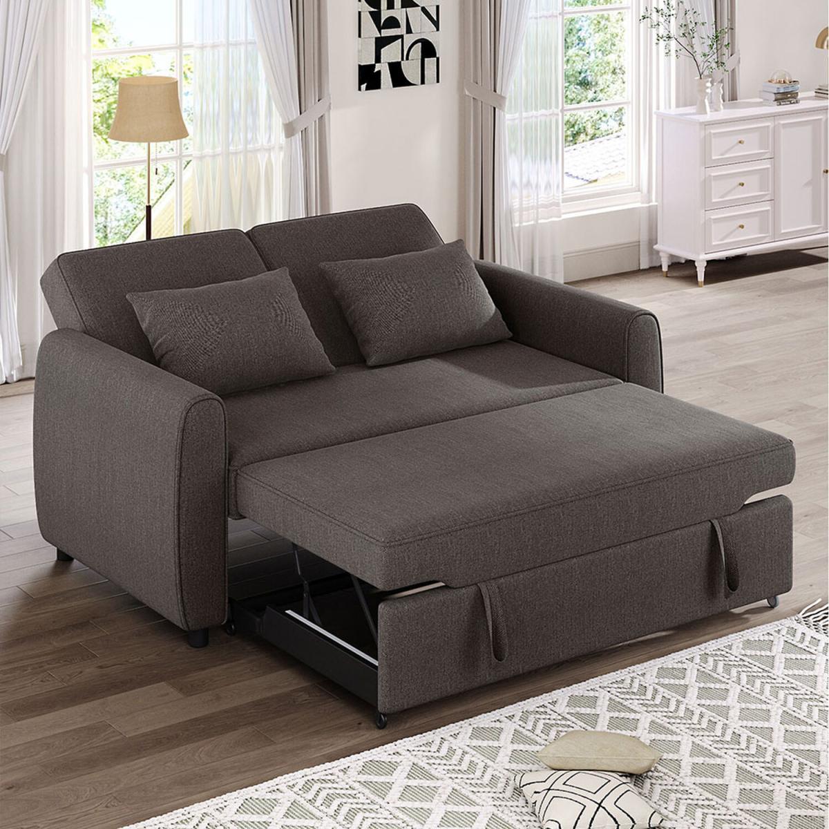 Opt for this convertible sofa bed for a unique comfort experience. Its partially hidden bed structure features rollers, allowing for easy pull-out. You can effortlessly adjust the backrest's tilt angle to transition from a sofa to a recliner and then to a bed. With the two included pillows, you'll enjoy a cozy resting time. Crafted with a sturdy wooden frame and filled with resilient sponge, the upholstery is made from easy-to-clean fabrics, ensuring both softness and convenience. This sofa bed offers multiple resting options, while its elegant, simple design complements most interiors, making it a practical and stylish choice.