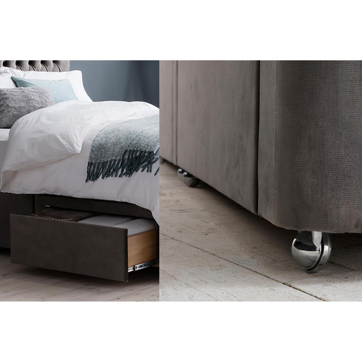 Give your body a heavenly rest every night with the support of our Cook made to order divan. This upholstered super king size divan has a solid hardwood frame, two sliding drawers for added storage and sturdy metal castors. Available in over a hundred different upholsteries to choose from, each Cook is made to order by hand exclusively for you, and as such, will give a personal, designed look to your bedroom. Give your body a heavenly rest every night with the support of our Cook made to order divan. This upholstered super king size divan has a solid hardwood frame, two sliding drawers for added storage and sturdy metal castors. Available in over a hundred different upholsteries to choose from, each Cook is made to order by hand exclusively for you, and as such, will give a personal, designed look to your bedroom.