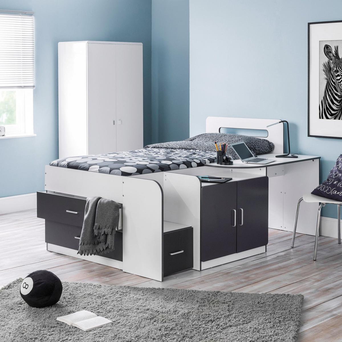 I’m a fan of this cabin‐style bed because its clean lines and neutral grey-and-white finish slot straight into contemporary or Scandi kids’ rooms, and the built-in storage and desk make it ideal for smaller spaces. It works equally well against pale walls or louder accent colours, and you can soften the look with textured cushions, a chunky throw and a playful wall-mounted shelf above the desk. For styling, keep bedding in muted tones - think soft greys, blush or mint - and add a couple of bright cushions for contrast. Use the under-bed cabinets for toys or craft supplies, and top the desk with a minimalist task lamp and a few framed prints to create a fuss-free yet practical study corner.