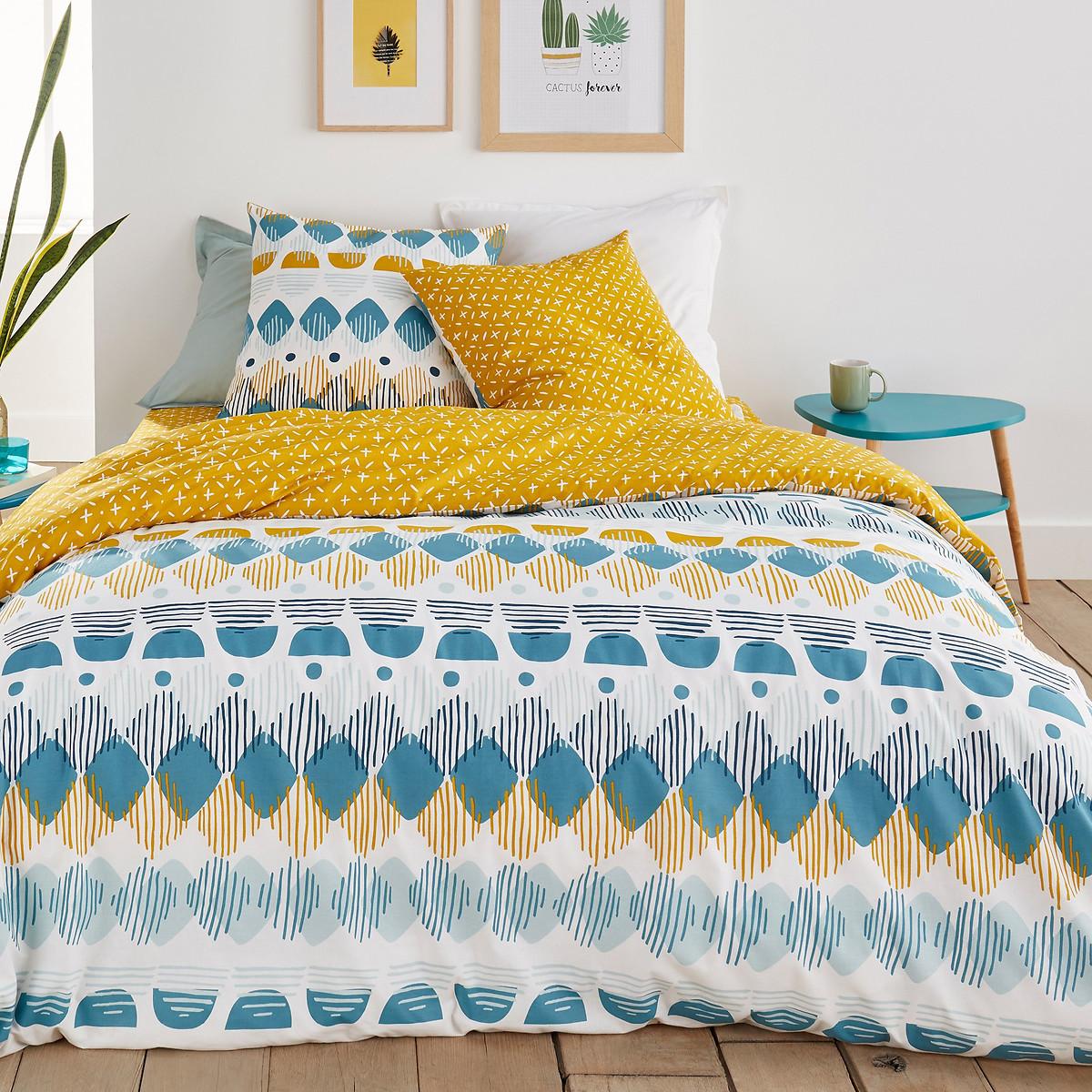 Cool Printed Duvet Cover:This bedding set has a charming summery colour palette and a graphic print!Cotton is part of our daily lives. We love it for its suppleness and softness. Easy Care, it is ideal for the beds of young and old alike!Product Details • 100% cotton • 144 thread count • Straight hem • Blue and yellow print on the front/yellow print on the back. Care Advice • Machine washable at 60°C • By washing your laundry at 40°C instead of 60°C, you limit energy consumption. Dimensions • 140 x 200cm: Single • 200 x 200cm: Double • 240 x 220cm: King • 260 x 240cm: King. Pillowcases sold separately. • OEKO-TEX® Standard 100. Standard 100 certification by OEKO-TEX® tests textile products for harmful substances via an independent, international label.