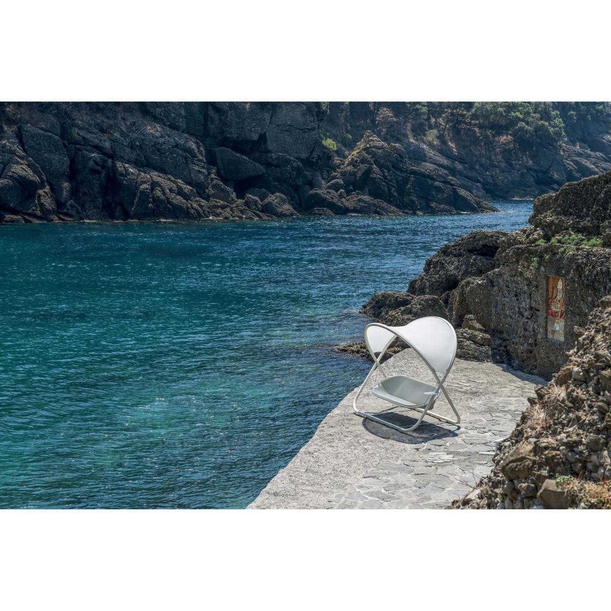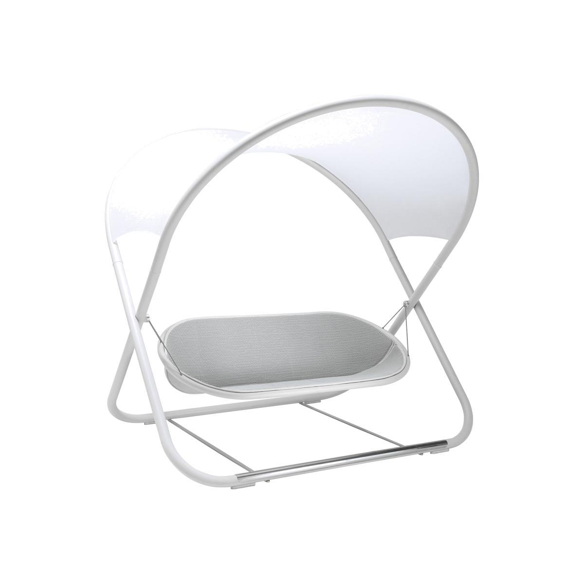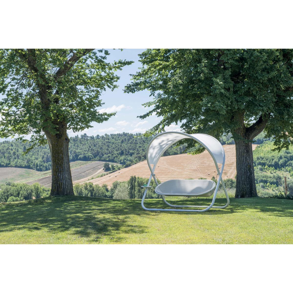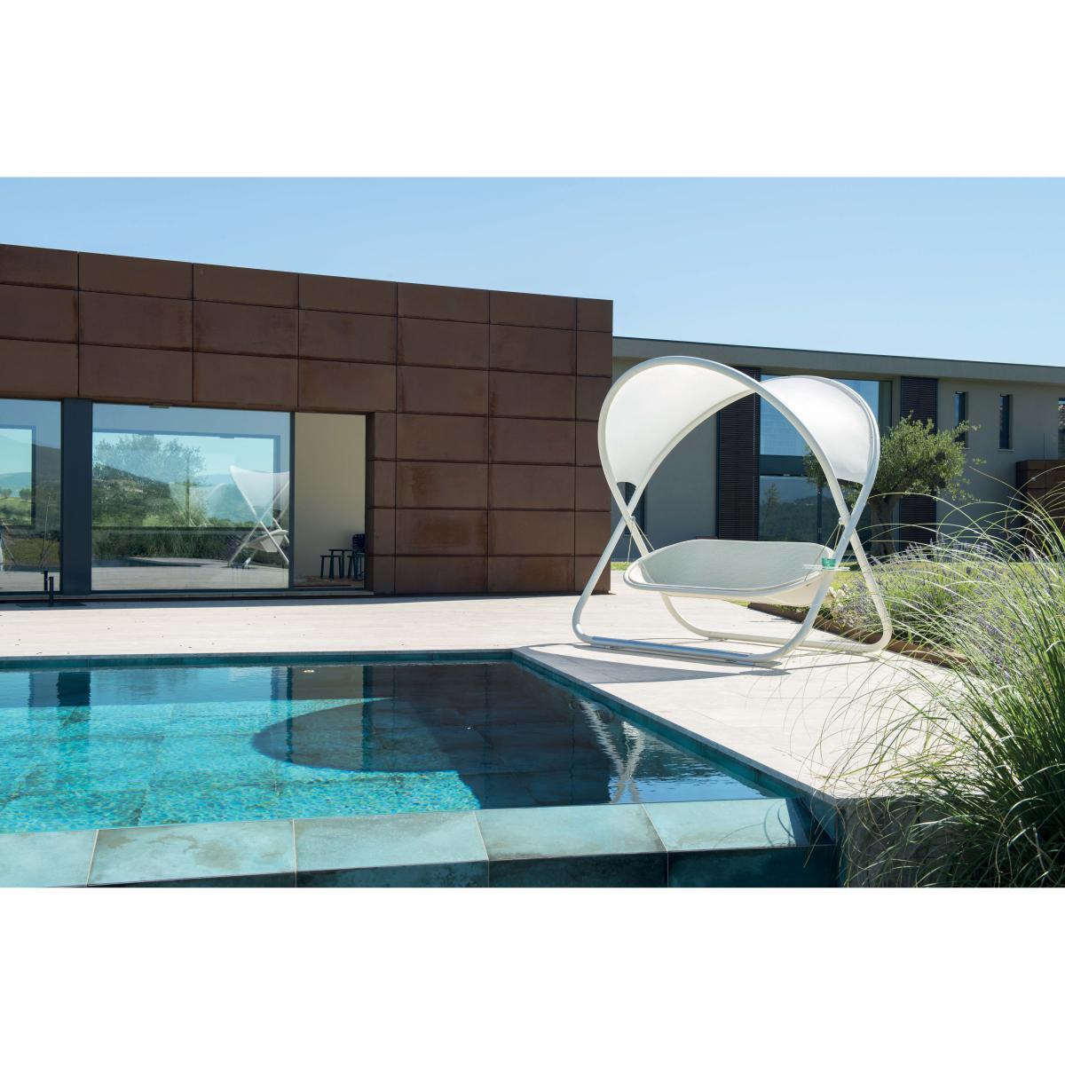 Give your garden or terrace a Hollywood atmosphere with this beautiful "Cool-là" swing seat, the ideal place to enjoy a moment’s relaxation in the open air. An unusual piece of furniture with strong visual impact, "Cool-là" invites you to relax. It consists of two large tubular steel crossbars that give the whole thing a light, grandiose and airy look, set off to perfection by its white colour. With its one-piece padded cushion (included), the seat is like a large comforting cocoon where you can swing and relax together. The rocking movement itself is provided by two Dyneema ropes, guaranteeing optimum safety (high resistance to abrasion). Let yourself be gently rocked by the Cool-là in total tranquillity, for a soothing, relaxing effect, guaranteed. The shady cover in synthetic 3D fabric (the same fabric used to upholster the cushion) protects you from the sun. Treated for outdoor use, this fabric is highly resistant to UV, stains and moisture.
