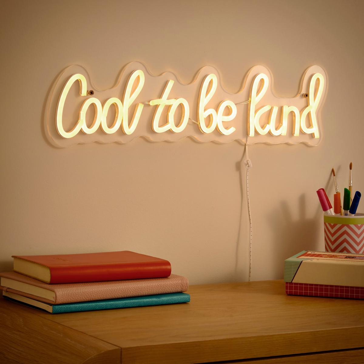 * Typographic Design* Emits Warm White Glow* Included USB Cable Spread positivity with this lovely neon light showcasing the uplifting slogan “cool to be kind.” Emitting a warm white glow, it’s easy to mount with two attachment holes and comes with an included USB cable for easy installation.