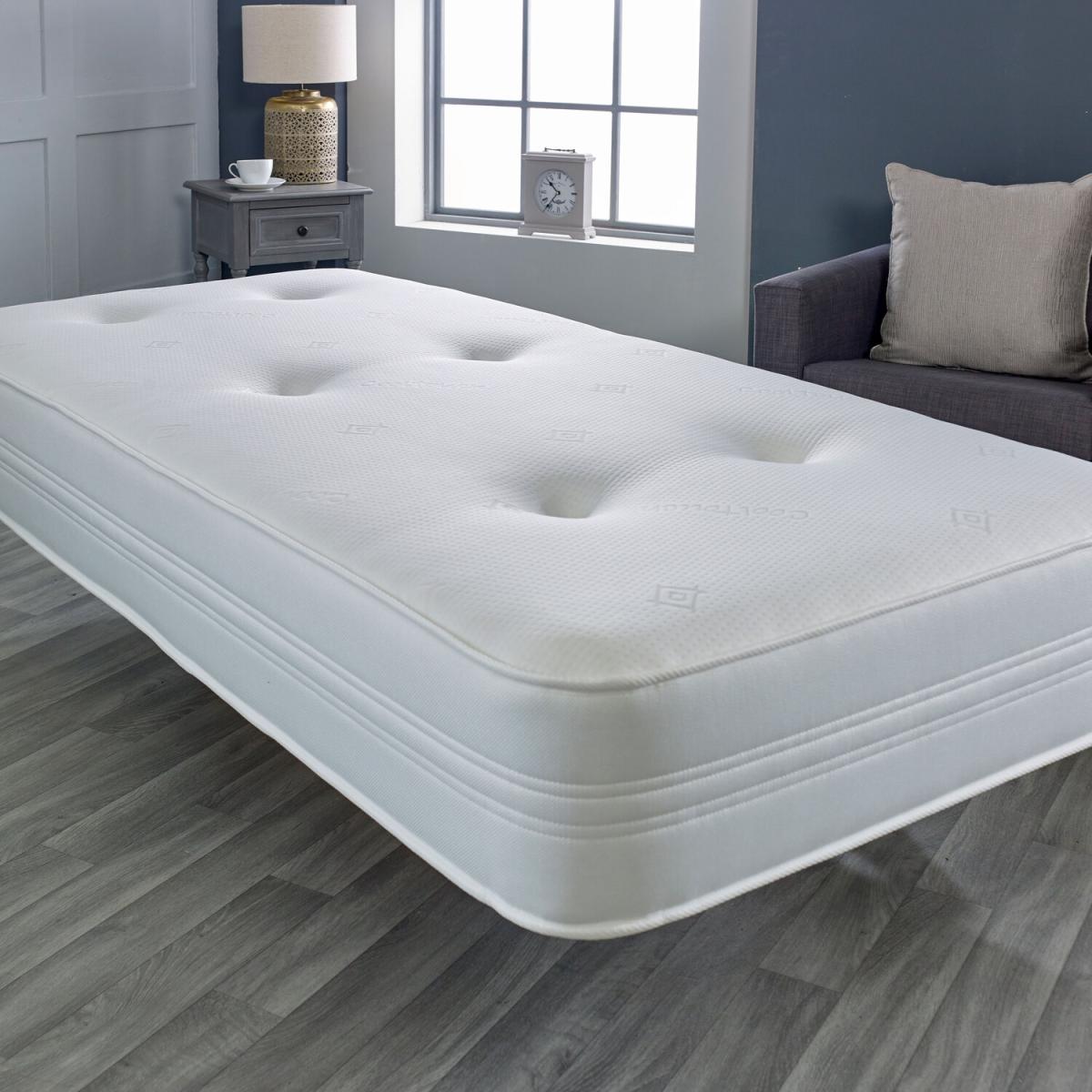 This Memory Foam Sprung cool touch grey tufted mattress has 8 individual comfort layers providing the sleeper with extra comfort and support, carefully hand-tufted tufts keep the layers tightly held together so the sleeper can enjoy an endless night's sleep. With an 8 inches deep base of approximately 23cm, the mattress has a 13.5gauge open coil spring unit, the steel wire provides a firmer and much more supportive feel with less spring feel which distributes the sleeper pressure and weight evenly across the mattress surface for extra comfort and support. The mattress has been carefully designed with a super-soft cooling top cover which is gentle on the sleeper's skin for a cool sleeping sensation. It has a quilted breathable border which allows airflow to pass through the tiny air holes ventilating the mattress keeping it odor-free and maintaining the sleeper at room temperature. Designed single-sided, simply rotate every so often to keep it in pristine condition, with hypoallergenic and anti-dust mite features. Delivered vacuum packed, rolled, and boxed for the convenience of the customer making it a much more environmentally friendly way.