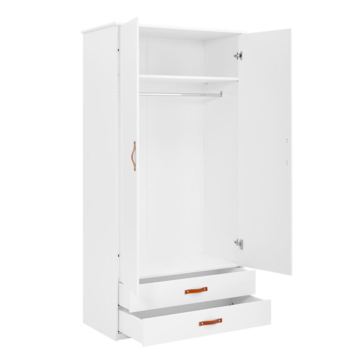 Keep your kiddies room spick and span with the Double Wardrobe from Cool Kids, everything will be organised in this storage beauty. Featuring a hanging rail with a shelf above and drawers below, there will be ample space for all your youngsters clothes plus space for blankets or spare bedding. With a simple white finish, this wardrobe will have no issues blending seamlessly with your existing furniture whilst the brown leather handles add a gorgeous contrast and a bit of style!.