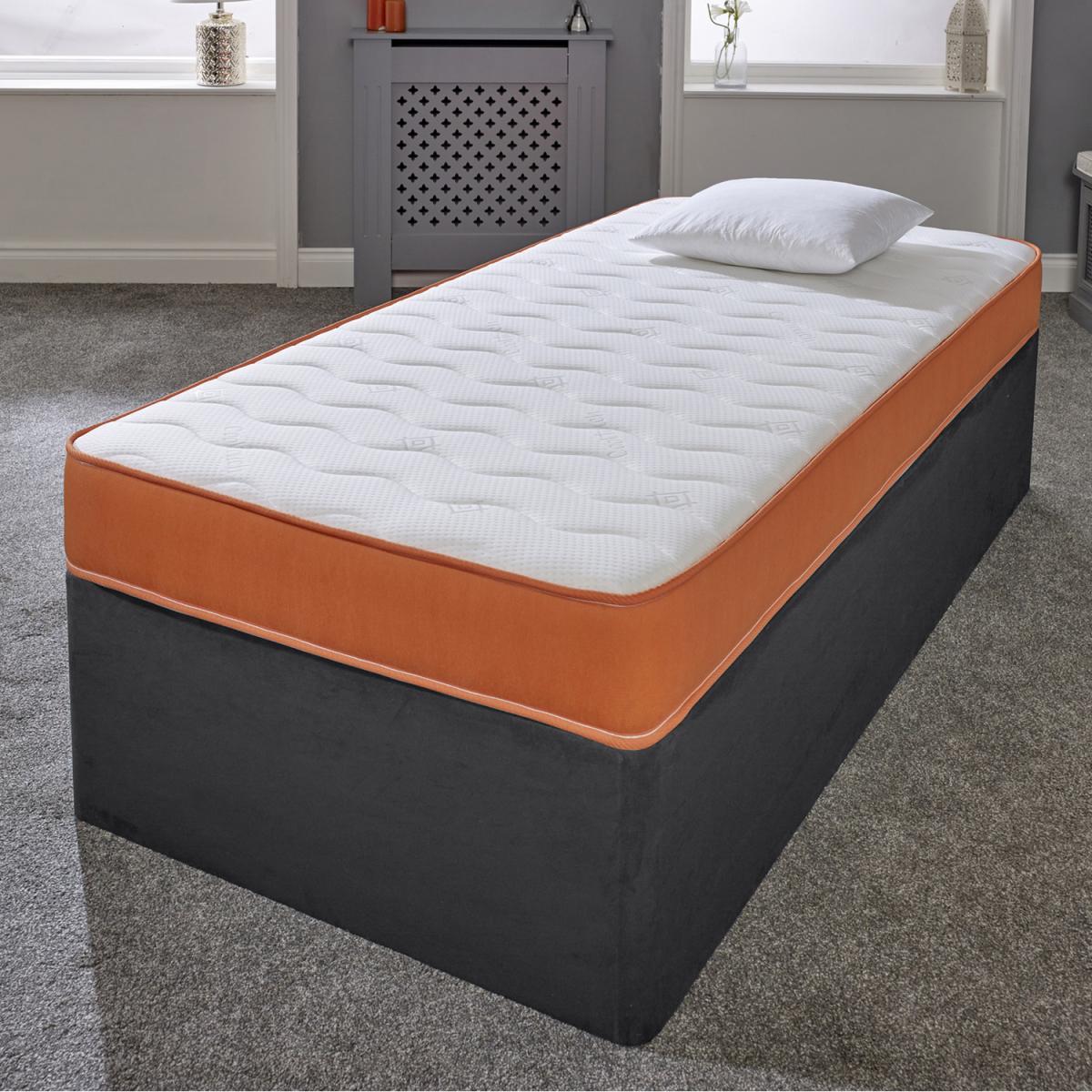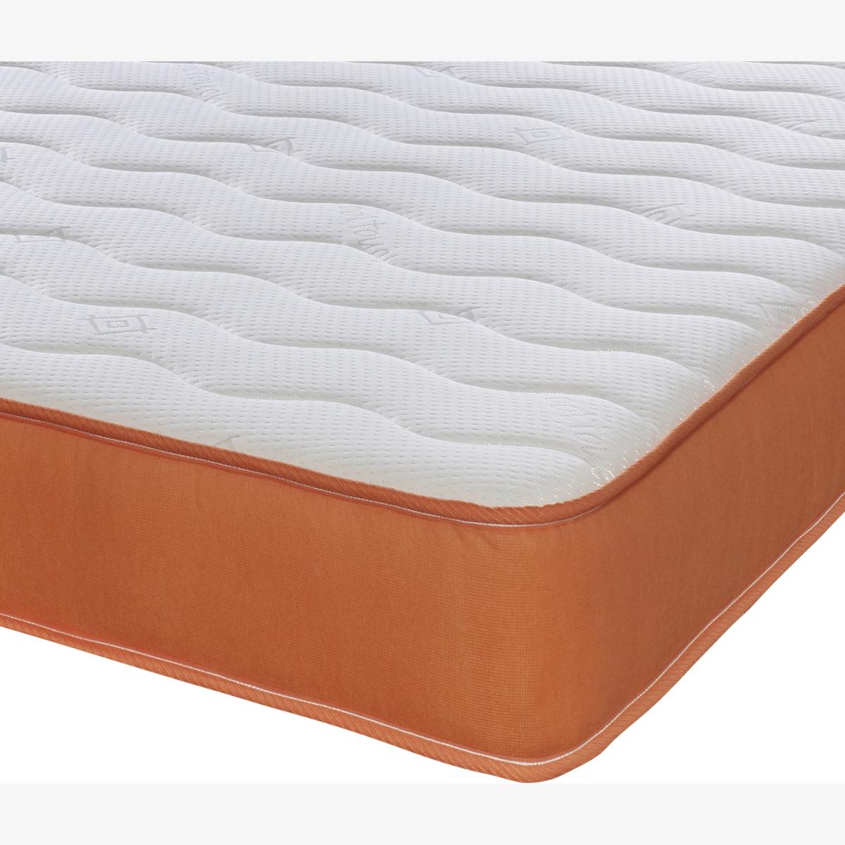 Great for bunk beds, cabin beds, day beds etc. Please check the size of your base before ordering as these will be difficult for you to return. This is our Cool Touch Essentials Orange Wave 18cm Deep Hybrid Mattress. It has a double insulated European engineered open coil Bonnell spring unit with deep polyester comfort fillings (75 minimum recycled content), a layer of high-density visco-elastic memory foam and a Cool Touch Classic quilted sleeping surface in a "wave" design. It comes with a vibrant orange border. Ideal as a spare room mattress, great for kids or those on a budget, it is a medium soft feel mattress containing springs, comfort layers and a layer of high-density visco-elastic memory foam with a single sleeping side. You should rotate your mattress regularly to get the best from it. These are UK-made mattresses, produced in our West Yorkshire factory and are fully compliant with all relevant UK fire safety regulations for domestic use.brbr. We compress, vacuum pack and roll these mattresses so that they can be delivered quickly and cheaply to your door. You will need to allow a few hours after opening your bed to regain its shape and size. As these are produced with fresh, new memory foam, you may need to air them in a dry, well-ventilated room, for up to 24 hours prior to use.
