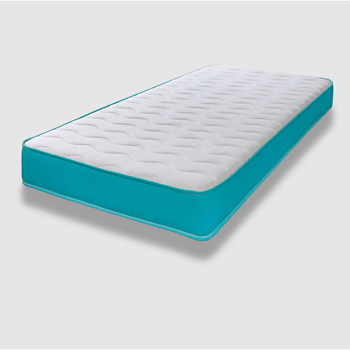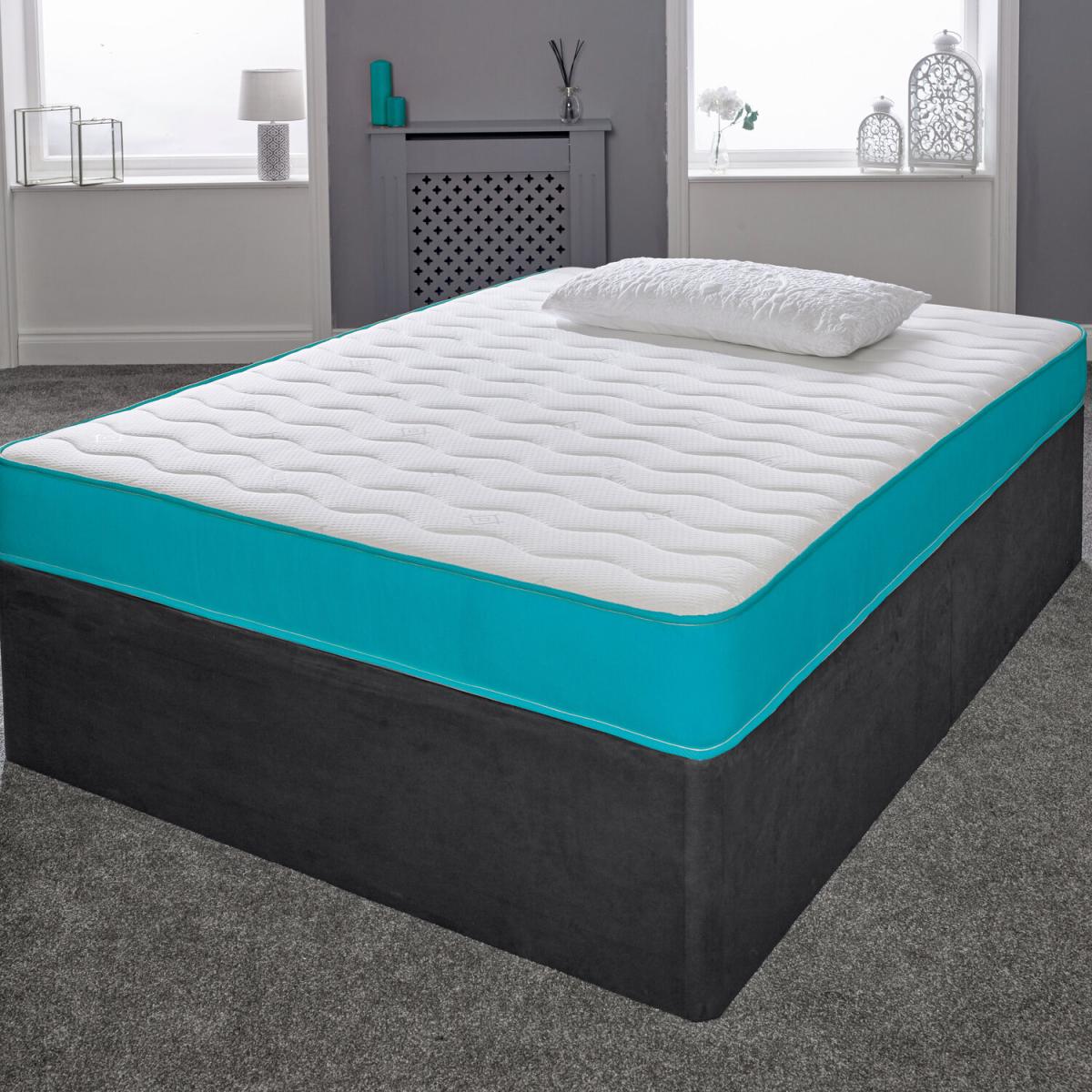 Great for bunk beds, cabin beds, day beds etc. Please do check the size of your base before ordering as these will be difficult for you to return. This is our Cool Touch Essentials Teal Wave 18cm Deep Hybrid Mattress. It has a double insulated European engineered open coil Bonnell spring unit with deep polyester comfort fillings (75 minimum recycled content), a layer of high-density visco-elastic memory foam and a Cool Touch Classic quilted sleeping surface in a wave design. It comes with a vibrant teal-blue border. Ideal as a spare room mattress, great for kids or those on a budget, it is a medium soft feel mattress containing springs, comfort layers and a layer of high-density visco-elastic memory foam with a single sleeping side. You should rotate your mattress regularly to get the best from it. These are UK-made mattresses, produced in our West Yorkshire factory and are fully compliant with all relevant UK fire safety regulations for domestic use. We compress, vacuum pack and roll these mattresses so that they can be delivered quickly and cheaply to your door. You will need to allow a few hours after opening for your mattress to regain its shape and size. As these are produced with fresh, new memory foam, you may need to air them in a dry, well-ventilated room, for up to 24 hours prior to use.