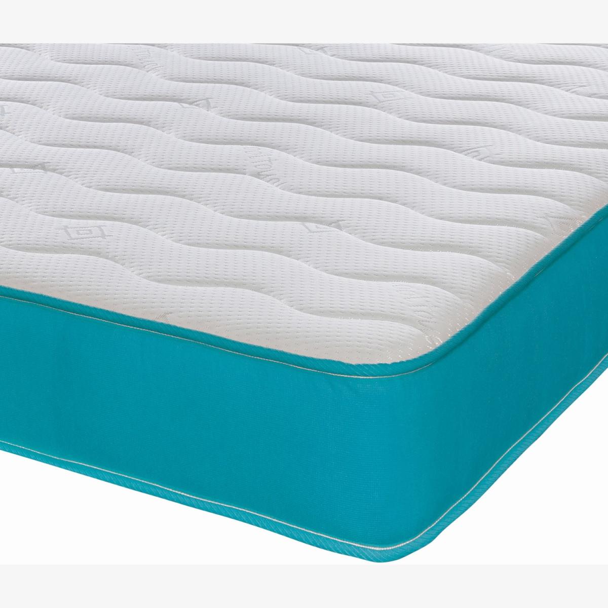 Great for bunk beds, cabin beds, day beds etc. Please do check the size of your base before ordering as these will be difficult for you to return. This is our Cool Touch Essentials Teal Wave 18cm Deep Hybrid Mattress. It has a double insulated European engineered open coil Bonnell spring unit with deep polyester comfort fillings (75 minimum recycled content), a layer of high-density visco-elastic memory foam and a Cool Touch Classic quilted sleeping surface in a wave design. It comes with a vibrant teal-blue border. Ideal as a spare room mattress, great for kids or those on a budget, it is a medium soft feel mattress containing springs, comfort layers and a layer of high-density visco-elastic memory foam with a single sleeping side. You should rotate your mattress regularly to get the best from it. These are UK-made mattresses, produced in our West Yorkshire factory and are fully compliant with all relevant UK fire safety regulations for domestic use. We compress, vacuum pack and roll these mattresses so that they can be delivered quickly and cheaply to your door. You will need to allow a few hours after opening for your mattress to regain its shape and size. As these are produced with fresh, new memory foam, you may need to air them in a dry, well-ventilated room, for up to 24 hours prior to use.