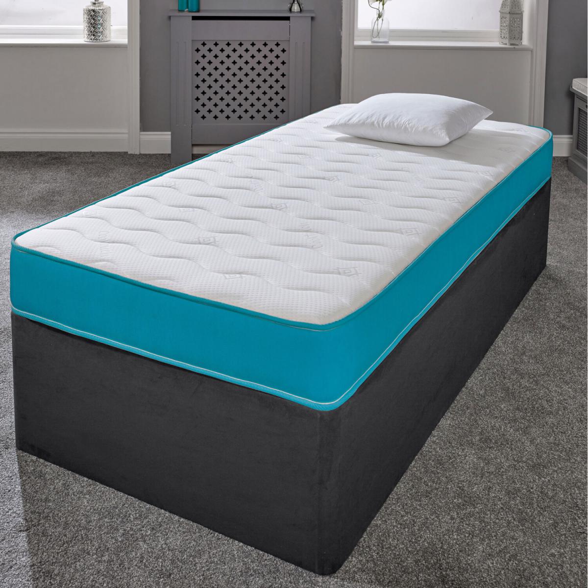 Great for bunk beds, cabin beds, day beds etc. Please do check the size of your base before ordering as these will be difficult for you to return. This is our Cool Touch Essentials Teal Wave 18cm Deep Hybrid Mattress. It has a double insulated European engineered open coil Bonnell spring unit with deep polyester comfort fillings (75 minimum recycled content), a layer of high-density visco-elastic memory foam and a Cool Touch Classic quilted sleeping surface in a wave design. It comes with a vibrant teal-blue border. Ideal as a spare room mattress, great for kids or those on a budget, it is a medium soft feel mattress containing springs, comfort layers and a layer of high-density visco-elastic memory foam with a single sleeping side. You should rotate your mattress regularly to get the best from it. These are UK-made mattresses, produced in our West Yorkshire factory and are fully compliant with all relevant UK fire safety regulations for domestic use. We compress, vacuum pack and roll these mattresses so that they can be delivered quickly and cheaply to your door. You will need to allow a few hours after opening for your mattress to regain its shape and size. As these are produced with fresh, new memory foam, you may need to air them in a dry, well-ventilated room, for up to 24 hours prior to use.
