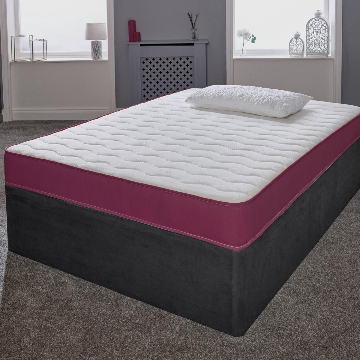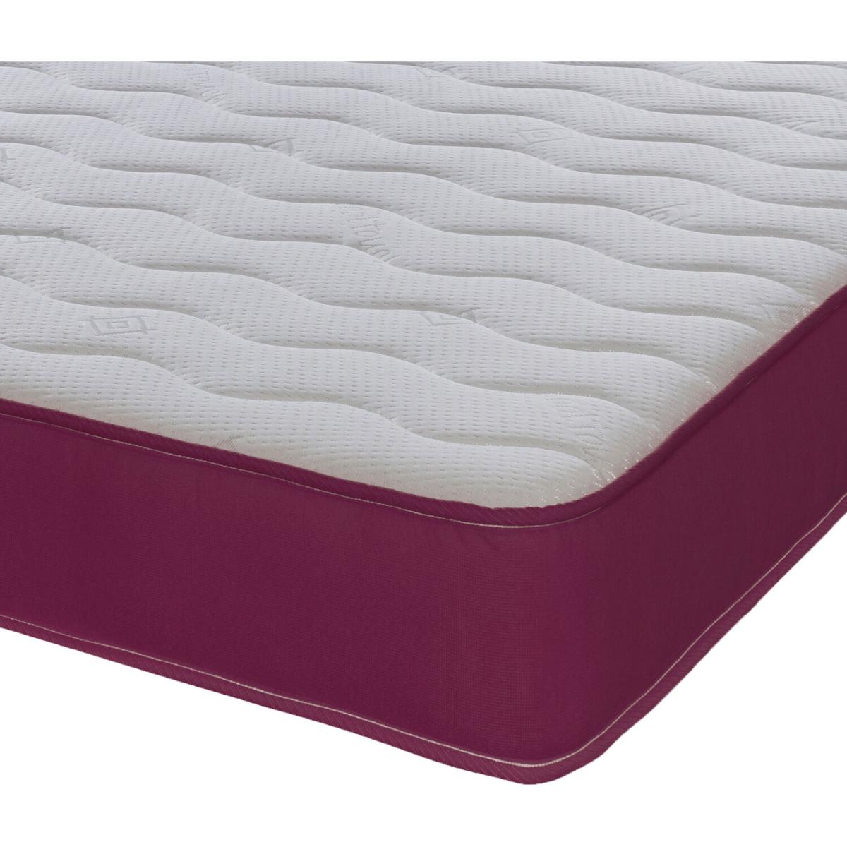 Great for bunk beds, cabin beds, day beds etc. Please do check the size of your base before ordering as these will be difficult for you to return. This is our Cool Touch Essentials Purple Wave 18cm Deep Hybrid Mattress. It has a double insulated European engineered open coil Bonnell spring unit with deep polyester comfort fillings (75 minimum recycled content), a layer of high-density visco-elastic memory foam and a Cool Touch Classic quilted sleeping surface in a wave design. It comes with a sophisticated Purple border. Ideal as a spare room mattress, great for kids or those on a budget, it is a medium soft feel mattress containing springs, comfort layers and a layer of high-density visco-elastic memory foam with a single sleeping side. You should rotate your mattress regularly to get the best from it. These are UK-made mattresses, produced in our West Yorkshire factory and are fully compliant with all relevant UK fire safety regulations for domestic use. We compress, vacuum pack and roll these mattresses so that they can be delivered quickly and cheaply to your door. You will need to allow a few hours after opening for your mattress to regain its shape and size. As these are produced with fresh, new memory foam, you may need to air in a dry, well-ventilated room, for up to 24 hours prior to use.