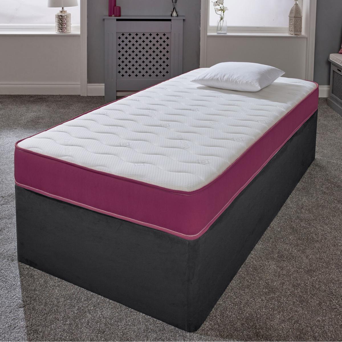 Great for bunk beds, cabin beds, day beds etc. Please do check the size of your base before ordering as these will be difficult for you to return. This is our Cool Touch Essentials Purple Wave 18cm Deep Hybrid Mattress. It has a double insulated European engineered open coil Bonnell spring unit with deep polyester comfort fillings (75 minimum recycled content), a layer of high-density visco-elastic memory foam and a Cool Touch Classic quilted sleeping surface in a wave design. It comes with a sophisticated Purple border. Ideal as a spare room mattress, great for kids or those on a budget, it is a medium soft feel mattress containing springs, comfort layers and a layer of high-density visco-elastic memory foam with a single sleeping side. You should rotate your mattress regularly to get the best from it. These are UK-made mattresses, produced in our West Yorkshire factory and are fully compliant with all relevant UK fire safety regulations for domestic use. We compress, vacuum pack and roll these mattresses so that they can be delivered quickly and cheaply to your door. You will need to allow a few hours after opening for your mattress to regain its shape and size. As these are produced with fresh, new memory foam, you may need to air in a dry, well-ventilated room, for up to 24 hours prior to use.