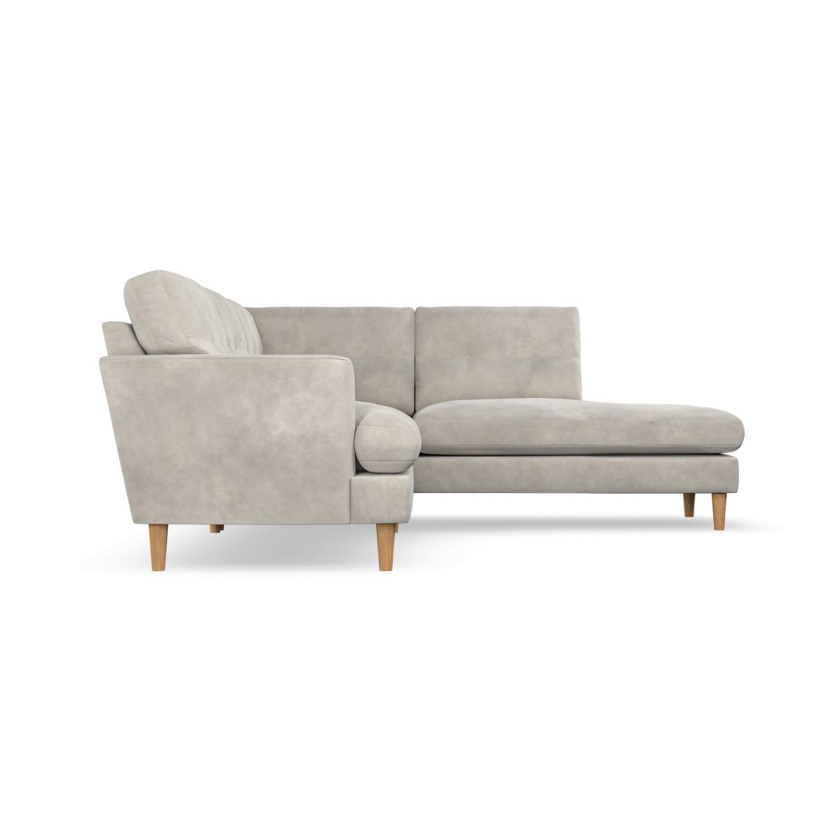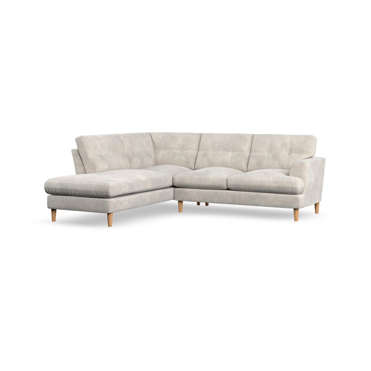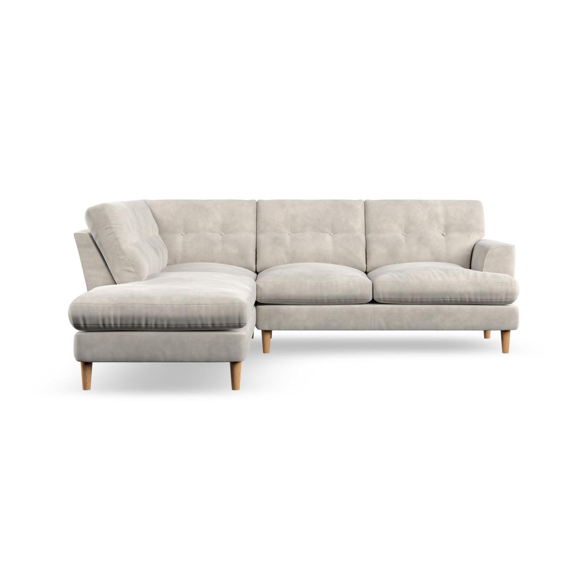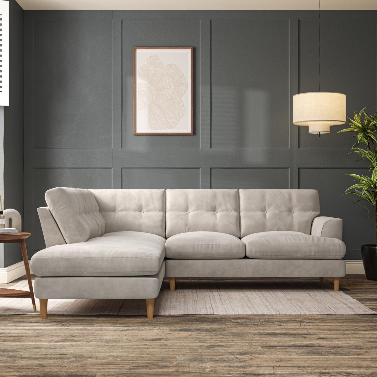 * Scandi inspired design* High legs* Button pull detailing* Choose the orientation, cushion filling, leg colour and fabric The Cooper 4 Seater Corner Chaise Sofa offers a perfect blend of Scandinavian-inspired design and functional comfort. Its clean lines, elegant high legs, and generous T-shaped seat cushions make it a sophisticated addition to any living space. The button-pulled detailing on the fibre-filled back cushions adds a touch of timeless charm, while also ensuring exceptional comfort and support. With ample seating space and a chaise for lounging, this sofa is perfect for relaxing with family or entertaining guests. Customise it with your choice of fabric, leg finish, and cushion filling to suit your personal style.