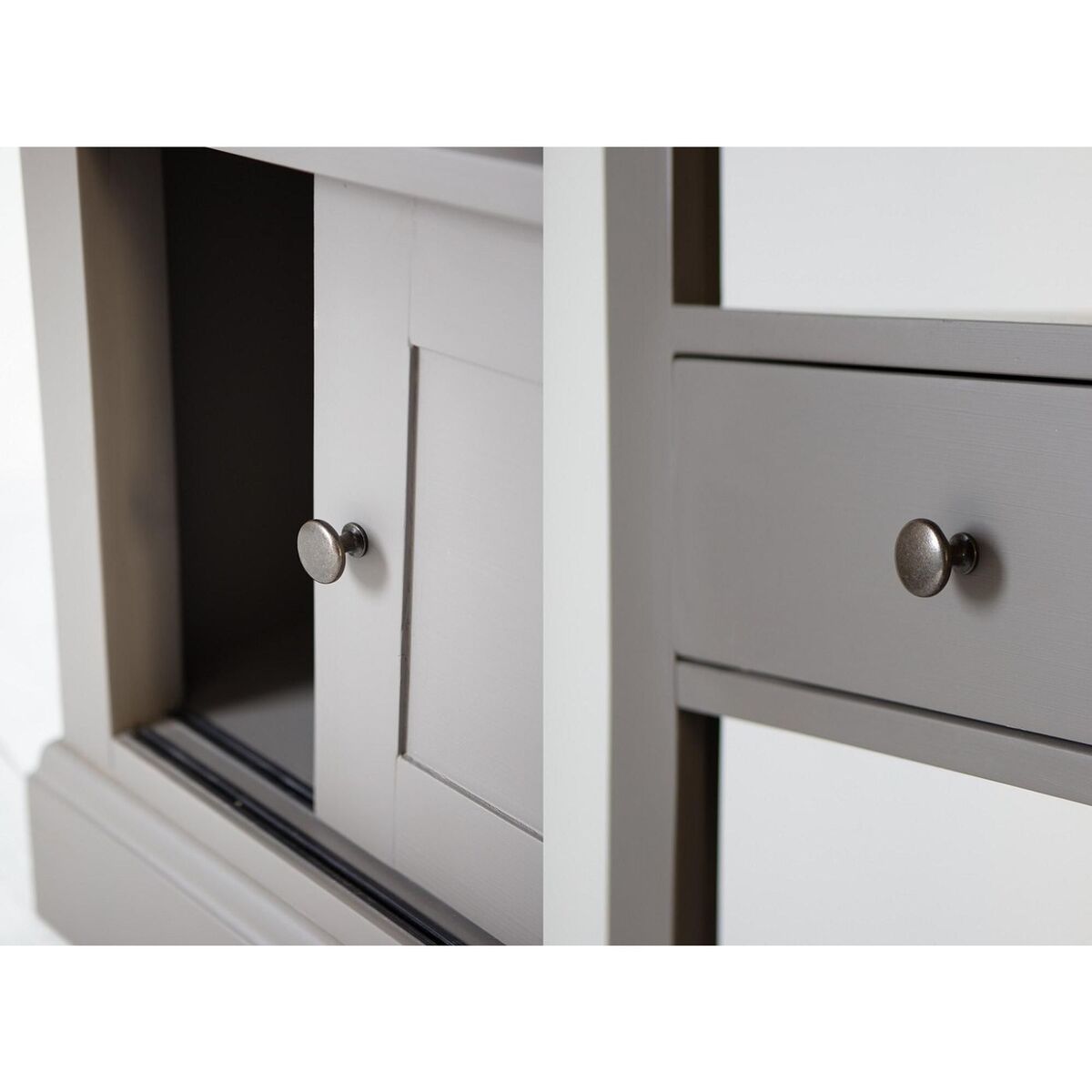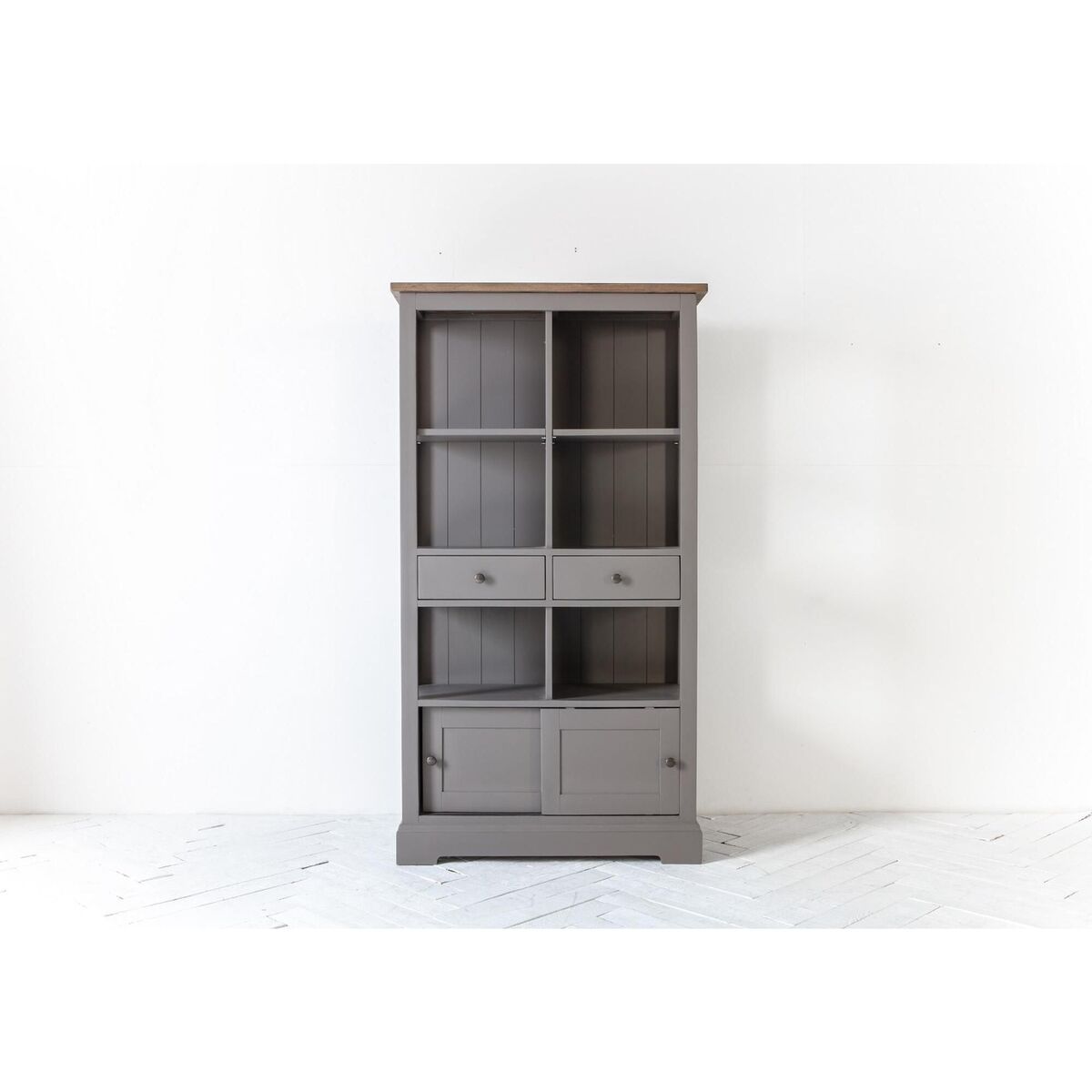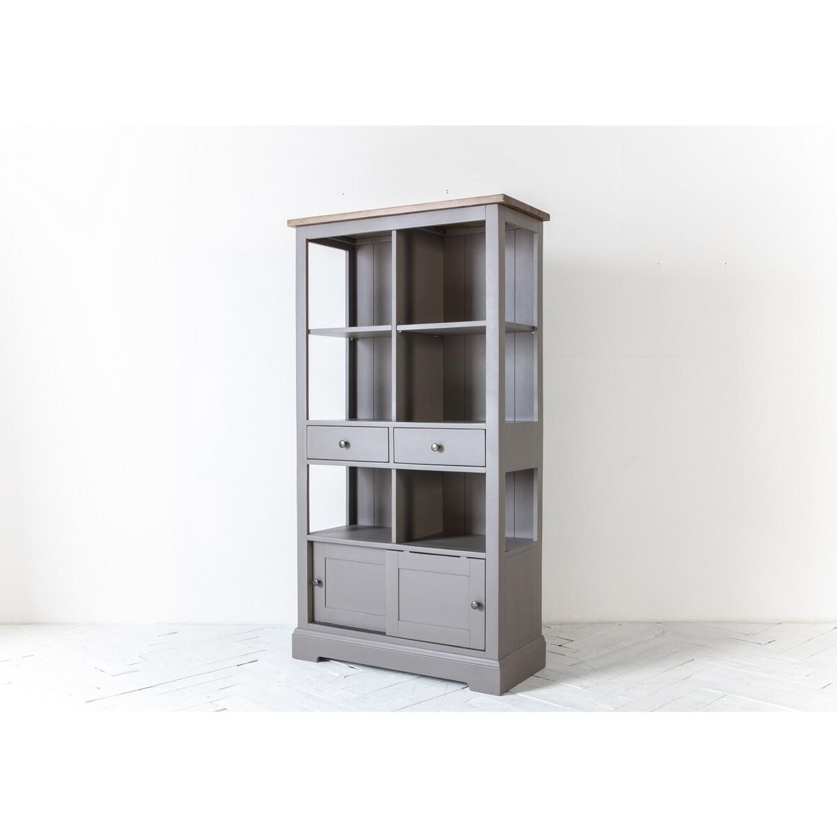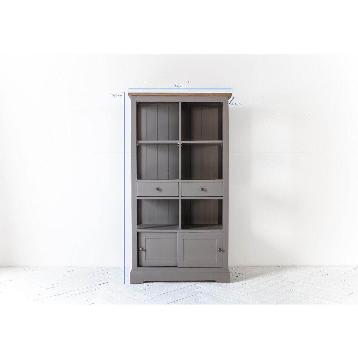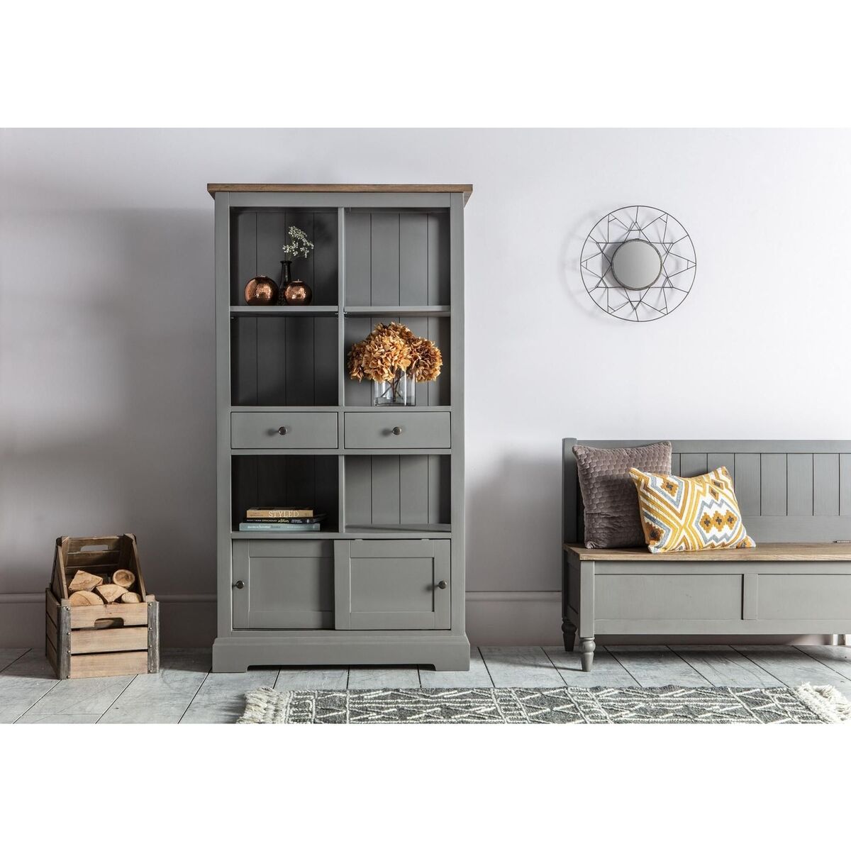 Display your favourite items while storing your cherished ones with the Cooper shelving unit. An updated farmhouse design that's ideal for modern country interiors, the Cooper is crafted from solid oak and painted in a soothing Storm Grey hue. Its top, with a natural finish, beautifully contrasts the base of the design while showcasing the appealing features of the wood. Six shelving areas, plus two cupboards and two drawers with brass handles provide you with handy storage and display space for books, vases and small items. The Cooper is a practical yet stylish addition to living rooms and dining rooms with rustic inspiration, team it with the matching items from the Cooper range for a coordinated, farmhouse chic feel.