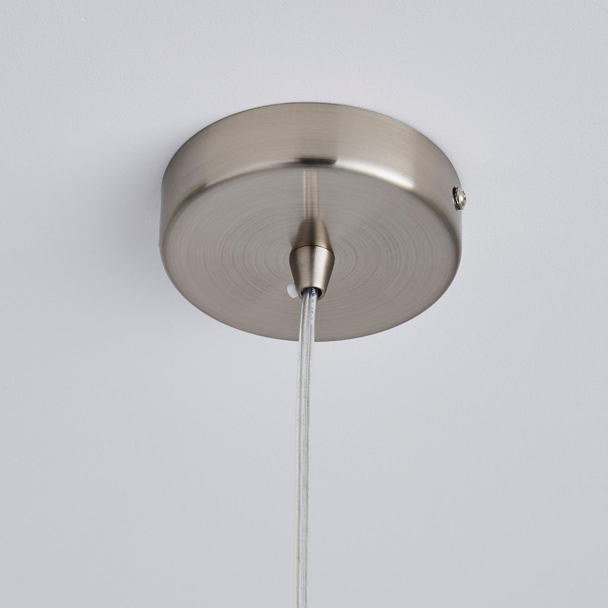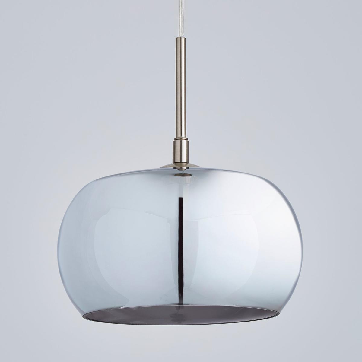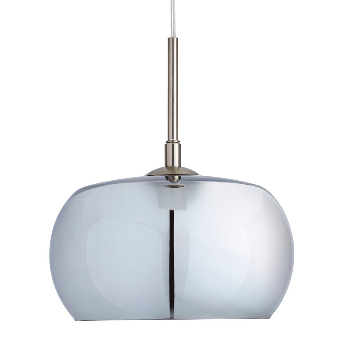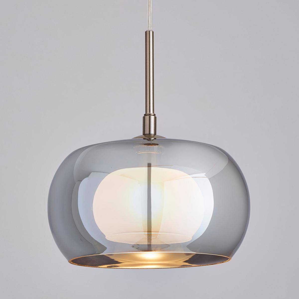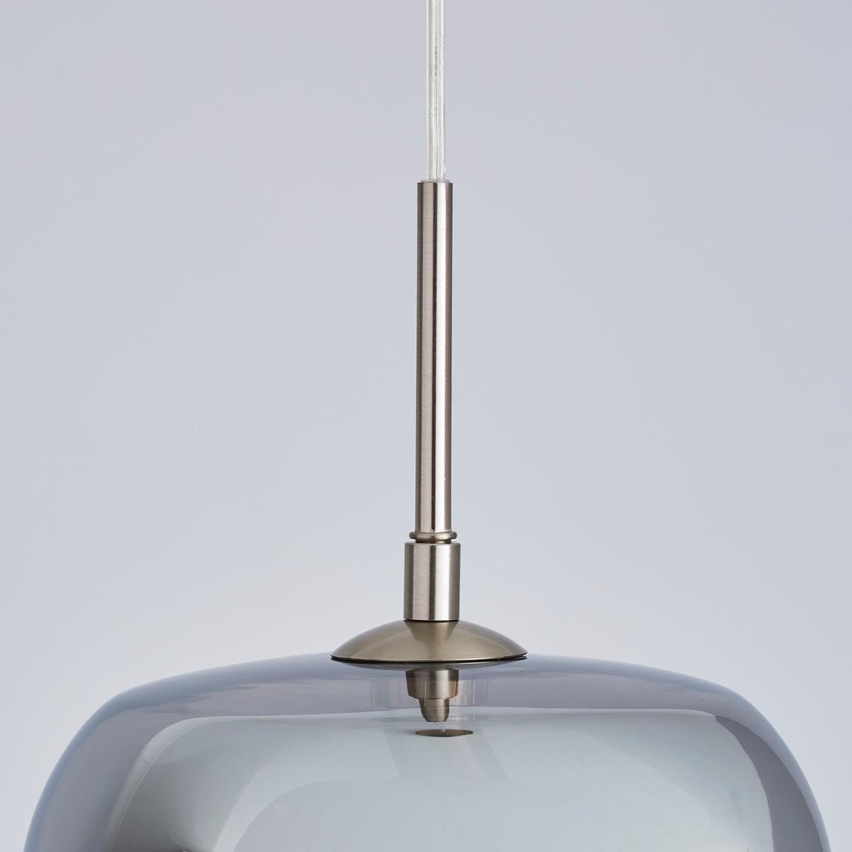 This ceiling pendant has a smoked glass shade with a frosted inner glass shade and a satin nickel finish. This light is also adjustable in height and is compatible with a dimmer switch and bulb.