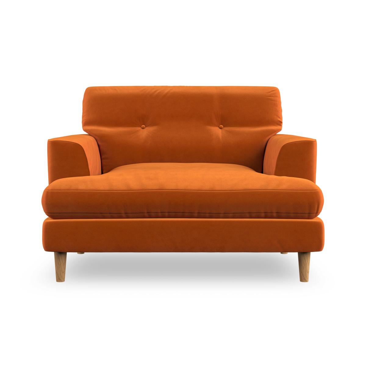 * Scandi inspired design* High legs* Button pull detailing* Choose the cushion filling, leg colour and fabric The Cooper Snuggle Chair is a compact yet luxurious seating option, perfect for creating a cosy retreat. Its Scandinavian-inspired design features clean lines, an elegant high leg, and a generous T-shaped seat cushion. The fibre-filled back cushion is adorned with classic button-pull detailing, ensuring both comfort and style. Customise this snug chair with your preferred fabric, leg finish, and cushion filling to suit your décor.