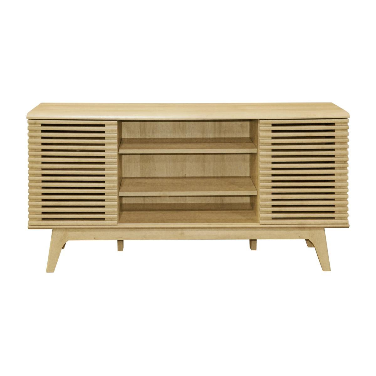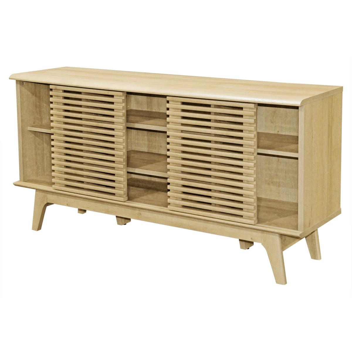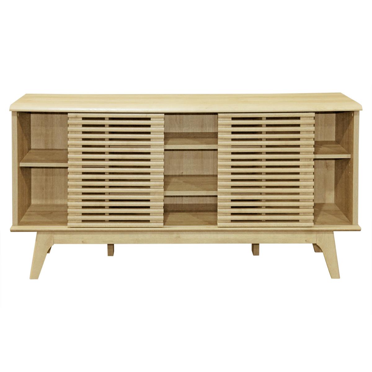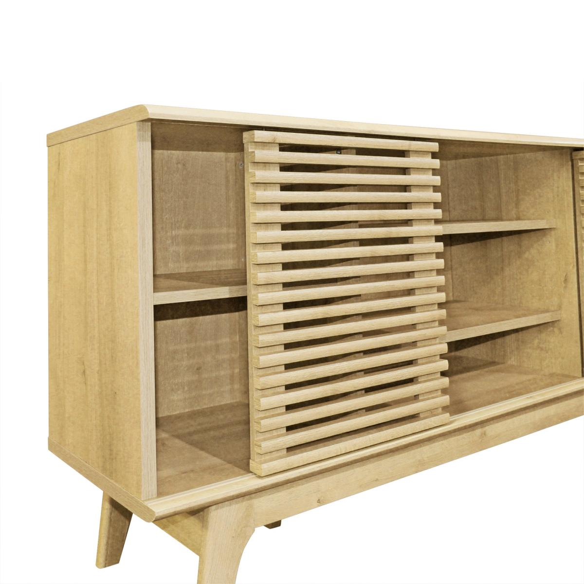 * Wooden Sideboard* Slatted Doors* Interior Cabinets and Shelf* Assembly Required This sideboards sliding slatted doors open to reveal an interior layout comprising shelves and cupboards, providing an organised storage solution while showcasing the depth and richness of the blend of Japanese and Scandinavian design.