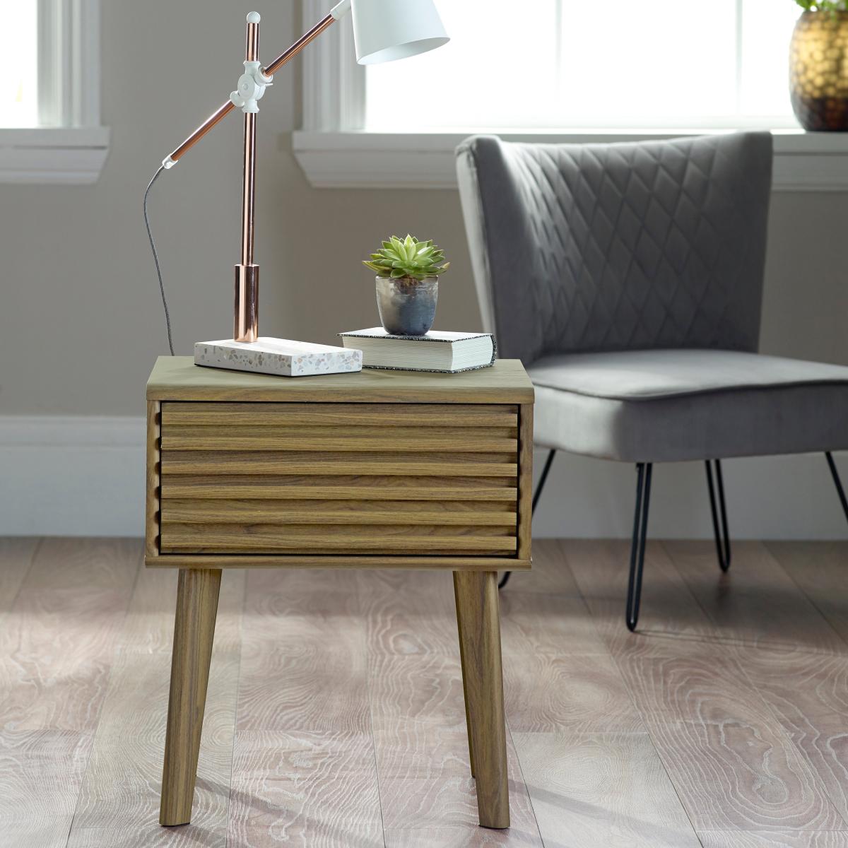 I’m a fan of the Riviera oak side table for its clean lines and warm, natural finish - it feels at home in both contemporary and mid-century schemes without overpowering a space. Its compact size and elevated legs make it ideal by a sofa or armchair, especially in neutral or Scandi-inspired rooms where wood tones can really shine. For practical styling, use it as a small drinks station with a slim table lamp and a couple of leather-bound books, or cluster a textured ceramic pot plant and a candle to add height and interest. Its drawer holds remotes or coasters neatly out of sight, keeping surfaces clutter-free.