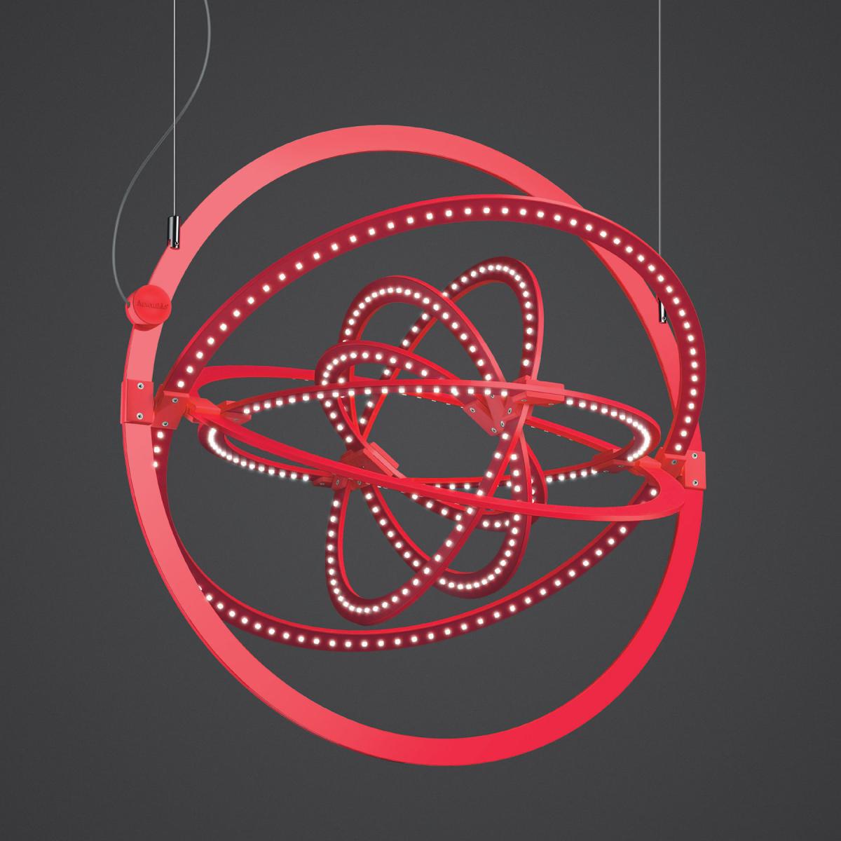 Suspension lamp, an extension of the range of the Copernico series. Copernico is obtained from a single laser-cut sheet of anodised aluminium, when off the device appears completely flat. The modest volume and weight significantly reduce energy use during the transportation and storage phase. The articulation with copper contacts (patent pending) allows the power supply to pass between the concentric ellipses that make up the structure, and enables these to be rotated independently over 360°.