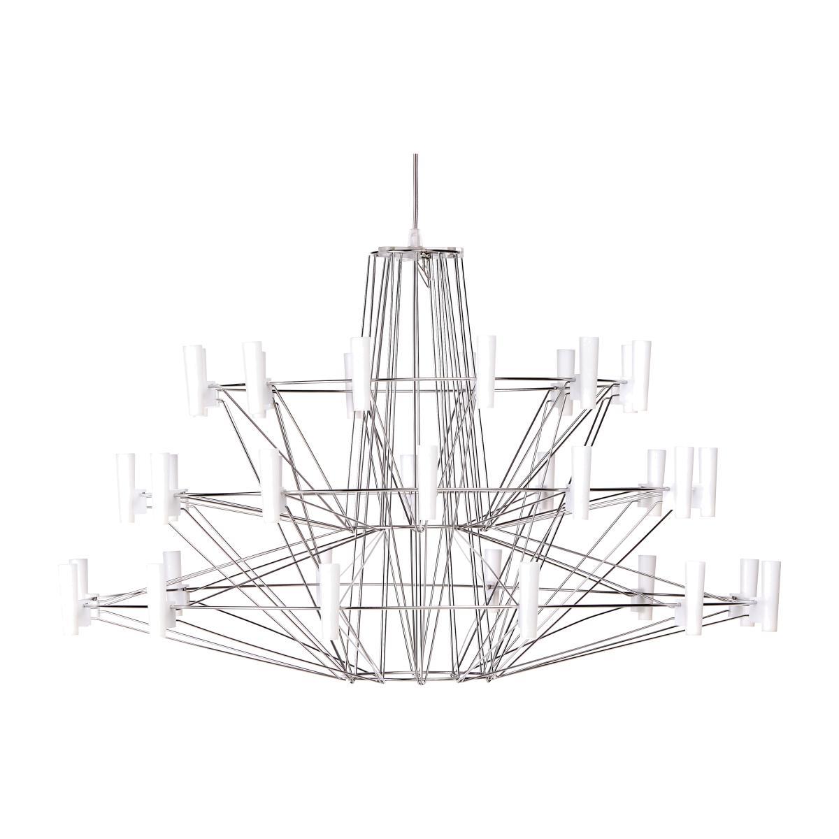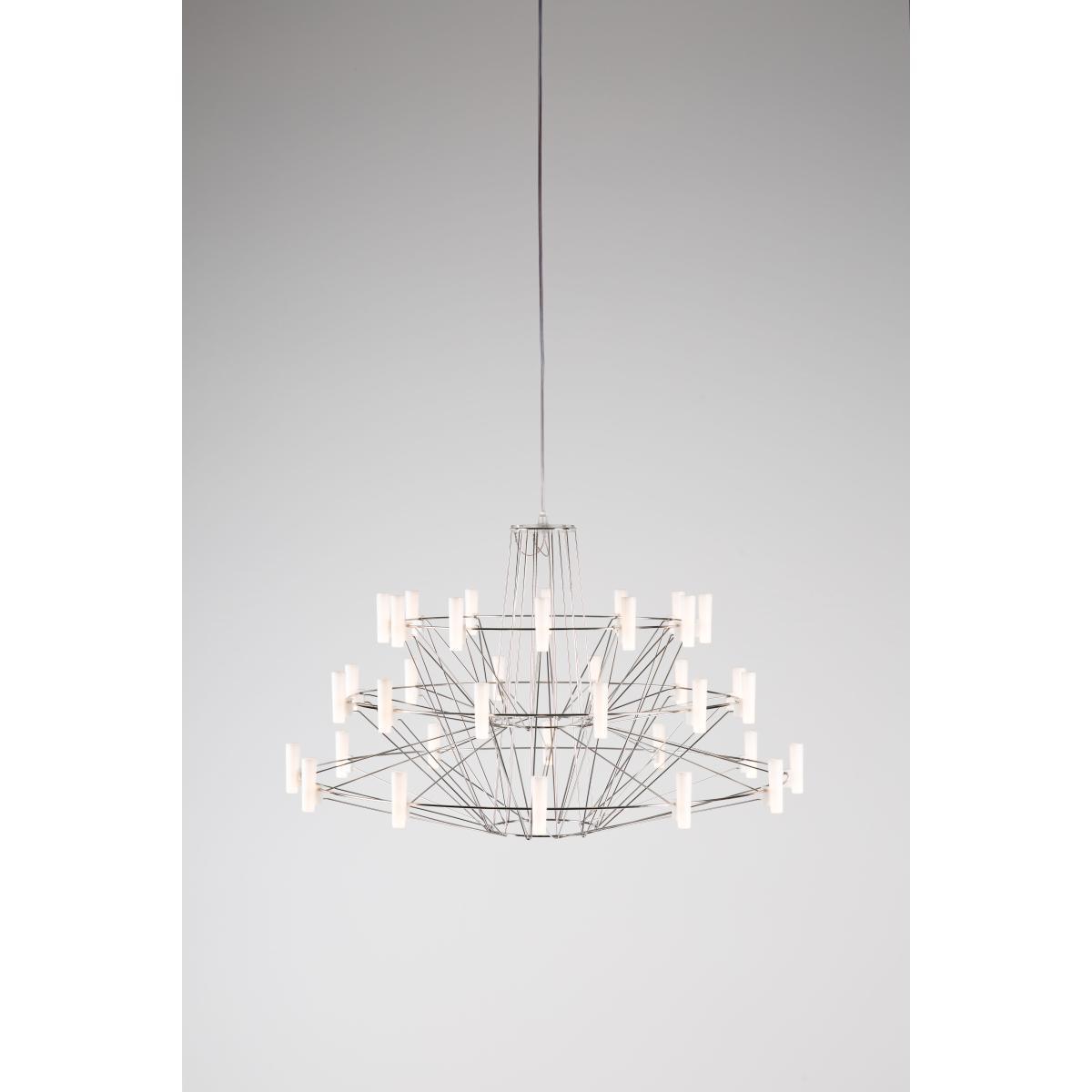 With Coppélia, the brilliant designer Arihiro Miyake provides us with a contemporary reinterpretation of the classic chandelier. Inspired by the graceful movements of a ballerina, this chandelier traces sinuous, delicate movements in the air. This light fitting in its small version (Ø 68 x H 42 cm) consists of a three-dimensional stainless steel structure, consisting of three levels on which are inserted 36 tubular LEDs, looking like small candles. The intertwined steel wires form beautiful, repeating geometric patterns. This openwork balanced structure is incredibly aerial. The steel wires serve as a conductor (very low-voltage electric current). To enhance the impression of lights suspended in space, the electric cable is transparent. Inspired by both aesthetic and technical challenges, Japanese designer Arihiro Miyake has produced a model with a geometric and rigorously architected design. This remarkable piece will dress beautiful high ceilings with panache!.