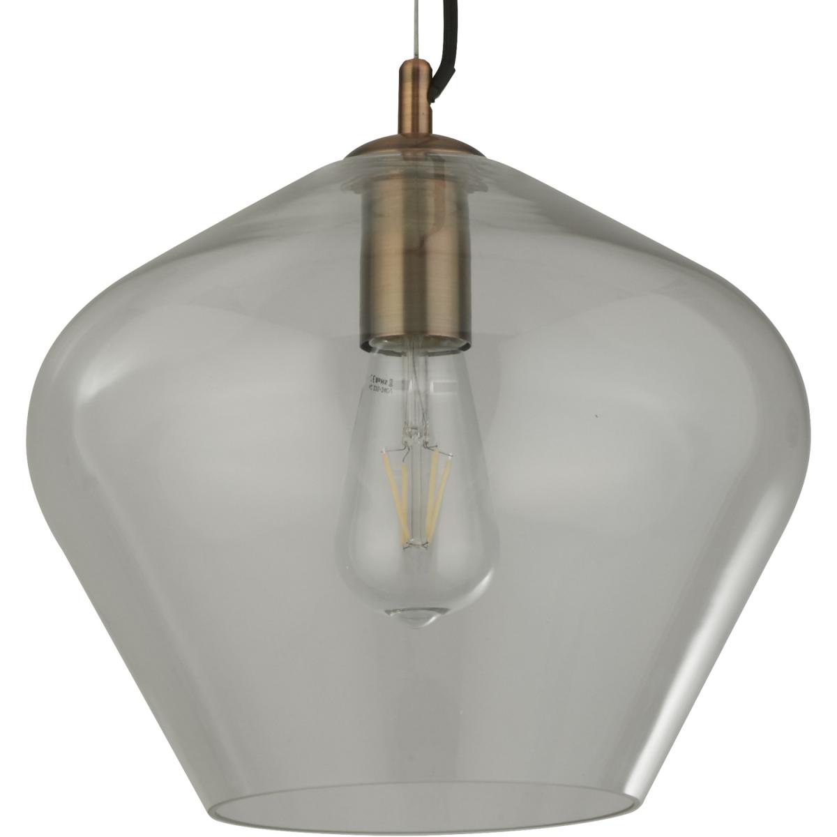 A simple addition for a home, the clear glass pendant comes with a copper base finish and exposed lamp design. Hang in a modern kitchen area or hallway for a stylish finish.