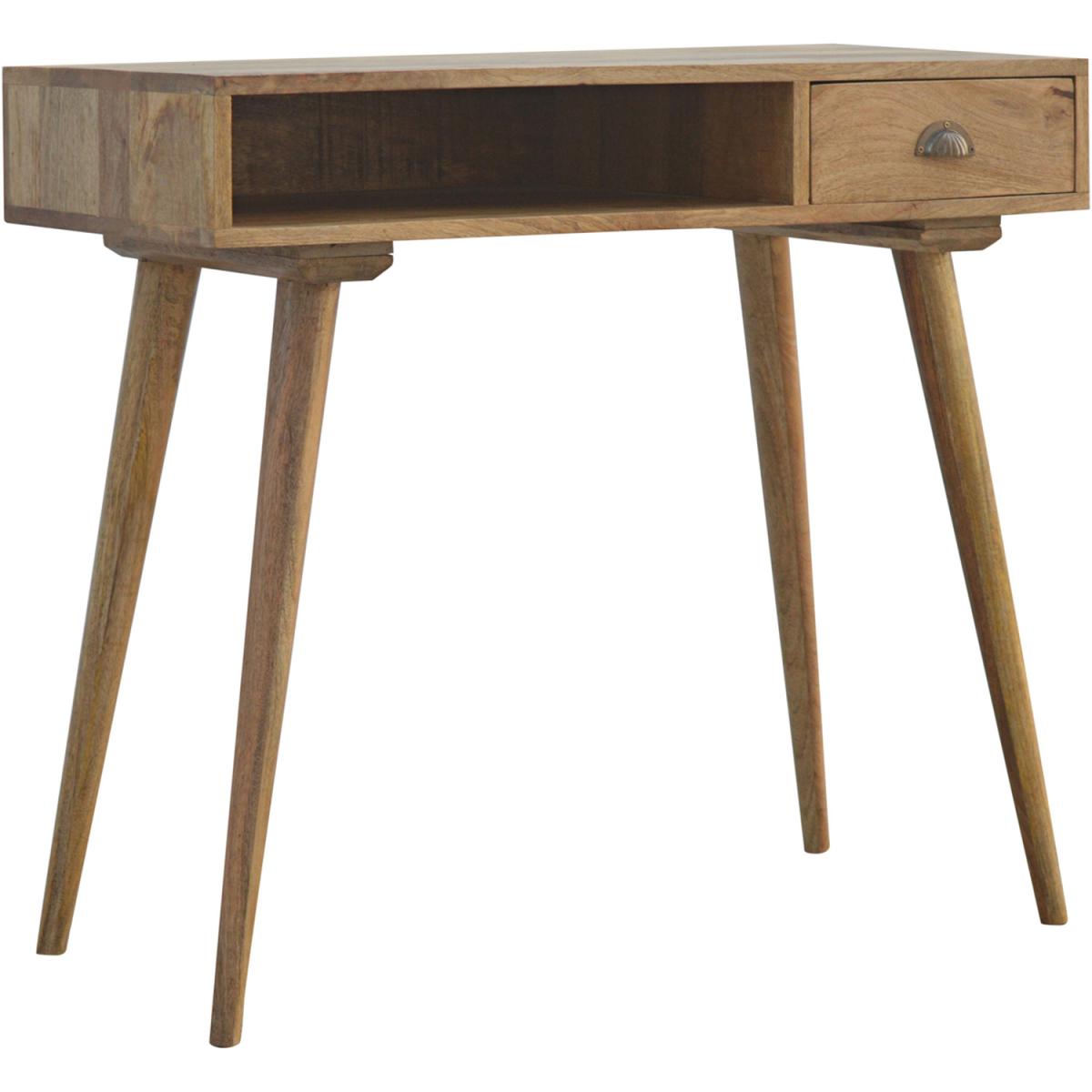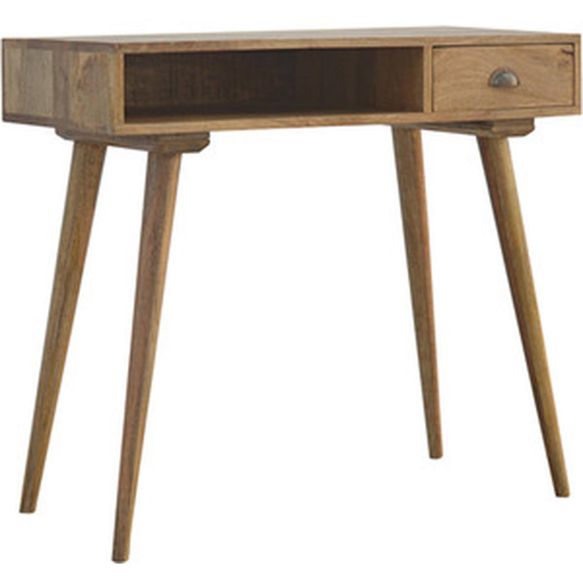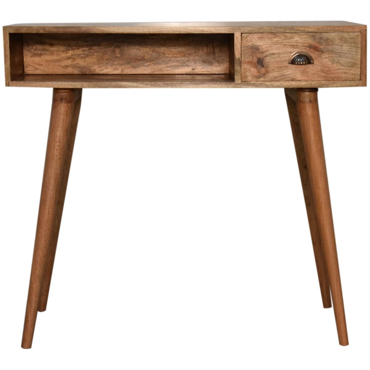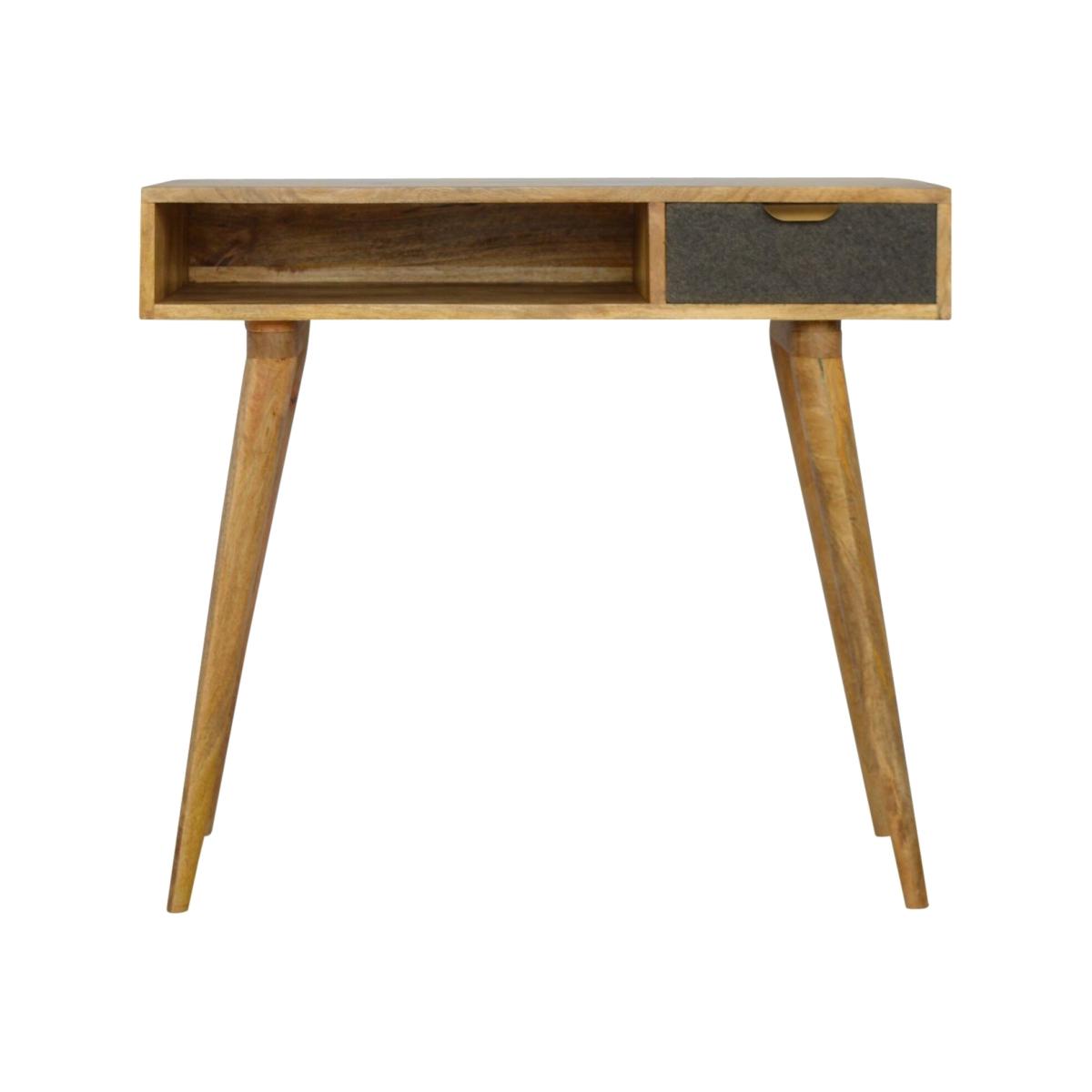 This writing desk has been finished with a fabric front drawer upholstered in a grey tweed to match perfectly with the fabric front bedside table, this writing desk takes a different twist on furniture by incorporating 2 materials and combining them together. It features a solid wood body finished in an oak-ish finish and a golden pull-out handle with 4 Nordic-style legs. It is the perfect addition to both modern and country homes and also open slot which is perfect for studying and keeping any papers, notes or stationary.