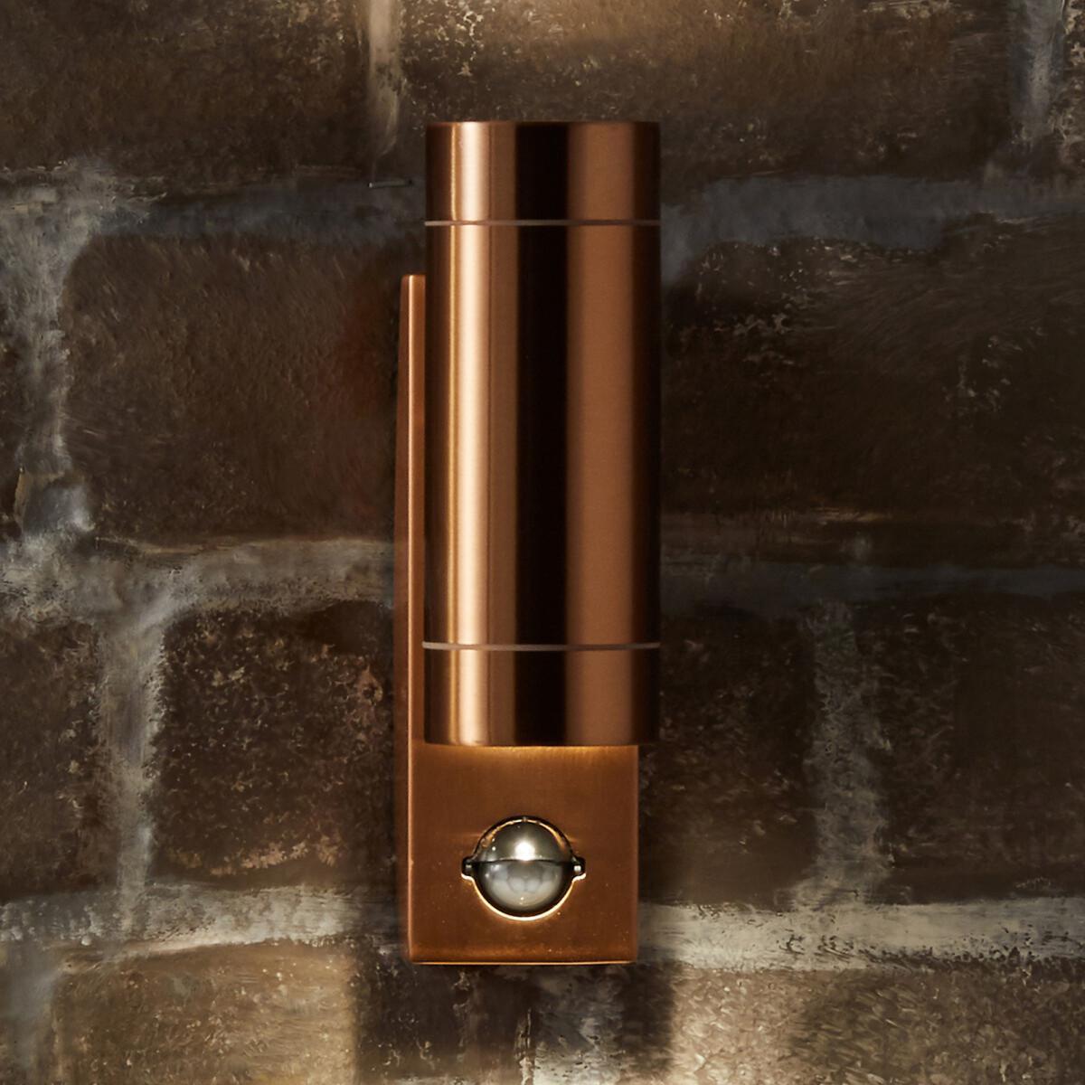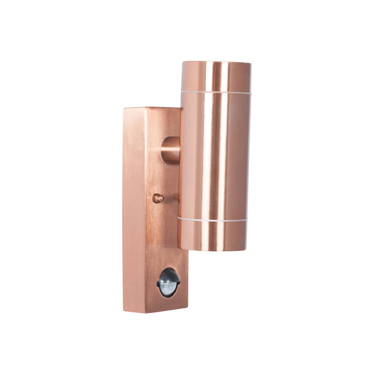 This simple clean lined copper wall light would look perfect outside giving a minimalist look whilst illuminating the wall from above and below. It would look great as a pair either side of a front door and casts a soft light. The head is also adjustable so the light can be focused on an area. As an added feature the lamp has a sensor to allow the lamp to illuminate when near by. Please note bulb is not included Dimensions: L 6cm W 11cm H22cm Bulb Fitting: GU10 Max Wattage: 35W. This product will be dispatched by one of our trusted suppliers. You’ll be contacted by their selected courier about your delivery.