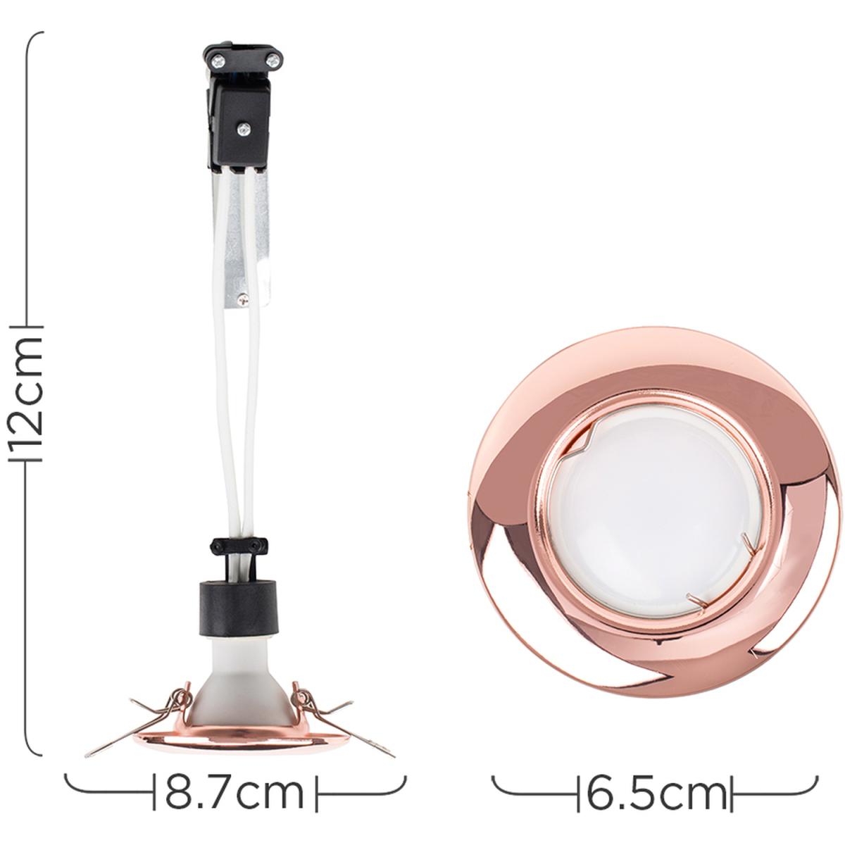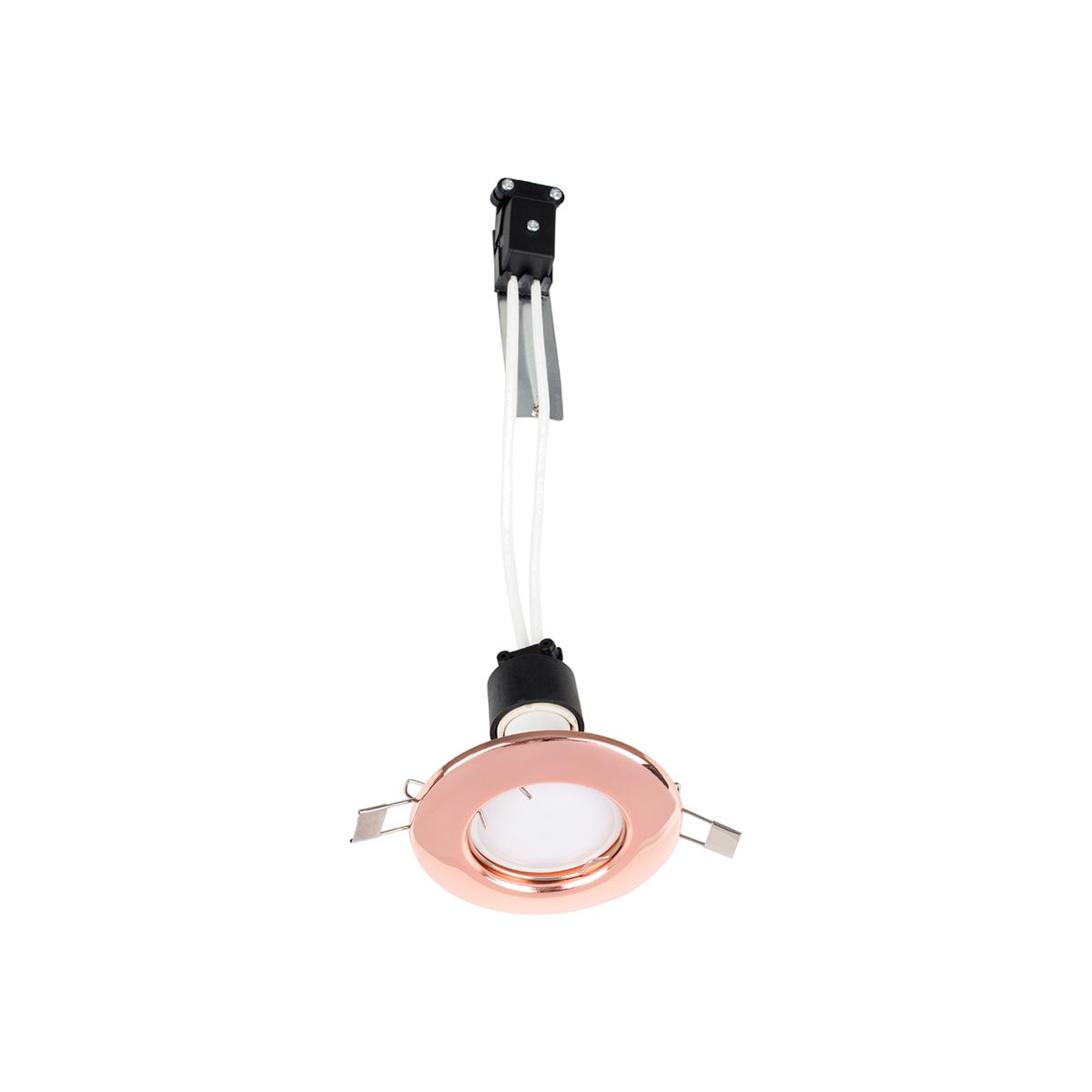 Quality mains GU10 recessed downlight in a copper finish, offering a very modern and contemporary look to whichever room you place it in. Comes complete with terminal block, GU10 lampholder and bracket. Features metal spring clips for easy installation. No transformer required - simply wire directly to the mains. Supplied with product guidelines and full fitting instructions. With a variety of colours available, you can easily find one to match your interior design scheme. For a particularly simple and minimalist look, this copper spotlight would be ideal. Suitable for use with regular halogen or LED GU10 bulbs.