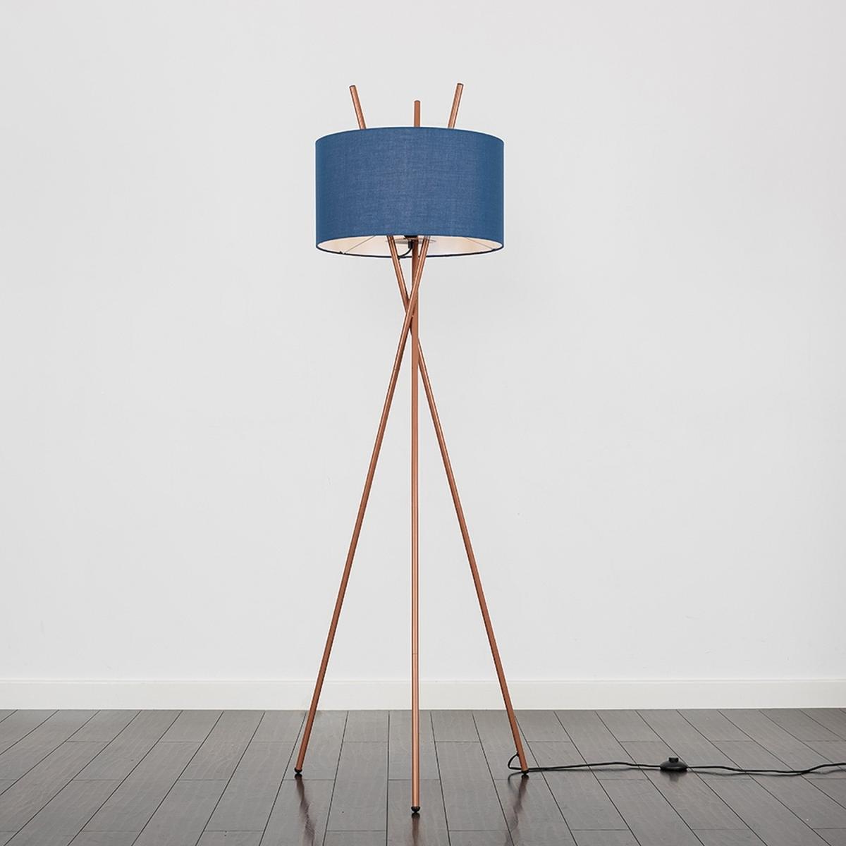 Crossover design tripod floor lamp in a copper effect metal finish. Comes complete with an extra large navy blue fabric cylinder lamp shade, and features an in-line onoff foot switch for easy use. Floor lamps are a great way to bring additional lighting to a room. Ideal for lounges, hallways, bedrooms and other areas around the home.