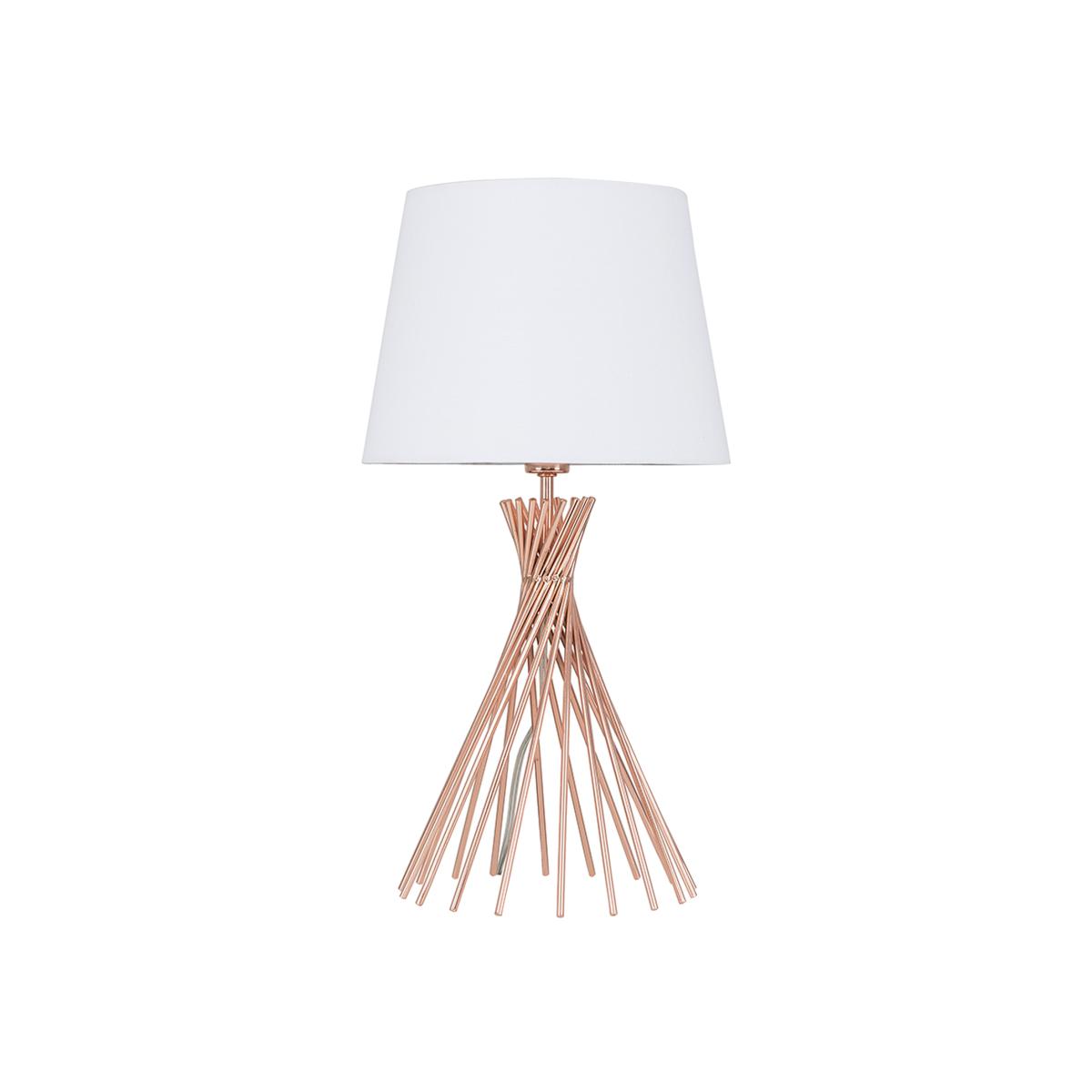 Modern twisted metal wire design table lamp in a copper effect finish, complete with a white polycotton tapered light shade. Features an in-line onoff switch for easy use. Table lamps are a great way to bring additional lighting to a room or you can use them reduce your main light output, and create a more relaxing moodatmosphere.