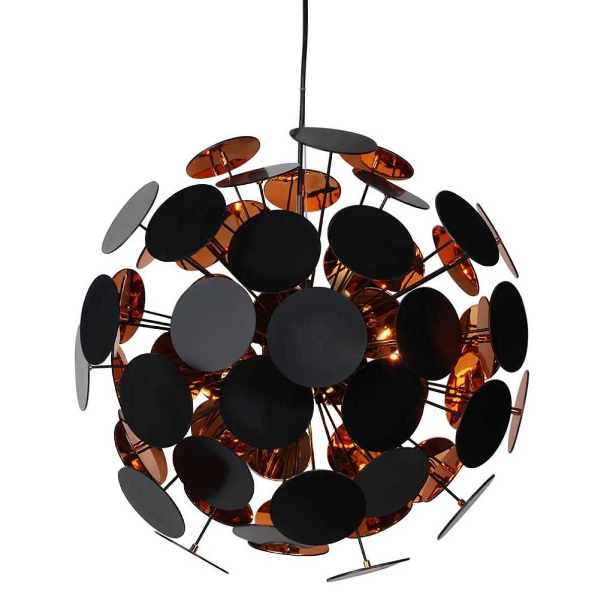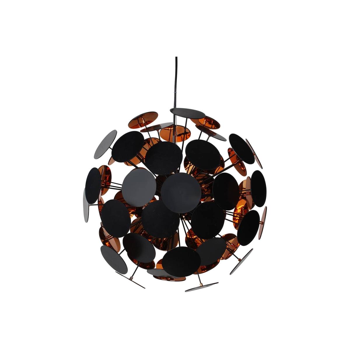 Contemporary pendant ceiling light boasting a matt black and copper finish.. The Copperhead 6 Light Ceiling Light is a stunning fitting exclusive to Pagazzi Lighting. The light is ball in shape, created by a number of discs sitting on black rods. Each disc boasts a matte black exterior and metallic copper inner. The fitting is suspended from a matte black domed ceiling cup, via a black flex with clear suspension cable. The centre of the piece is matte black metal with black lamp holder covers.. We recommend using our 3w LED G9 capsule bulbs which are a great replacement for standard halogen bulbs.
