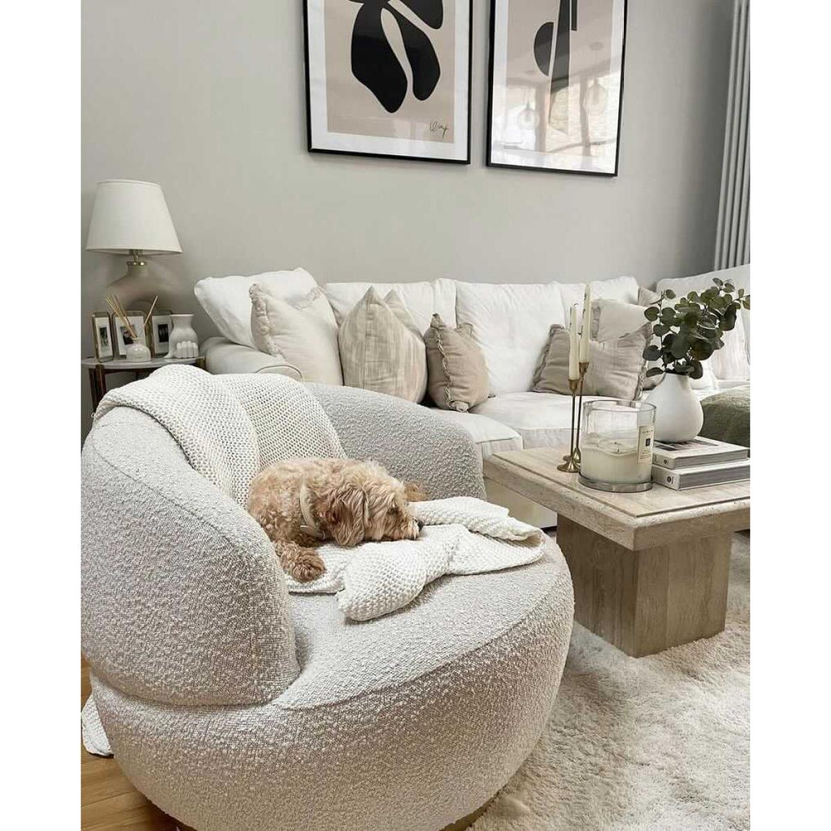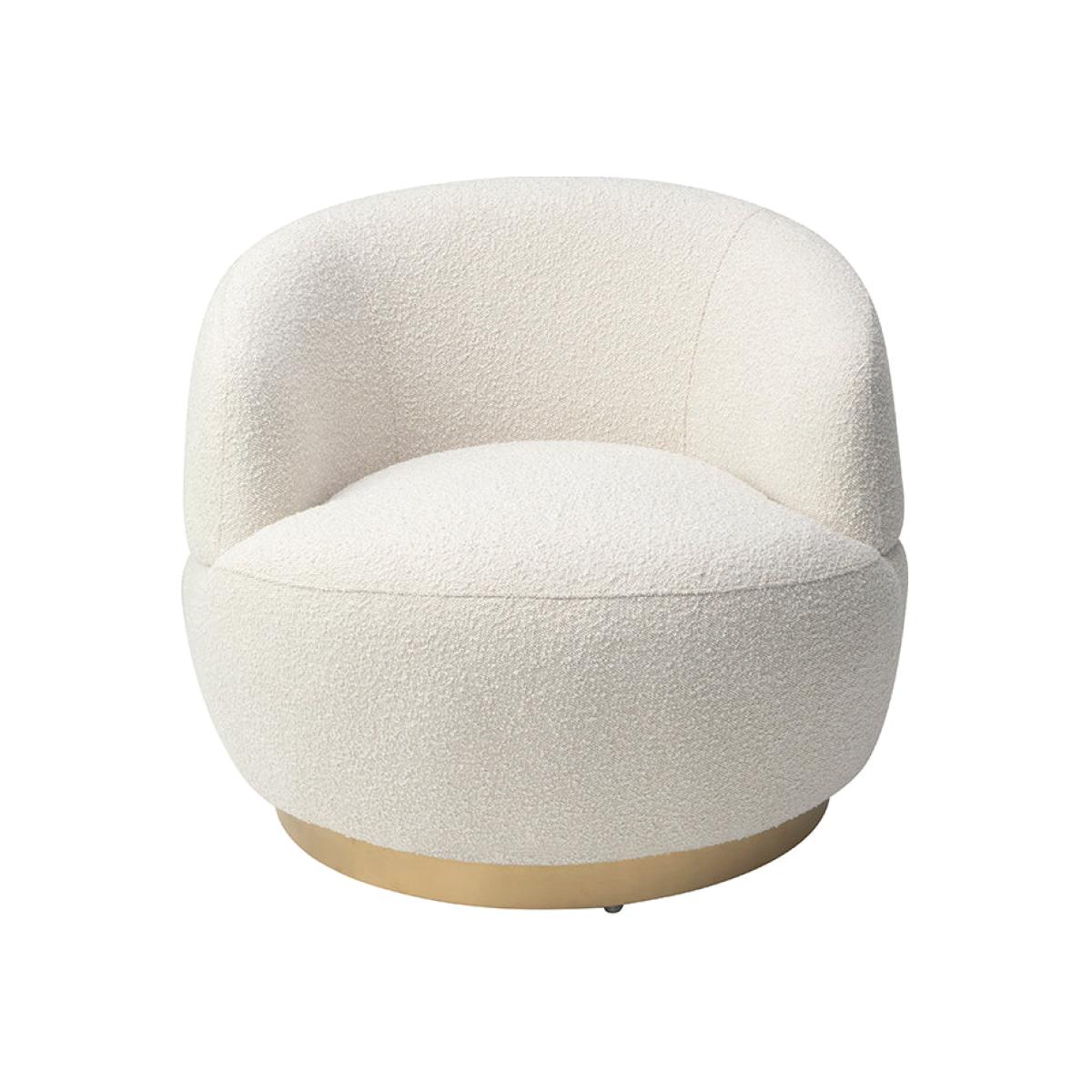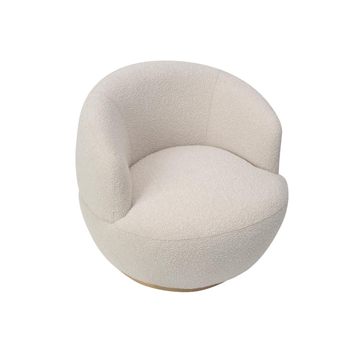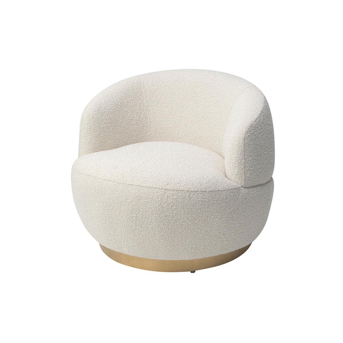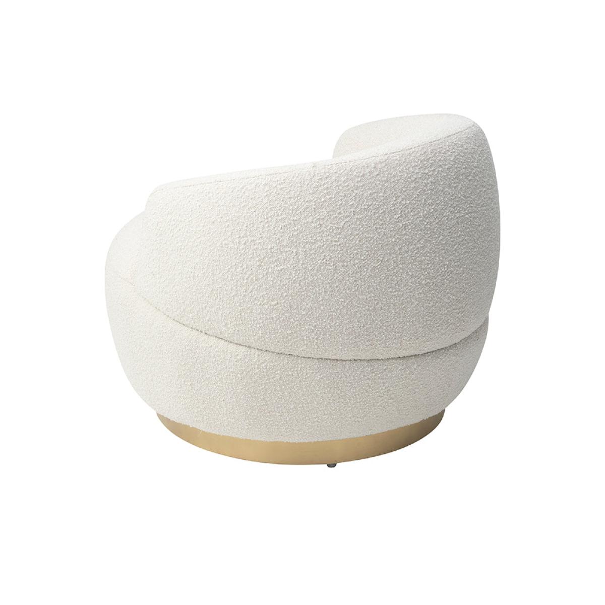 In a neutral sand colour, this rounded occasional chair is a perfect complement to any space in your home. Its sleek and attractive design creates a beautiful focal point, without appearing intrusive and the soft, wraparound backrest is ideal for settling comfortably into. Created by luxury designer Liang & Eimil, this boucle chair is sophisticated and, measuring in at 84cm wide and 88cm deep, combined with its 360 degree swivel base, is designed to fit into the cosiest of spaces. However, with its bold, brushed brass base, it is a striking statement piece, suitable for any size or style of room. Dimensions: W:84 x D:88 x H:70.5 cm
