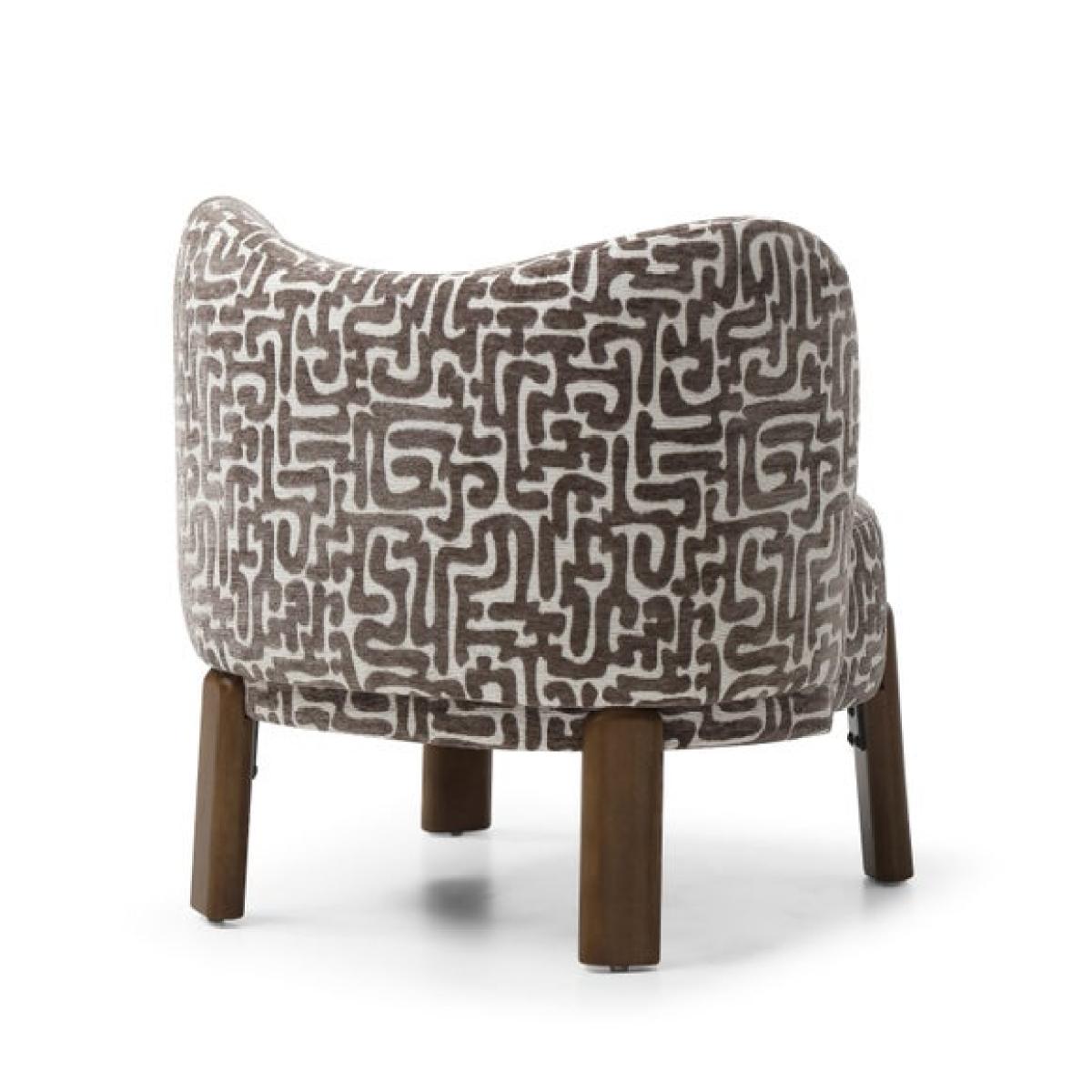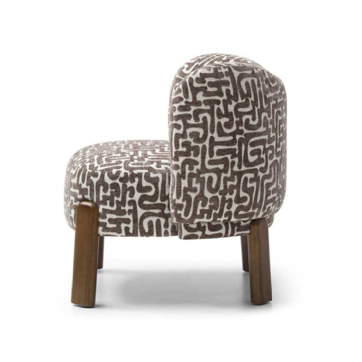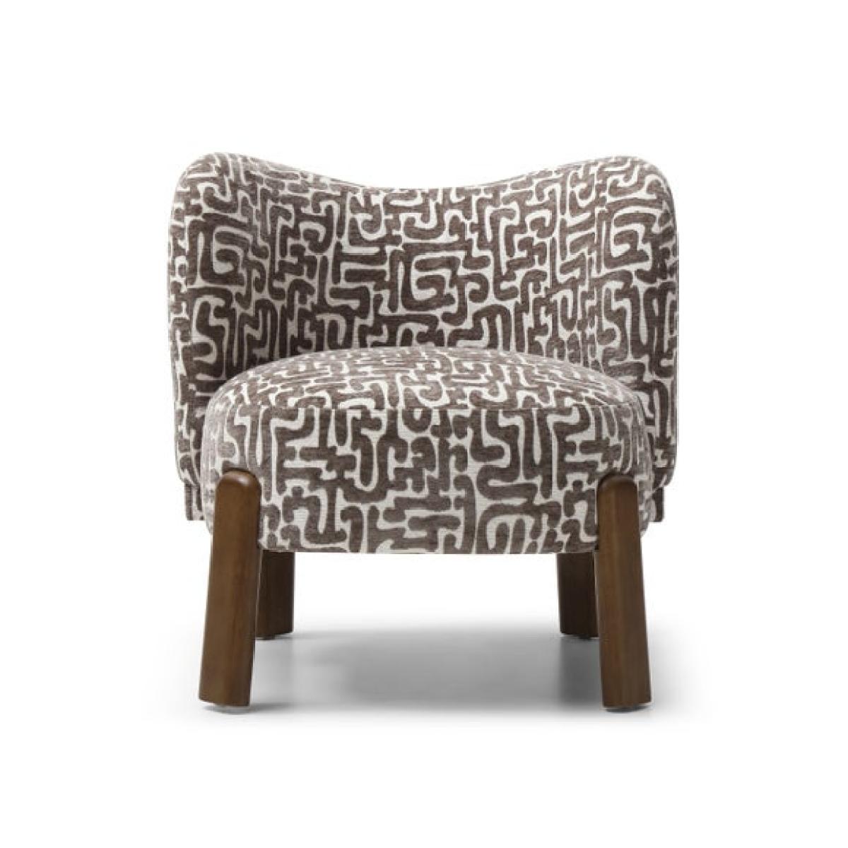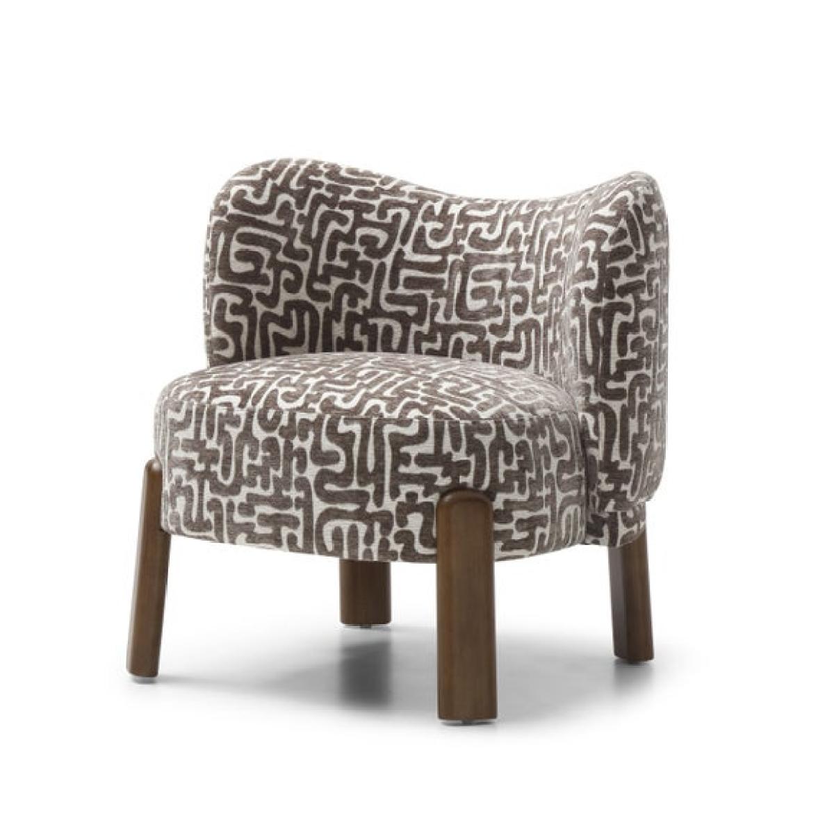 * Bold accent chair * Curved lines * Plump cushions * Soft upholstery The Cora accent chair is a striking piece that effortlessly combines bold design with everyday comfort. Its sculptural silhouette, defined by elegant curved lines and a generously cushioned seat, makes it a standout addition to any room. The upholstery features a dynamic pattern that adds visual interest and personality, while the sturdy, chunky wooden legs ground the design with a sense of strength and stability.