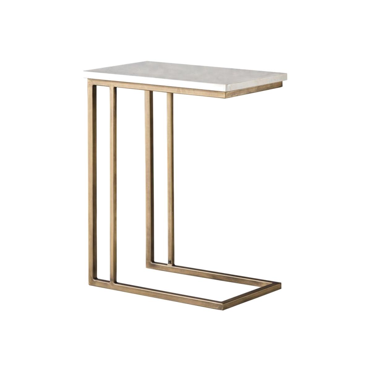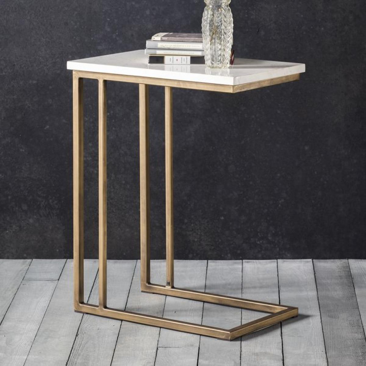 A contemporary supper / sofa table featuring Spanish volkas marble in white with grey vein detailing in the grain and a brushed bronze angled metal base. This neo classical style will suit a multitude of interiors designed as a side sofa table or a TV supper table. Material:Marble. Colour/Finish: White.