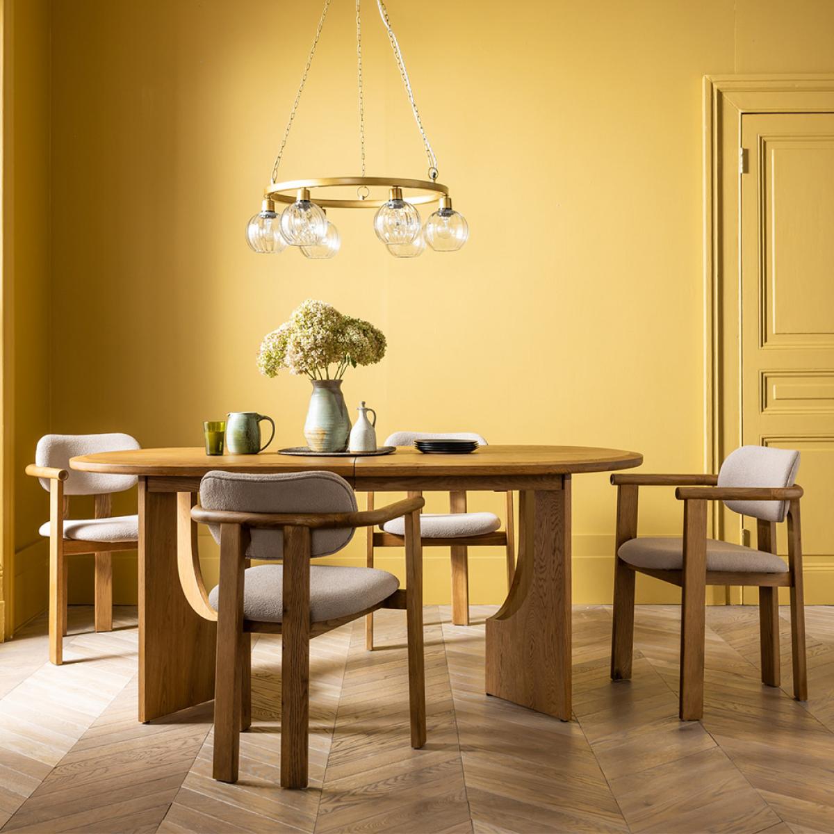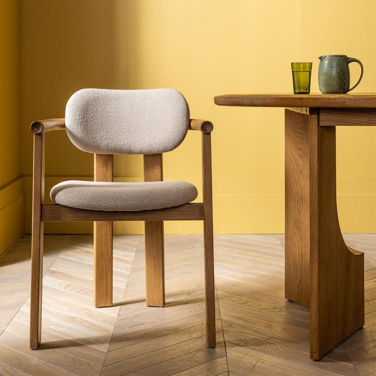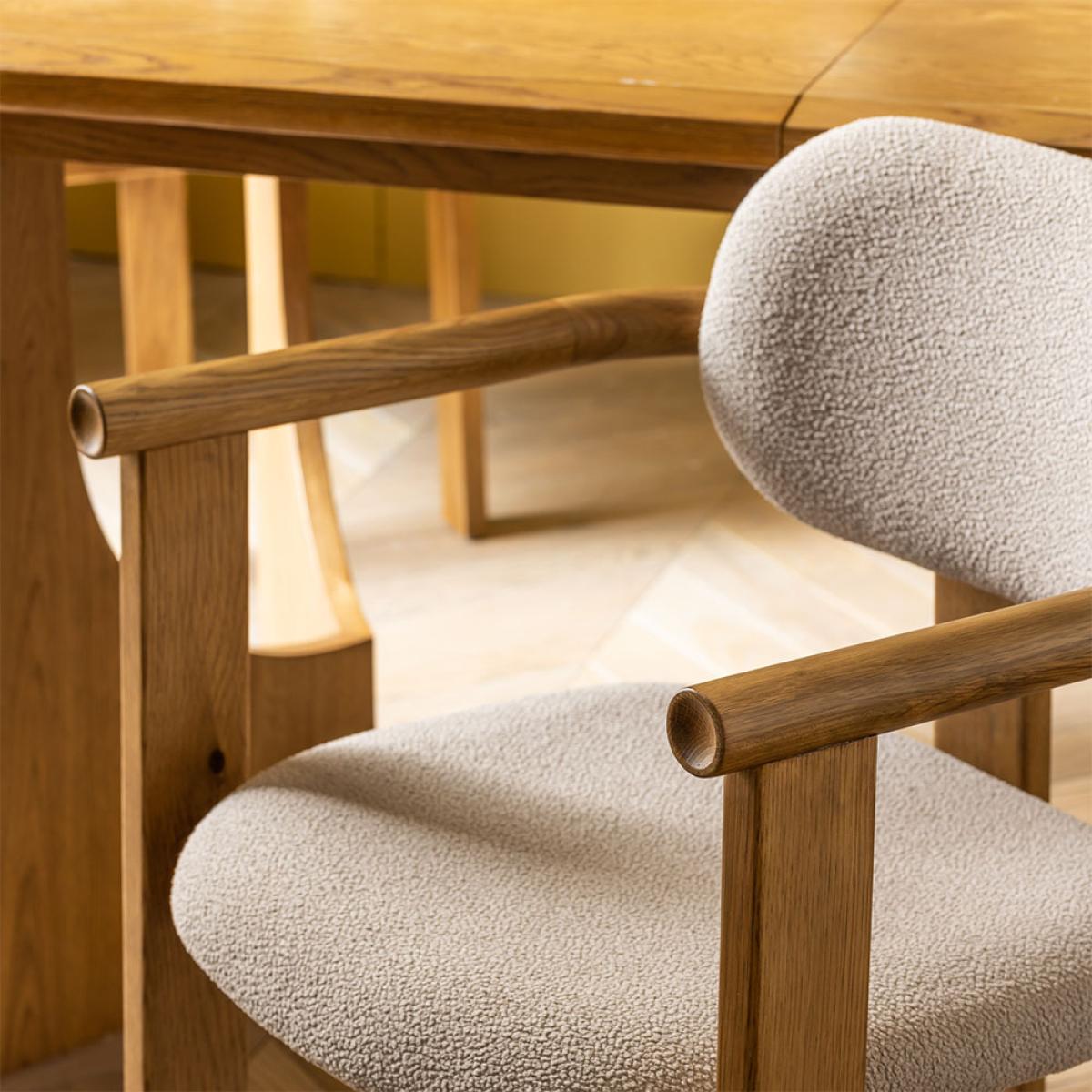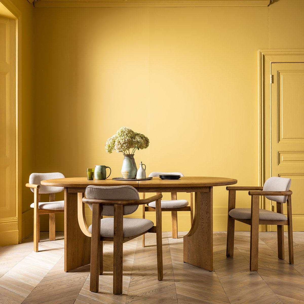 Our boucle and oak dining chair is worth making space at the table for. Curved-back dining chairs like Cora are on-trend but also have a timeless, mid-century appeal. These solid honeyed-oak chairs are characterised by a swooping backrest that cradles your body comfortably, combined with neutral cream boucle upholstery to add an extra layer of luxury. Elegant legs add a little something extra. It’s made from solid oak that’s built to last in a warm bourbon finish and pairs well with the Umi extending table to complete the look. Pull up a seat for the best seat in the house. Also available in olive green boucle
