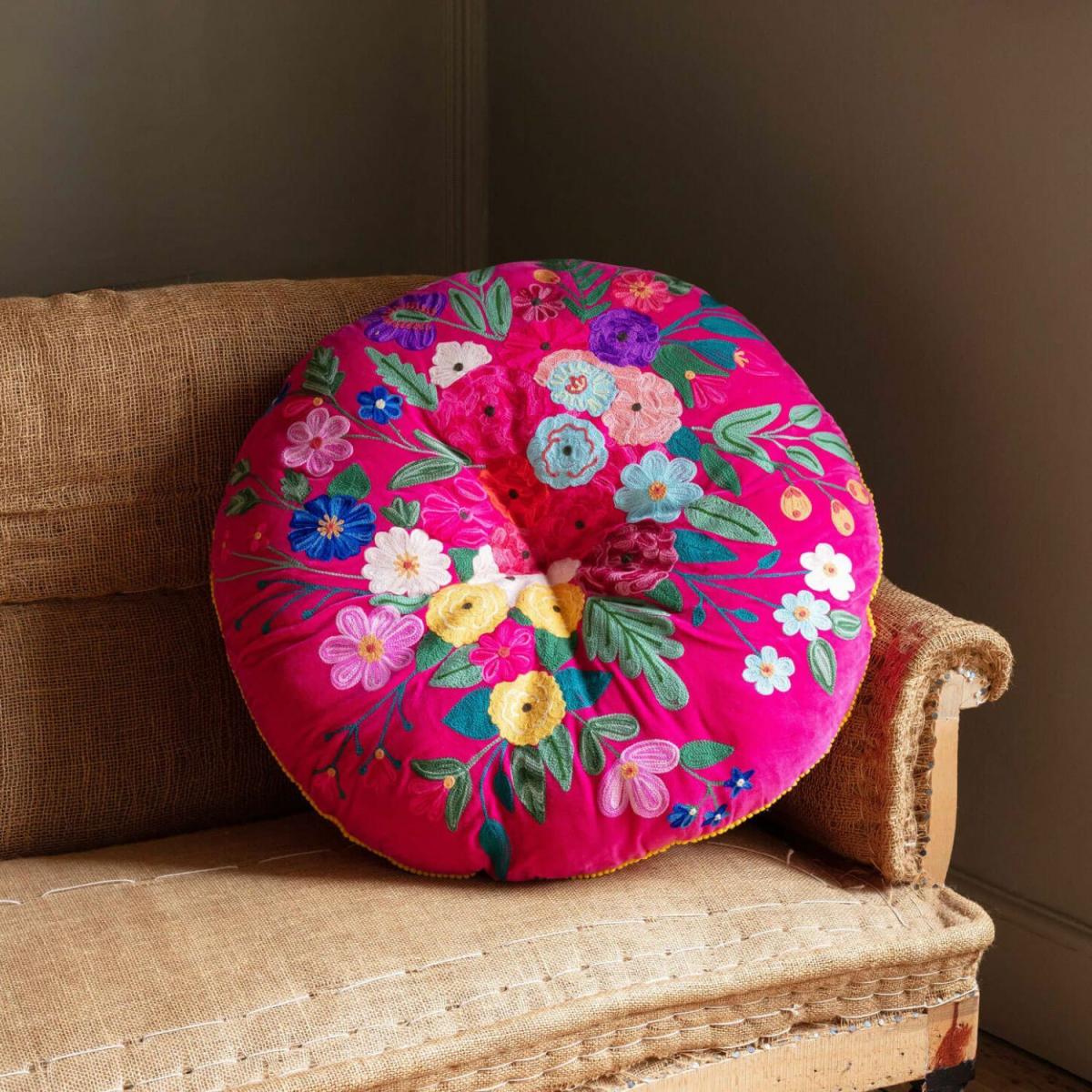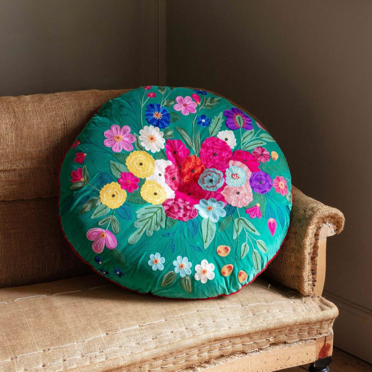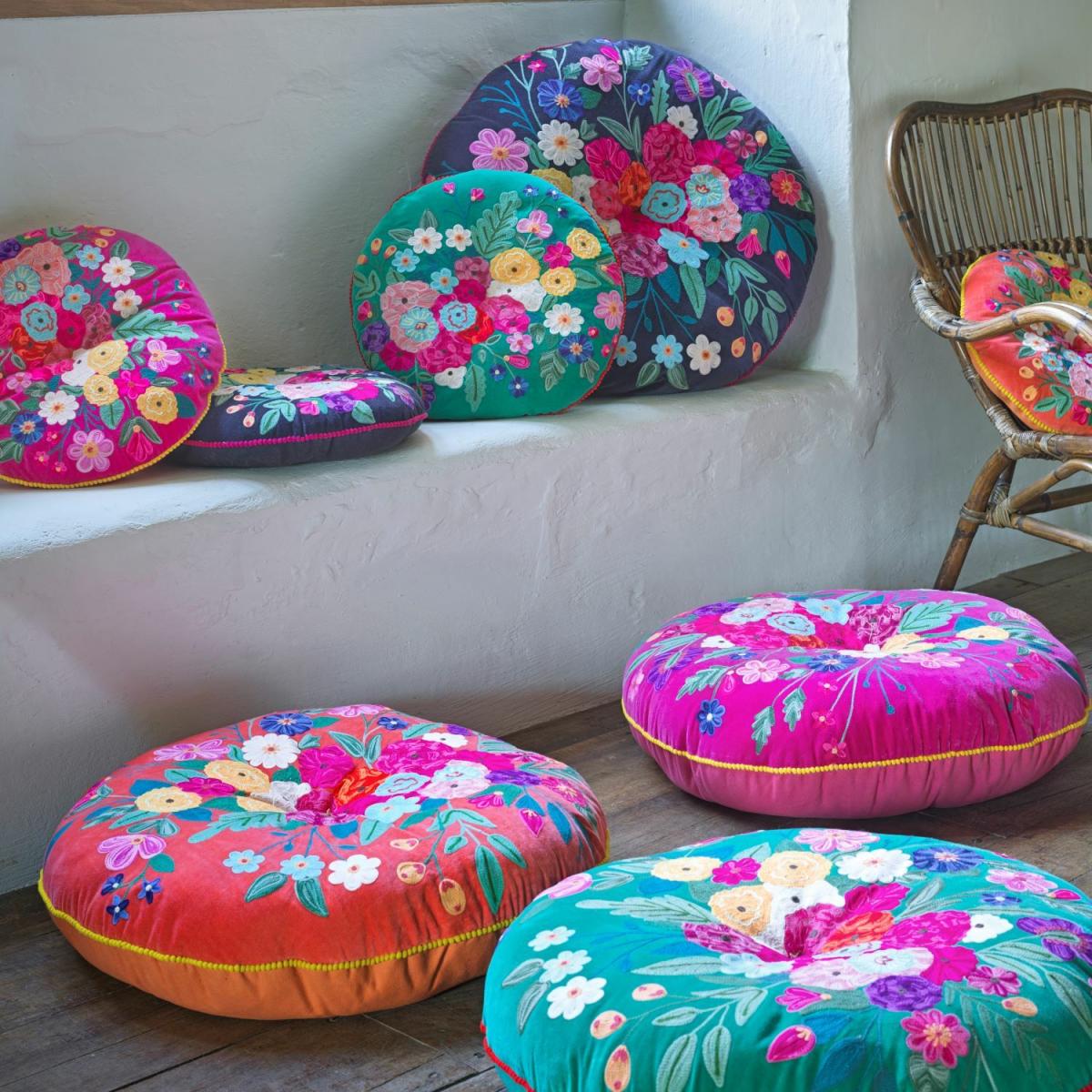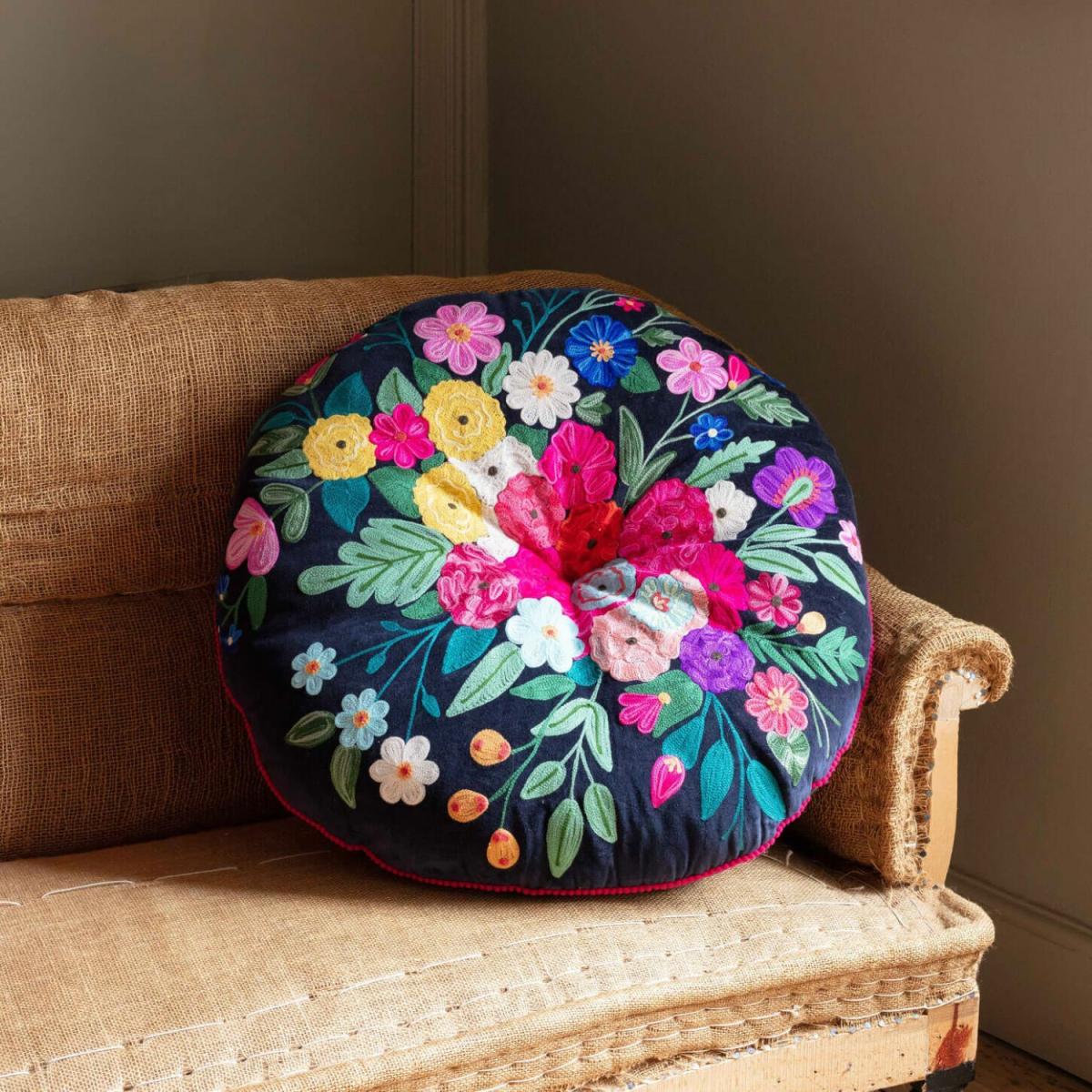 Adorned with an assortment of brightly coloured embroidered flowers on a jewel-toned background and finished with a contrasting pom pom trim. Each flower has been crafted by artisans on hand-driven machines that can take up to ten years to master. It's that human touch which means each cushion will be slightly different and unique. Diameter: 75cm. Made from a 100% cotton outer with a polyester fibre filling. Embroidered on hand-driven machines, so each design may be slightly different. Spot clean only, covers not removeable.