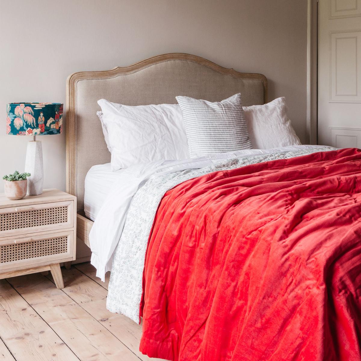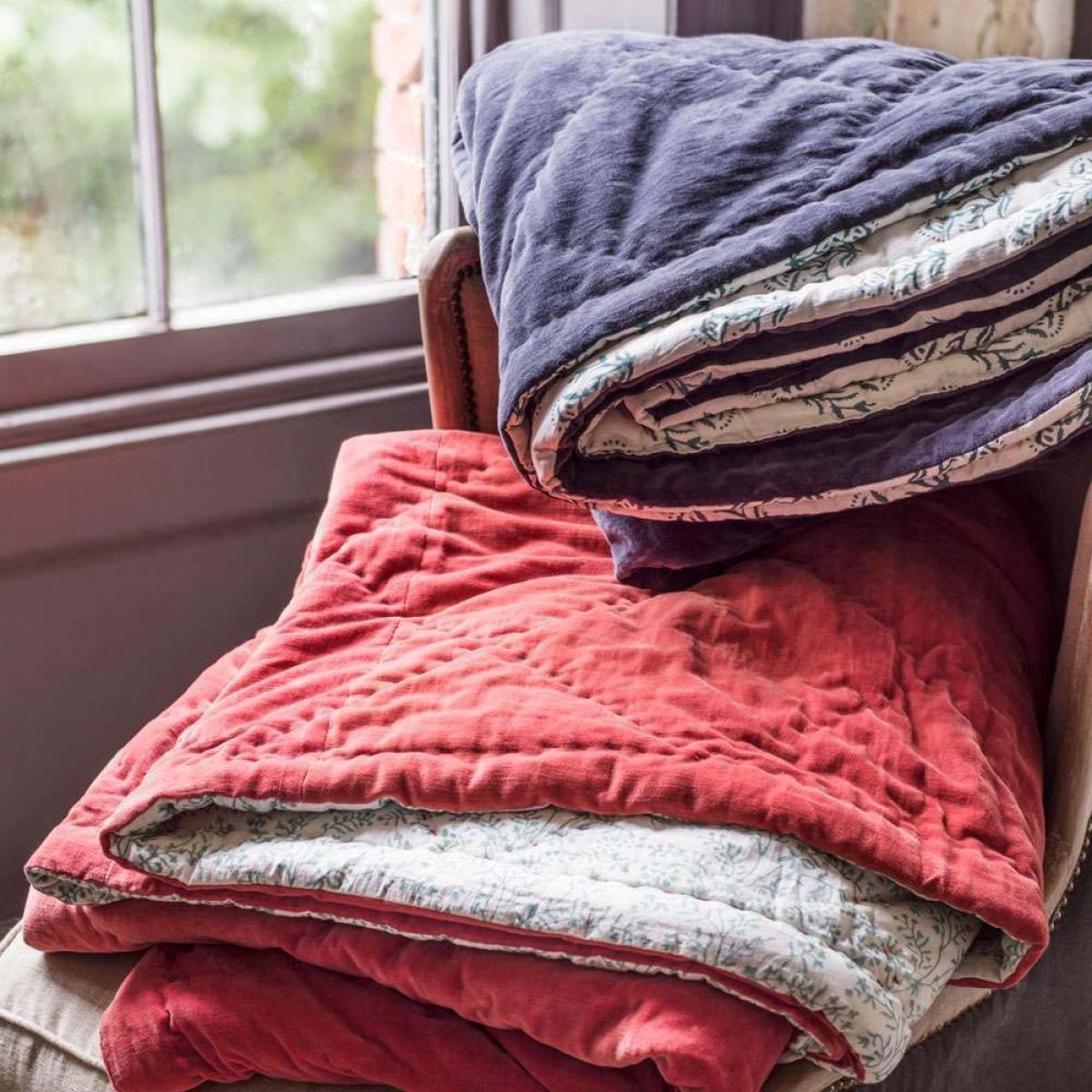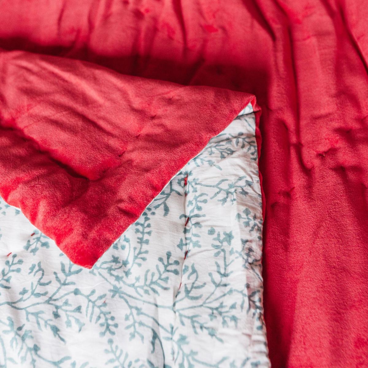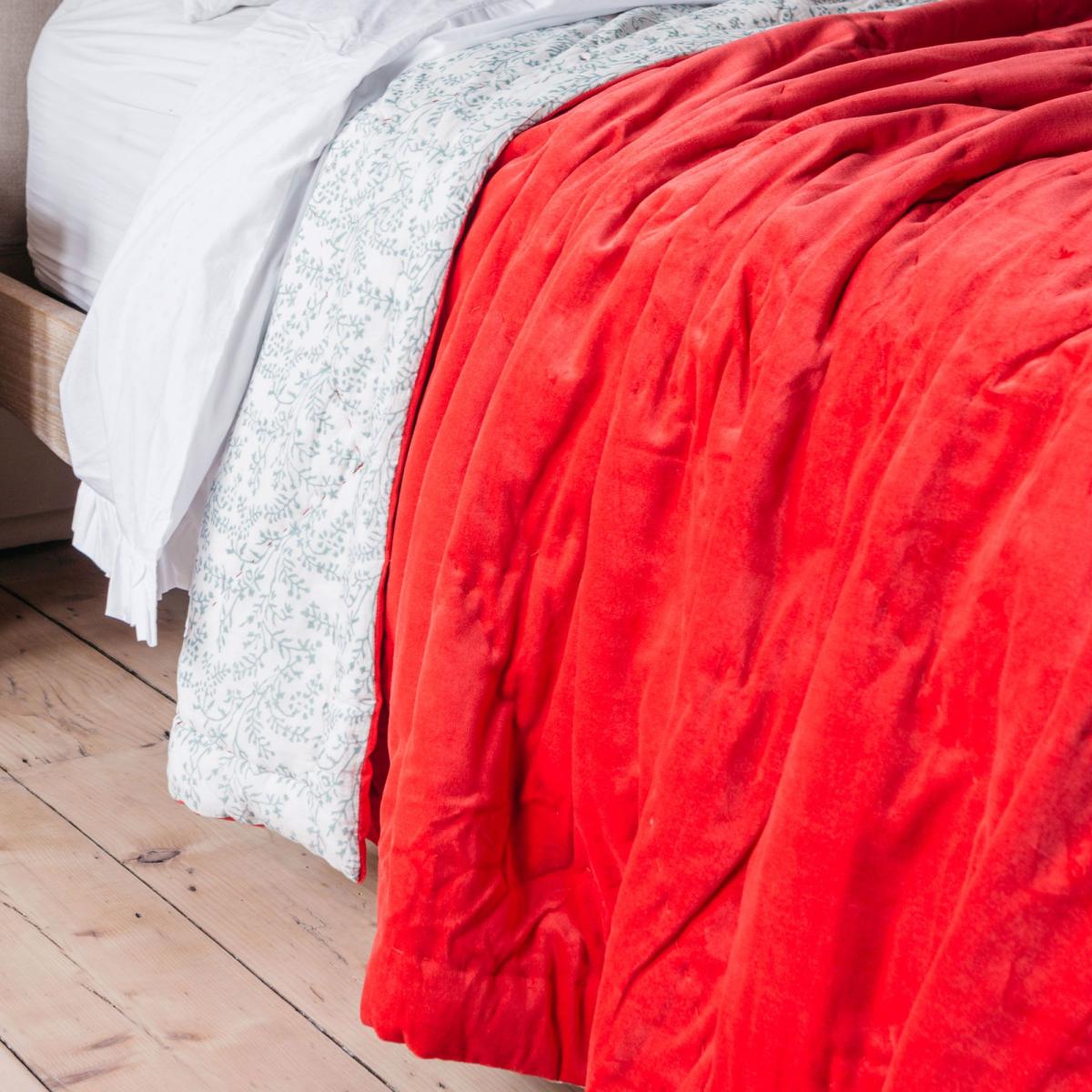 Our velvet quilts are luxurious and decadent. The quilted coral red velvet is soft to touch and showcases a cotton reverse that has been adorned with a hand-blocked print inspired by floral Indian patterns.