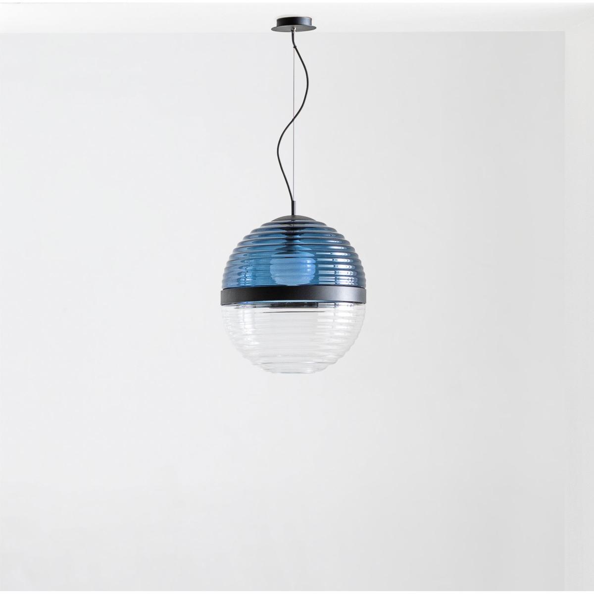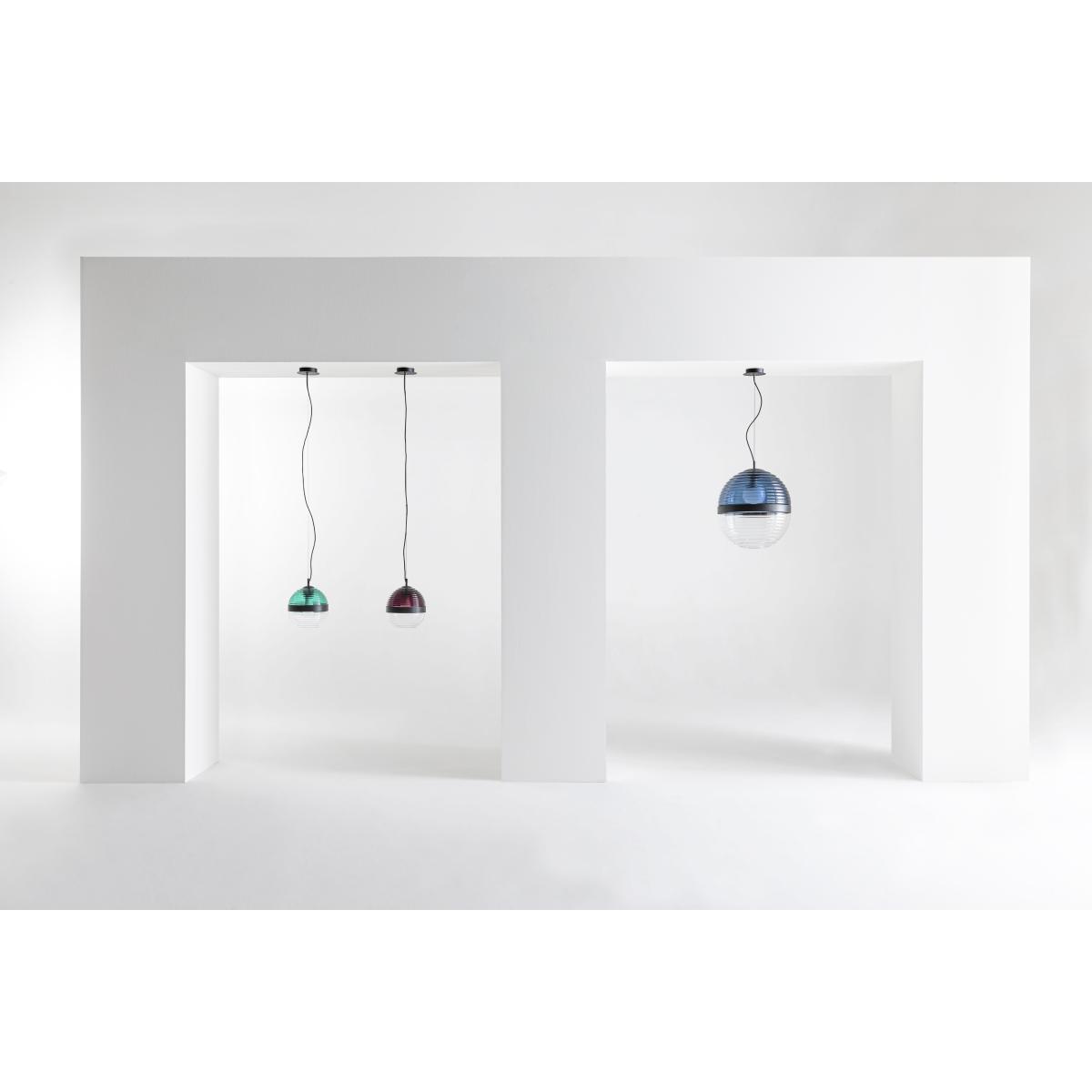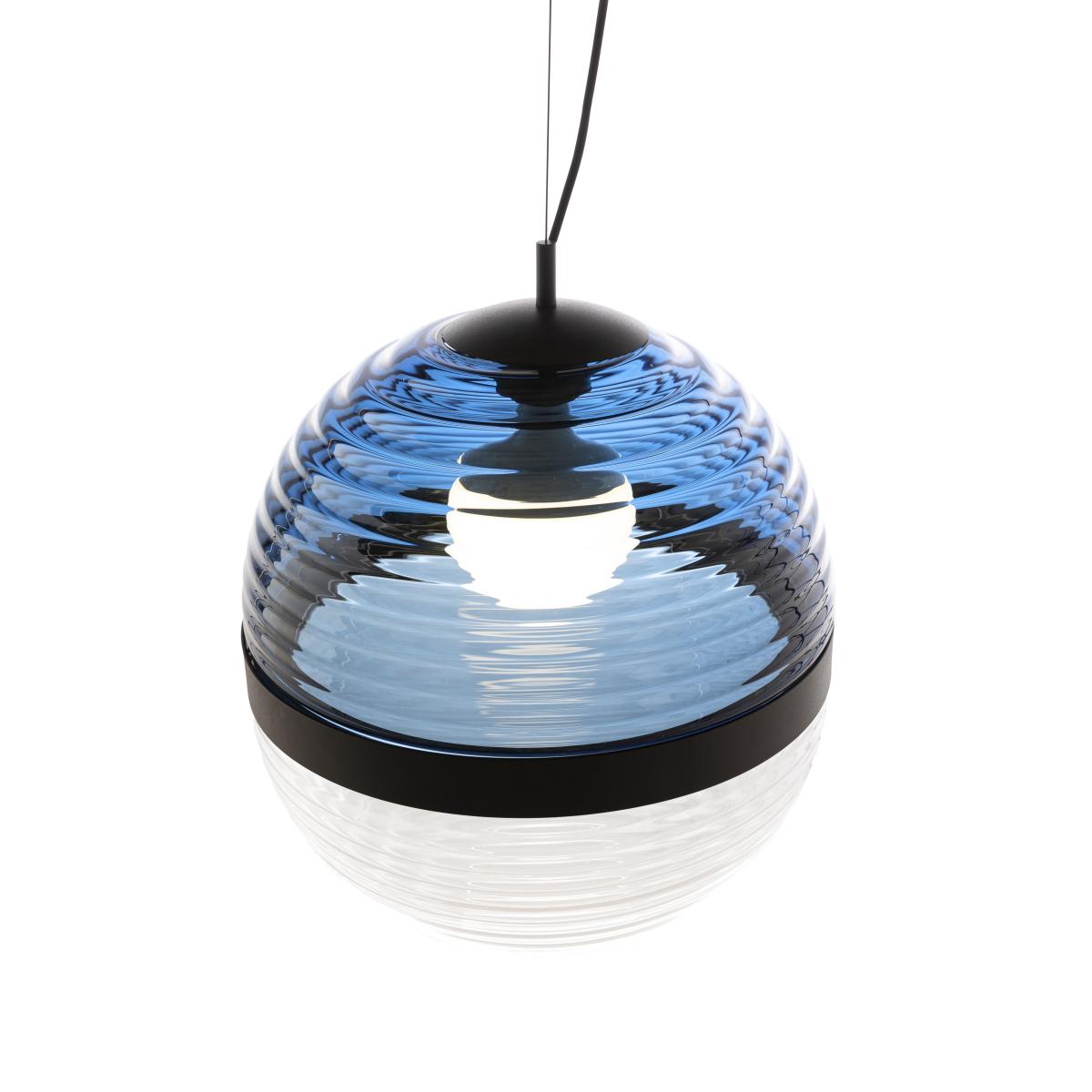 The Cord pendant light from German designer Werner Aisslinger is a blend of contemporaneity and tradition. It's made up of a two-tone sphere made by combining two ridged, blown-glass spheres which are connected by a black metal ring. The lower element is transparent, whilst the upper element is coloured. These alternating colours and transparencies give the Cord Lamp the perfect balance between past and present. The Cord pendant light creates a warm, embracing light. The glass shells are created by master glass-blowers. Given the hand-crafted manufacture of the glass, any air bubbles or colour variations are added value for the design.