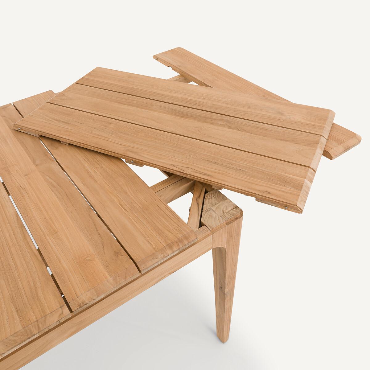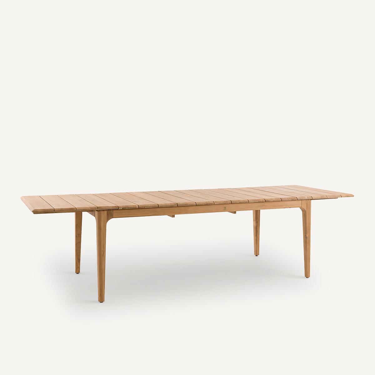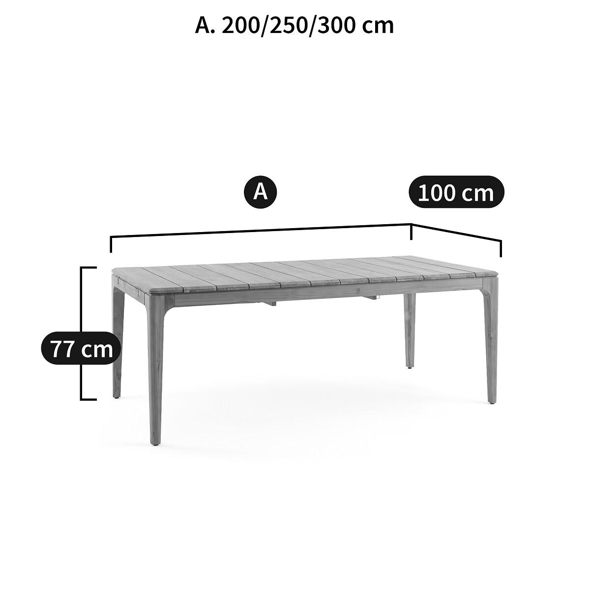The elegant Cordano garden table combines timeless design and functionality. A system of extensions allows the top to be enlarged to accommodate up to twelve guests.. The two sides of the top move to make room for the two removable extensions. The tapered legs and clean silhouette accentuate the finesse of the piece of furniture. Designed in-house, the Cordano table invites you to enjoy every moment outdoors. Product Details • FSC® Solid Teak • Slatted tabletop • 2 extensions matching the top slide between the edges and the central top • Slightly tapered legs • For 12 guests Quality Info Solid teak is ideal for outdoor use. It is impregnated with an oil which ensures its durability and resistance to bad weather and attacks by insects and fungi. Care Advice • Low temperatures are likely to affect the proper functioning and surface condition of your outdoor furniture.. • We therefore advise you to store it in a dry, ventilated and enclosed space.. We strongly advise against the use of a tarpaulin, as it will act as an oven and damage the surface conditions; wood and metal products are particularly concerned. • Before storing, remember to clean and dry the products thoroughly, to prevent the appearance of mould or unpleasant odours.. • In any case and whatever the material, it is not recommended to leave the furniture outside without protection, particularly during bad weather and the winter phase. Dimensions • Length: 200/250/300 cm (2 sets of extensions possible) • Height: 77cm • Depth: 100cmDelivery:. Requires assembly of the feet. Note! Please check that all access points are large enough to accommodate your delivery (doors, stairs, lifts). • WOOD FROM SUSTAINABLY MANAGED FORESTS. FSC® certified wood comes from forests that are environmentally, socially and economically well managed. Dimensions and weight of parcel1 parcel • L208 x H21 x D108cm, 70kg