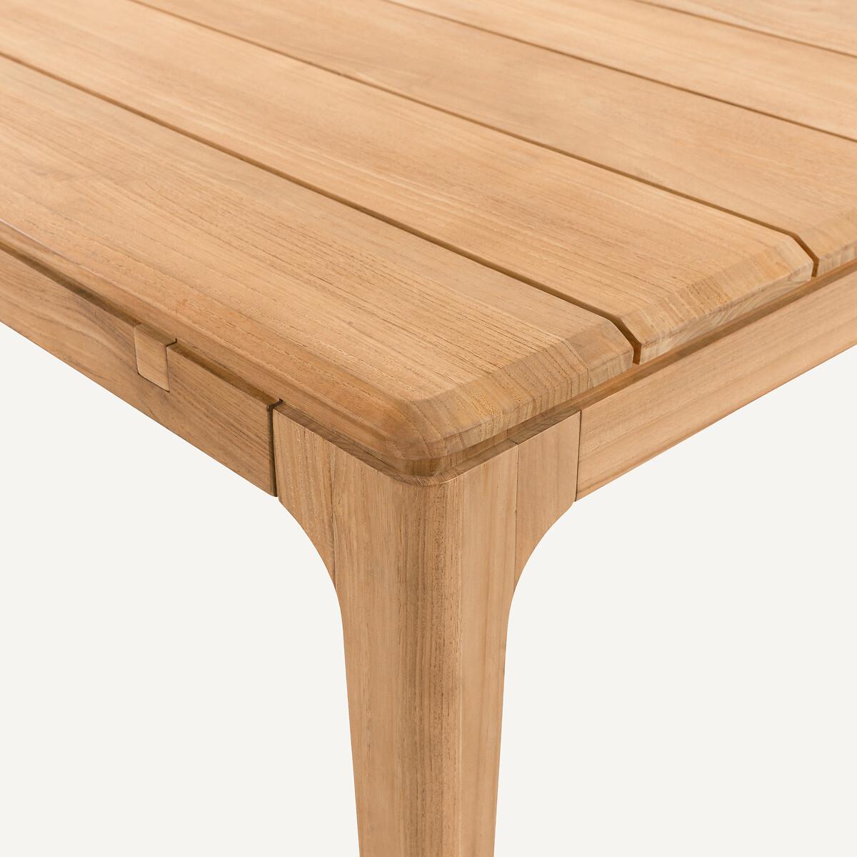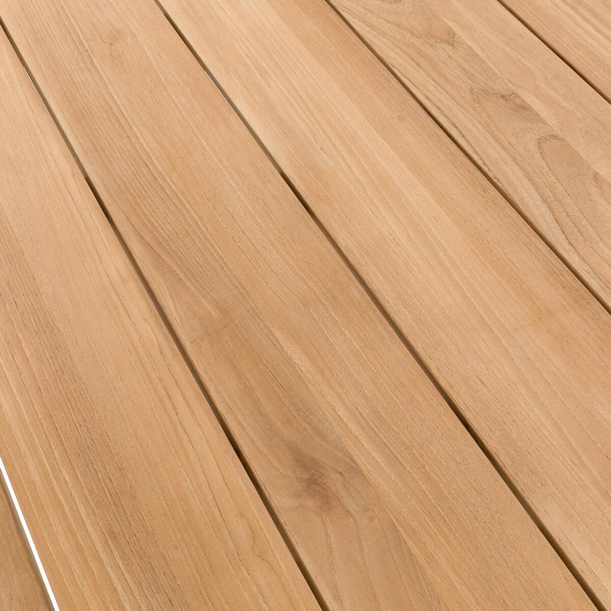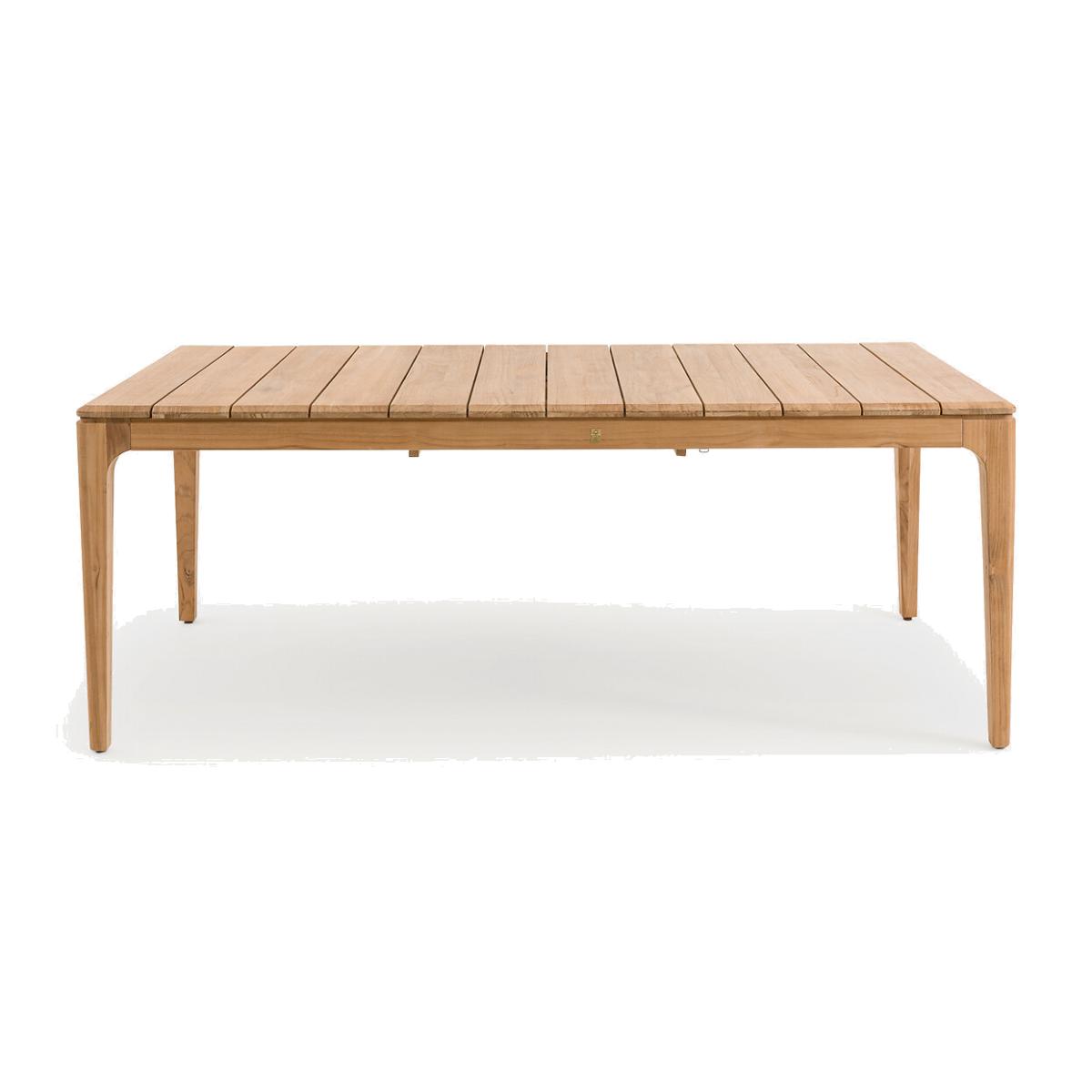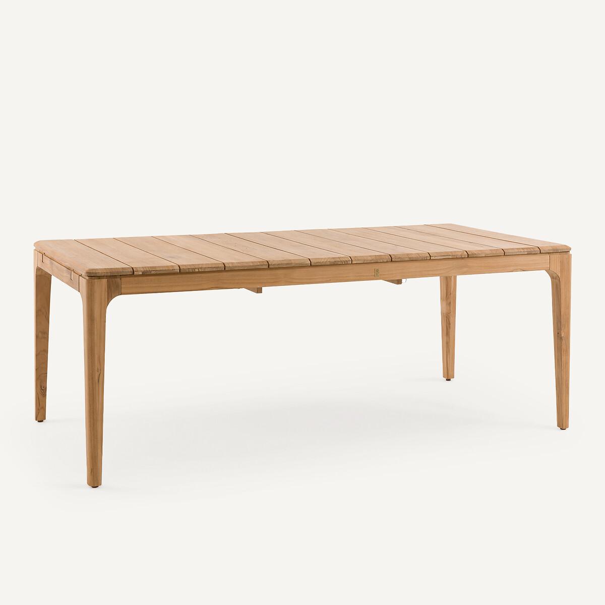 The elegant Cordano garden table combines timeless design and functionality. A system of extensions allows the top to be enlarged to accommodate up to twelve guests.. The two sides of the top move to make room for the two removable extensions. The tapered legs and clean silhouette accentuate the finesse of the piece of furniture. Designed in-house, the Cordano table invites you to enjoy every moment outdoors. Product Details • FSC® Solid Teak • Slatted tabletop • 2 extensions matching the top slide between the edges and the central top • Slightly tapered legs • For 12 guests Quality Info Solid teak is ideal for outdoor use. It is impregnated with an oil which ensures its durability and resistance to bad weather and attacks by insects and fungi. Care Advice • Low temperatures are likely to affect the proper functioning and surface condition of your outdoor furniture.. • We therefore advise you to store it in a dry, ventilated and enclosed space.. We strongly advise against the use of a tarpaulin, as it will act as an oven and damage the surface conditions; wood and metal products are particularly concerned. • Before storing, remember to clean and dry the products thoroughly, to prevent the appearance of mould or unpleasant odours.. • In any case and whatever the material, it is not recommended to leave the furniture outside without protection, particularly during bad weather and the winter phase. Dimensions • Length: 200/250/300 cm (2 sets of extensions possible) • Height: 77cm • Depth: 100cmDelivery:. Requires assembly of the feet. Note! Please check that all access points are large enough to accommodate your delivery (doors, stairs, lifts). • WOOD FROM SUSTAINABLY MANAGED FORESTS. FSC® certified wood comes from forests that are environmentally, socially and economically well managed. Dimensions and weight of parcel1 parcel • L208 x H21 x D108cm, 70kg