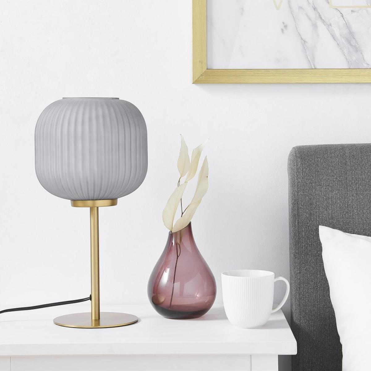 I love this lamp because of its sleek smoky grey and brass finish, which makes it versatile enough to be a statement piece or seamlessly fit into more understated interiors. It works particularly well in modern or contemporary spaces, adding a touch of sophistication without feeling overdone. For styling tips, try placing it on side tables in living rooms with neutral palettes or pairing it with textured fabrics to create a warm, inviting atmosphere. Its compact size also makes it ideal for bedside tables or desks, where task lighting is essential. Using this lamp in layered lighting schemes can bring both ambience and a stylish focal point to your room.