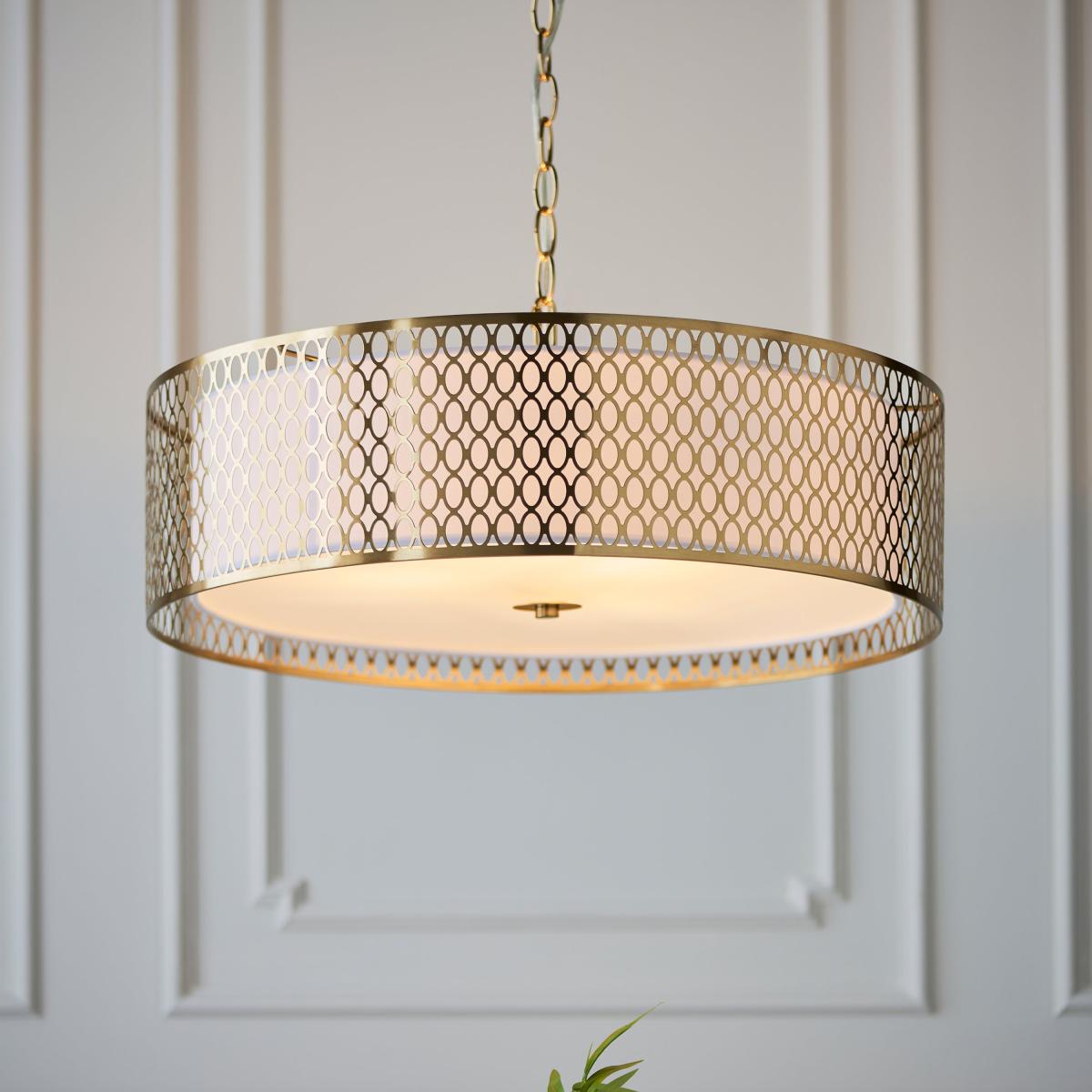 A classic circular light with a trendy geometric fretwork metal outer and an inner fabric shade for lovely light diffusion. As well as being dimmable this product has a height adjustable rope chain so it can be hang to best illuminate the space and create atmosphere.