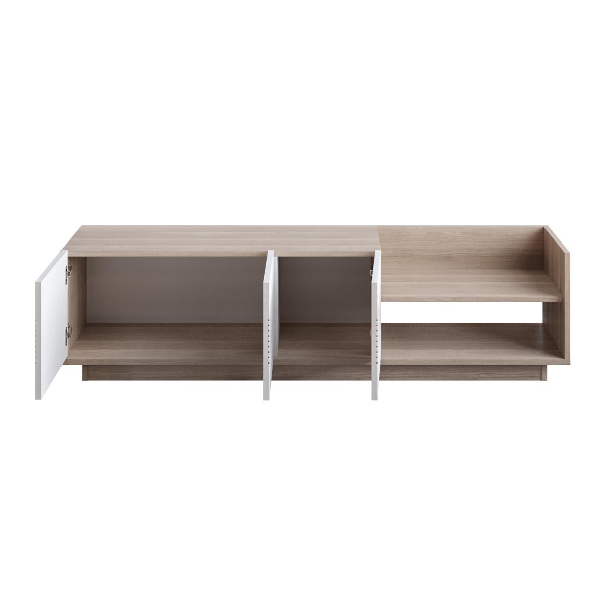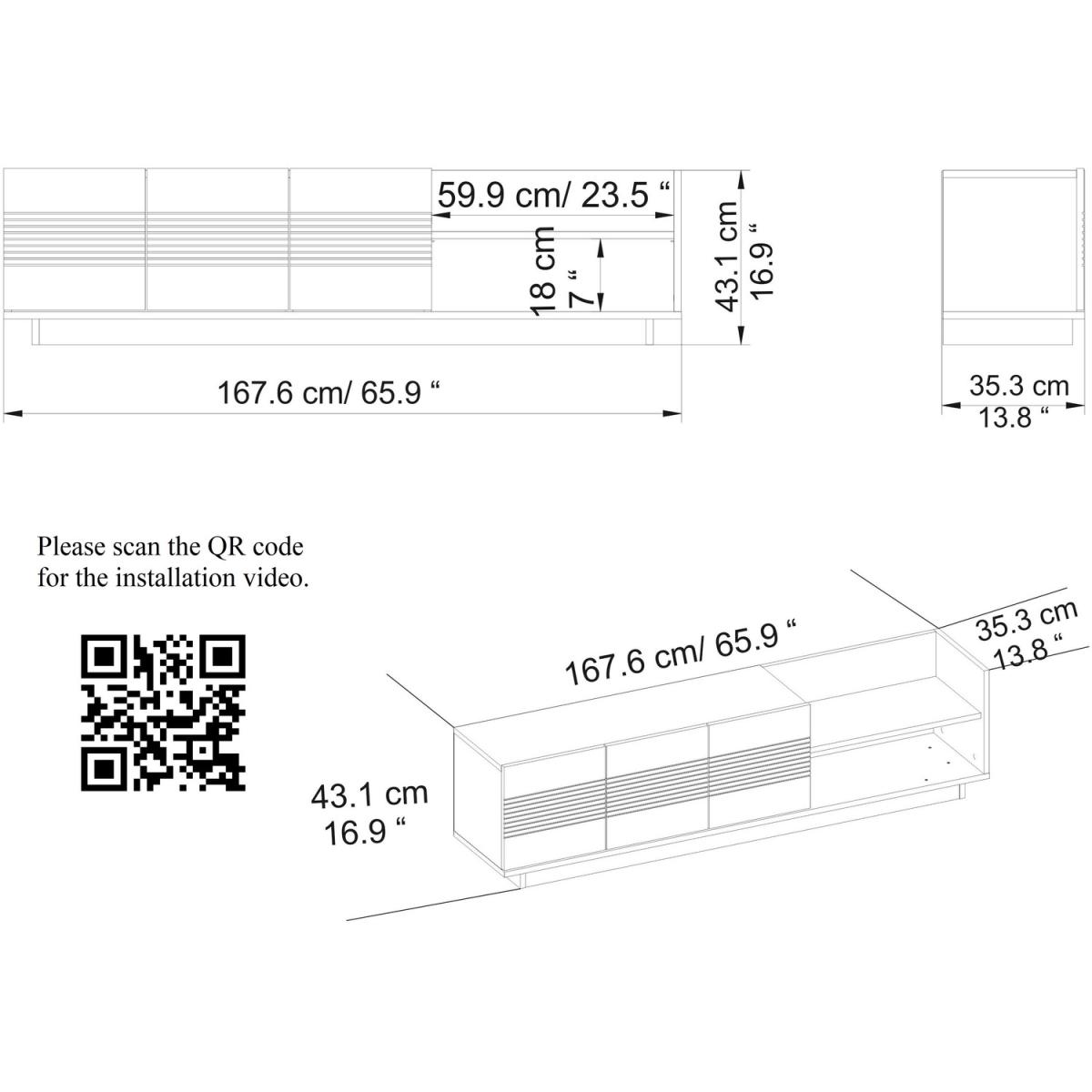 Viana 167 cm wide modern TV stand and media console for TVs up to 47" is designed for larger living rooms. It features 2 cabinets and 2 open shelves, offering huge storage space for your entertainment sets and media collections. Slab doors have no handles. The extended upper edge of the door is used as a handle in this design. Carved straight lines on the doors make the stand more stunning. The media stand is made of an 18 mm thick melamine coated particle board and banded with PVC edge banding tape. It is manufactured using health-friendly materials. The product will be delivered to the customer in the original package as disassembled. It is designed to be assembled by the customer using a power drill and screwdriver. Assembly instruction and installation hardware are included in the package. For fast and error-free installation, product parts are numbered with stickers in accordance with the assembly guide.