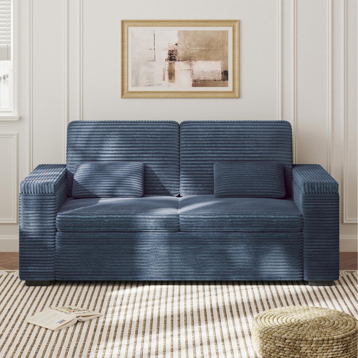 Corduroy 2 Seater Sofa with Storage Armrests - Blue