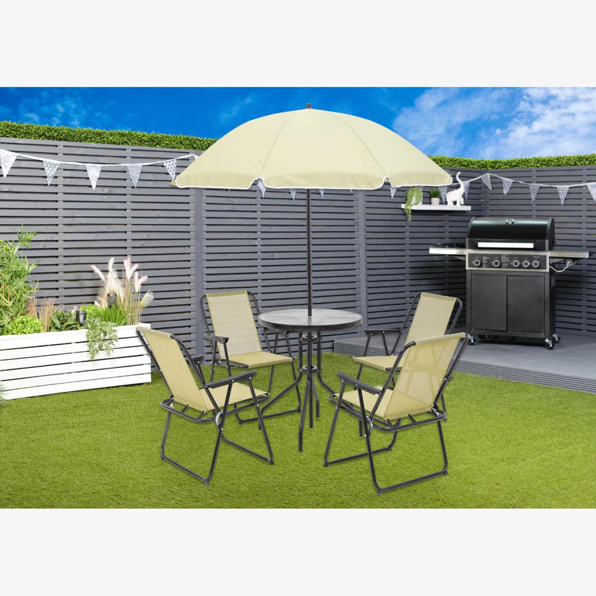 Bring style and comfort to your garden with this gorgeous Corfu 6 Piece Dining Set. Featuring four folding chairs, a thick glass-topped round table, and a matching parasol, each piece is made with a powder-coated metal frame for reliable durability and weather resistance all year round. The seats are covered in hard-wearing textilene fabric for maximum comfort, breathability, and low maintenance. Each piece of this dining set is made to be foldable, ensuring you can easily take everything out and store it all away whenever necessary.